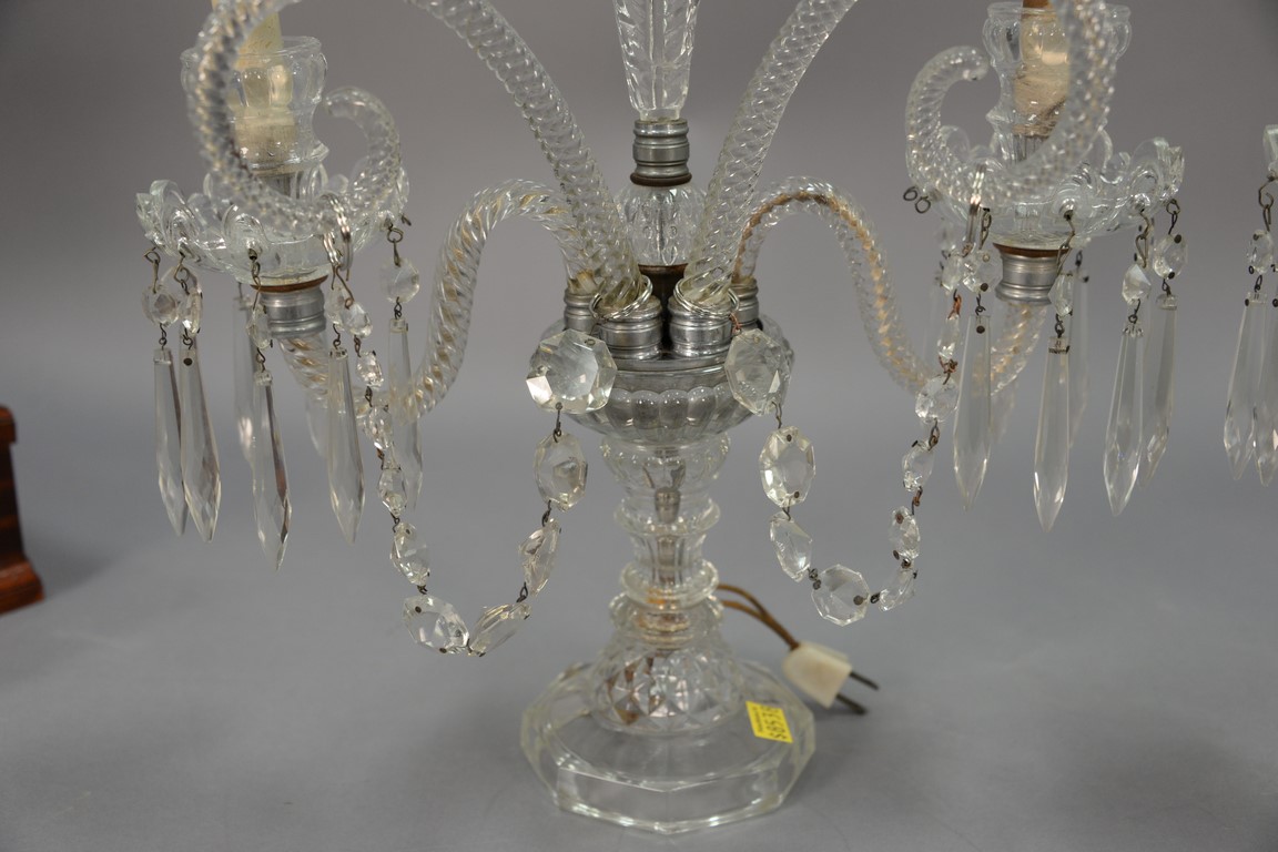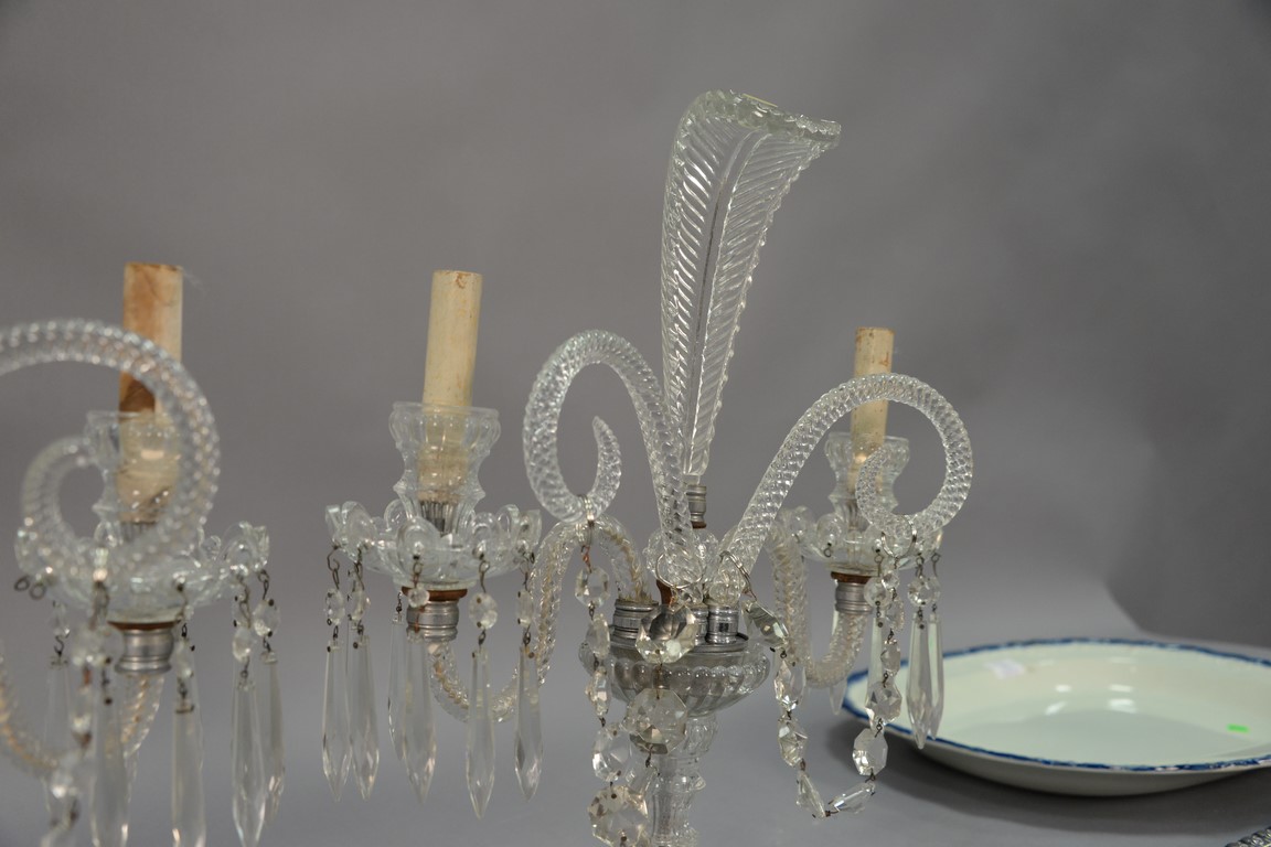 Lot 143: Pair of crystal candelabras having two lights and feather finial, electrified. ht. 17 1/2in., wd. 14in.
