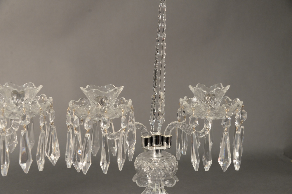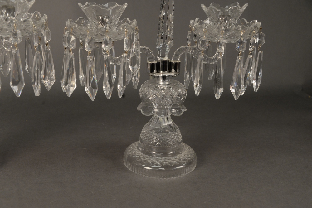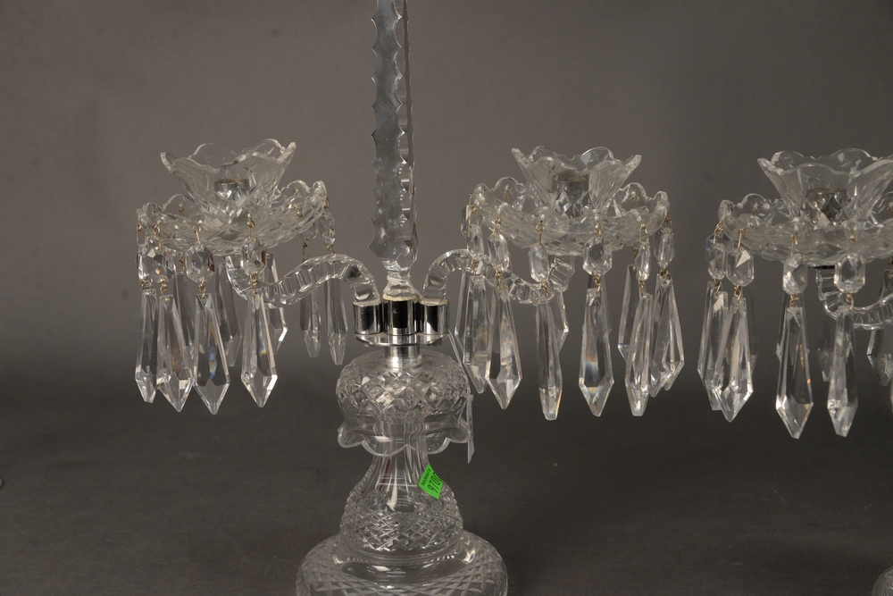 Lot 143: Pair of Signed Waterford Crystal Candelabra, having prisms, 19 inches, width 13 inches. Provenance: Estate of James Wadhams.