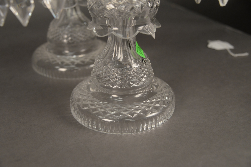 Pair of Signed Waterford Crystal Candelabra, having prisms, 19 inches, width 13 inches. Provenance: Estate of James Wadhams.