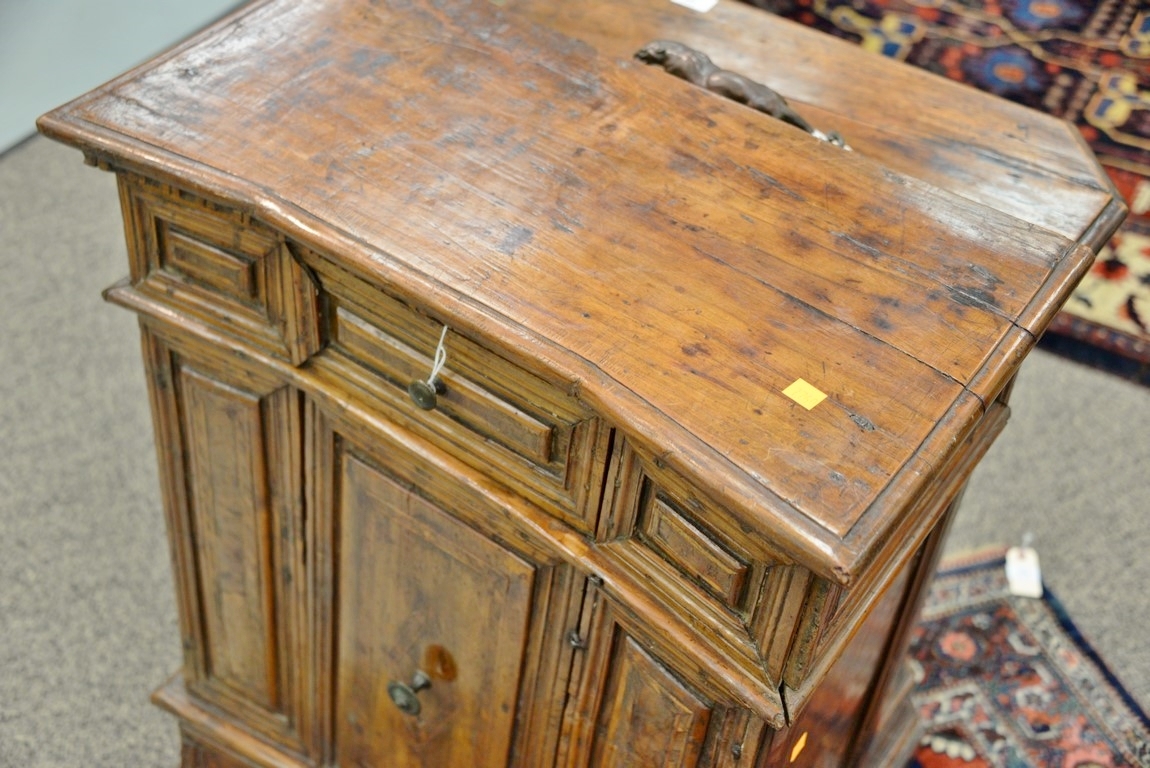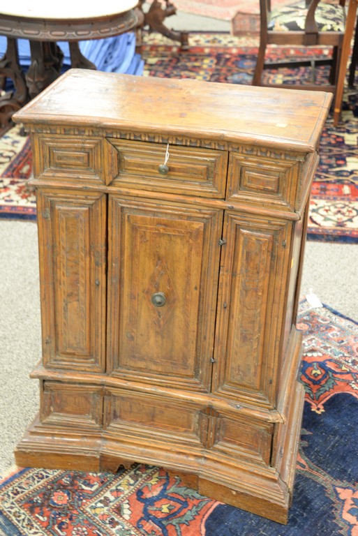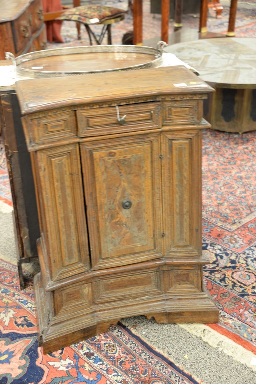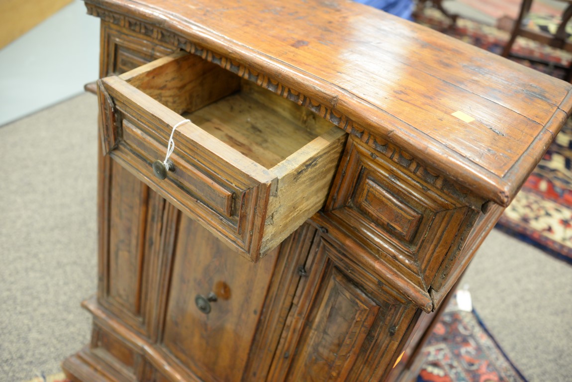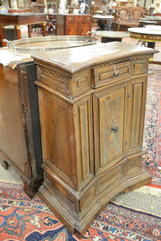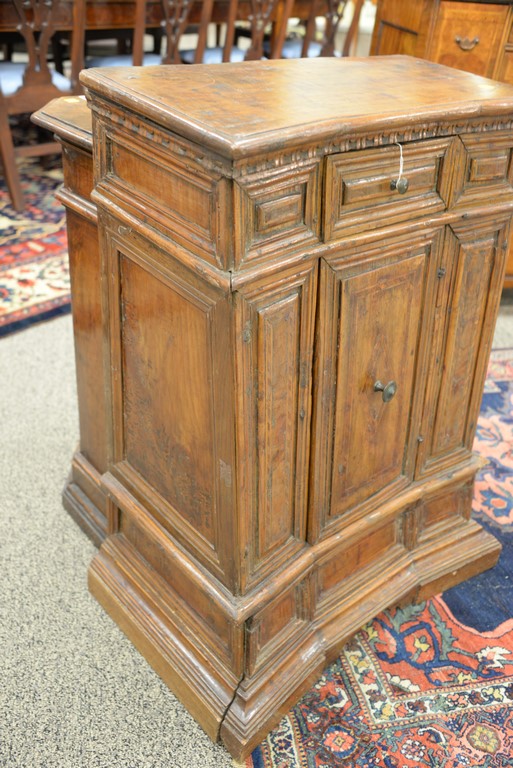 Pair of walnut side cabinets having shaped tops over conforming cabinets with one small drawer over one door over bottom pull out base to reveal covered drawer, German or North Italian. ht. 36 1/2 in. case wd. 24 in. dp. 18 in. Provenance: The Estate of Natalie Rafferty