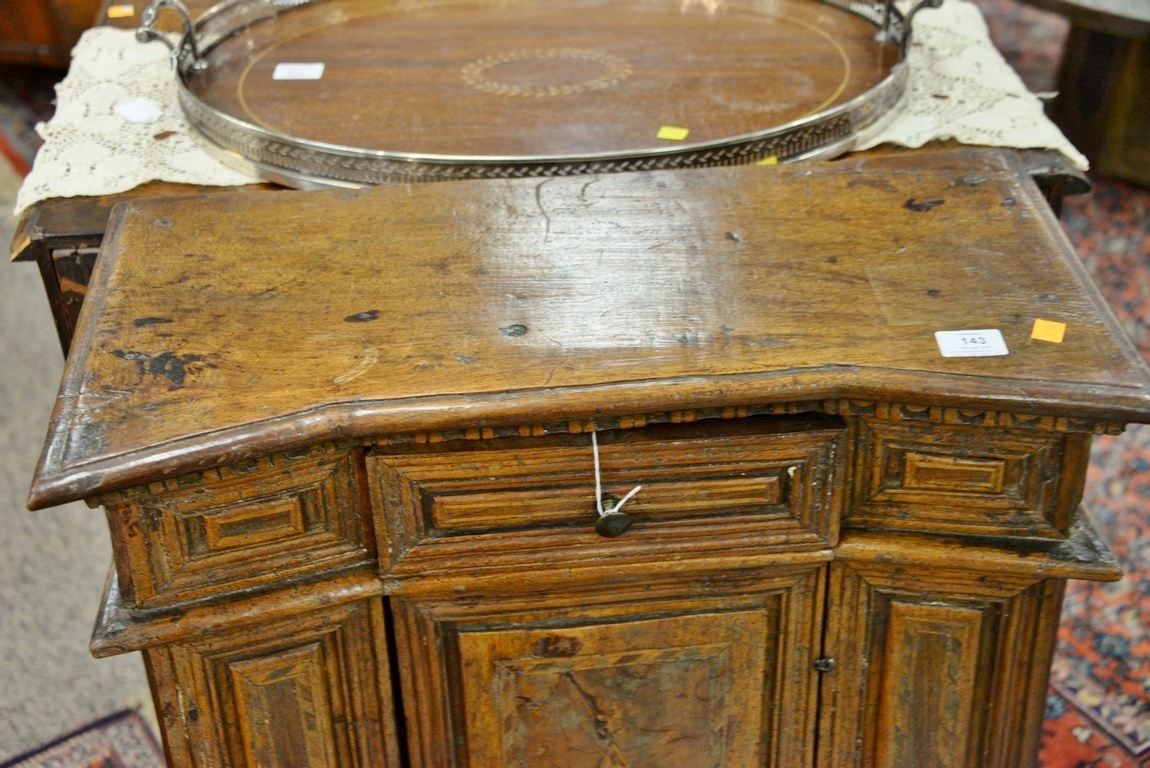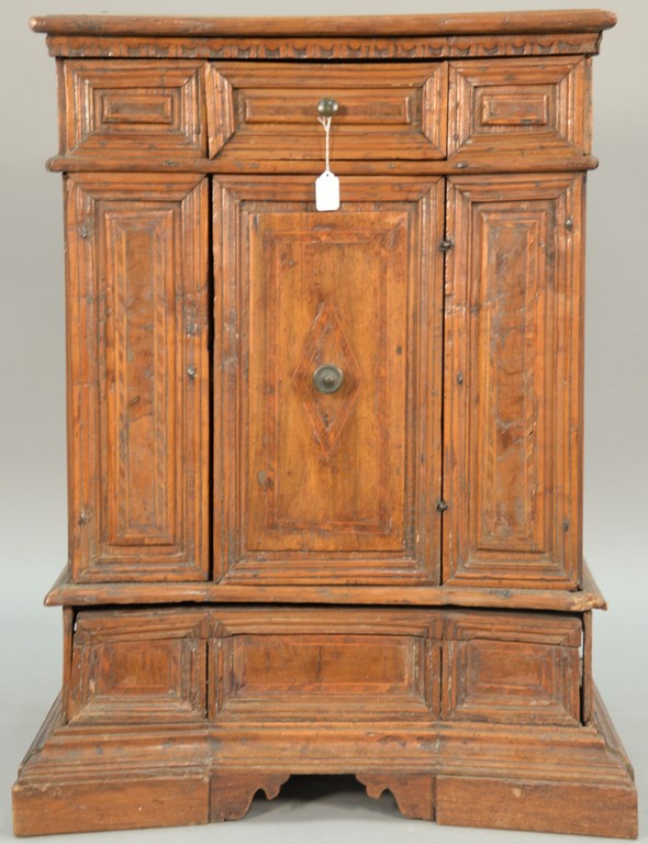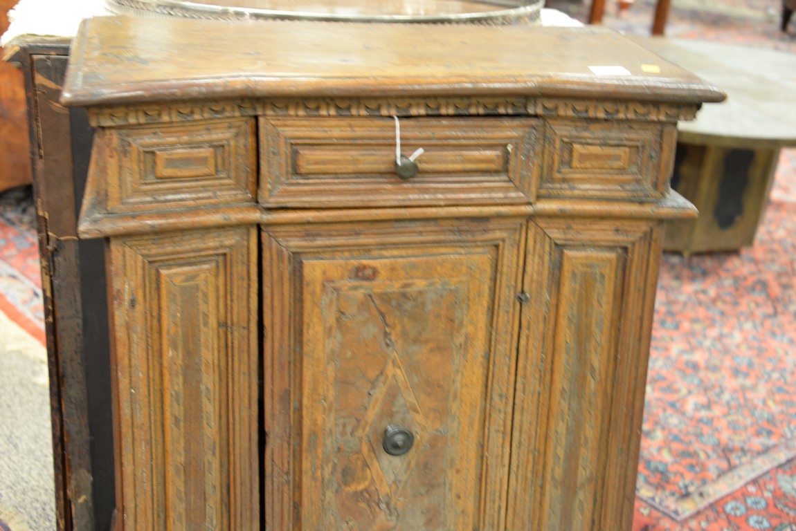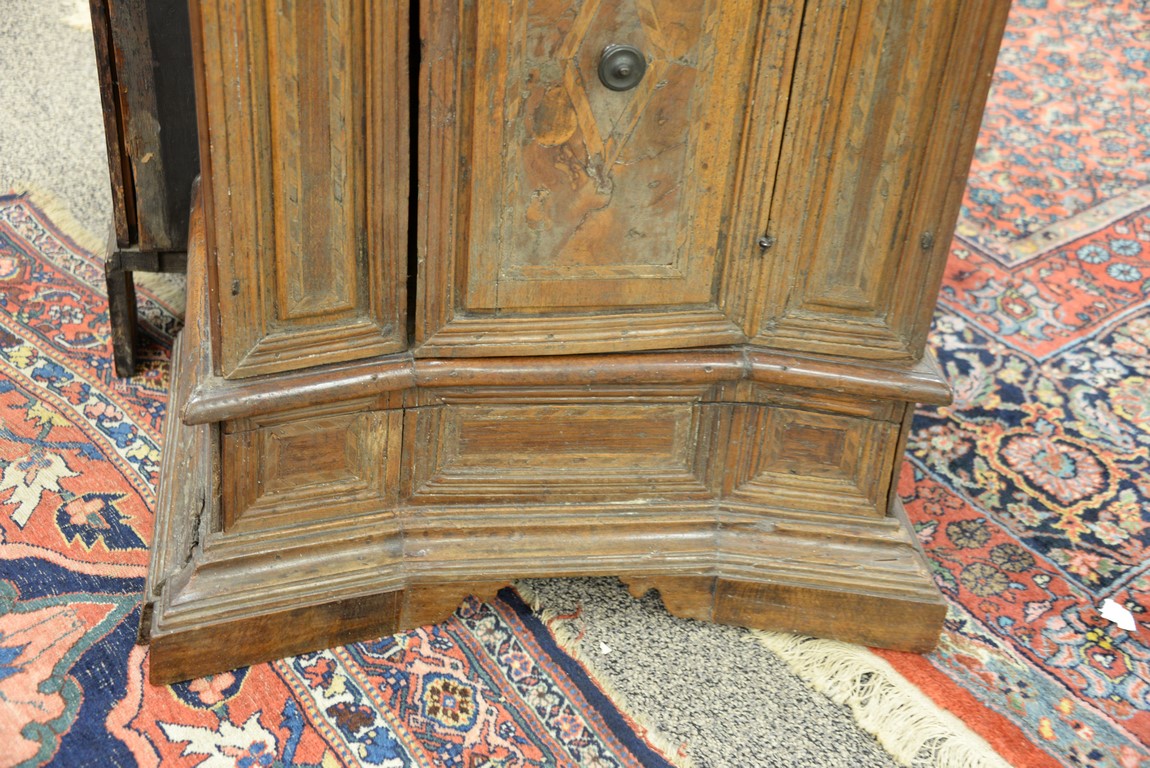 Pair of walnut side cabinets having shaped tops over conforming cabinets with one small drawer over one door over bottom pull out base to reveal covered drawer, German or North Italian. ht. 36 1/2 in. case wd. 24 in. dp. 18 in. Provenance: The Estate of Natalie Rafferty