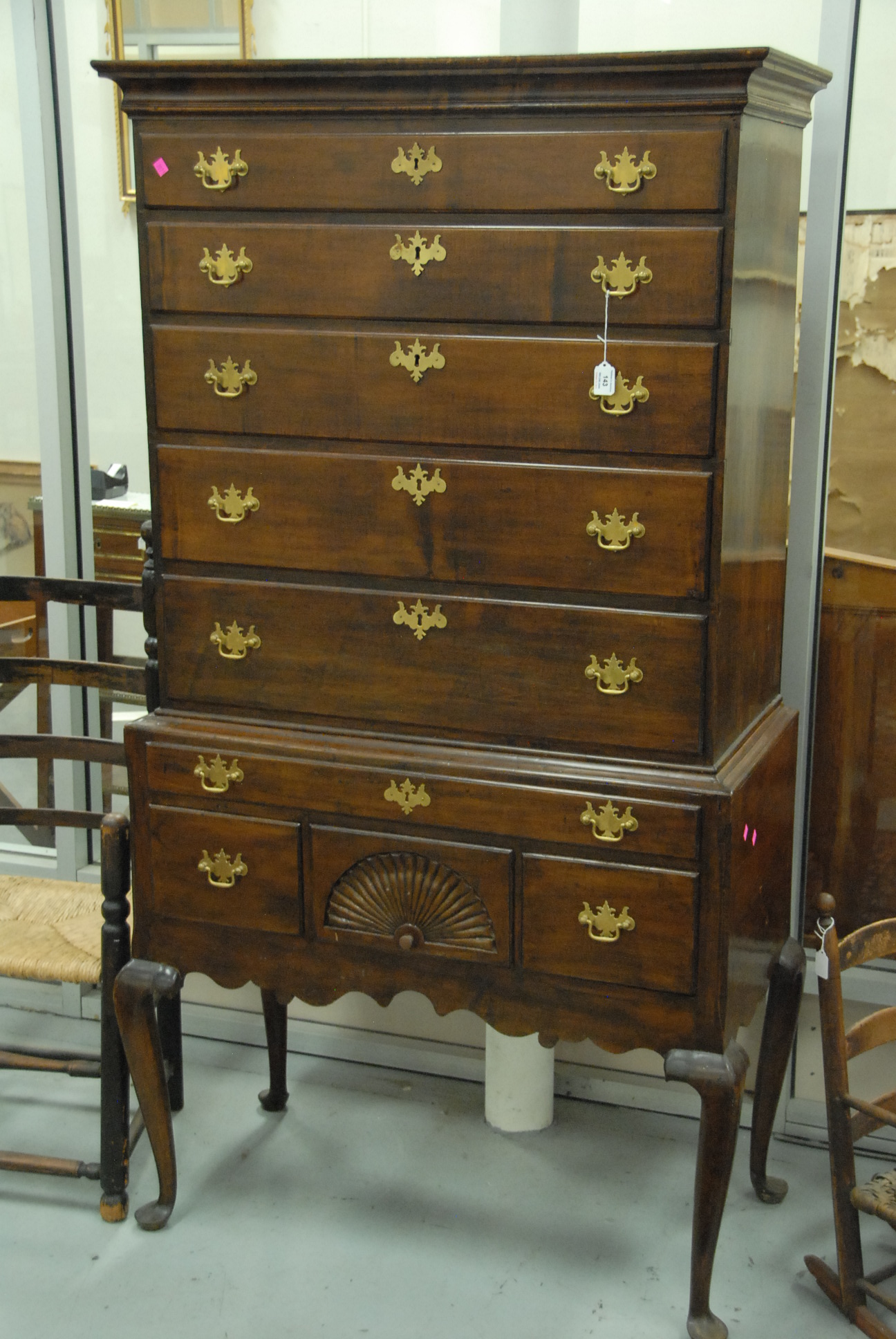Queen Anne high chest in two parts, upper section with five graduated drawers on lower section with one long drawer over three short drawers, center drawer with fan carving. upper case wd. 35in., ht. 6′ 1
