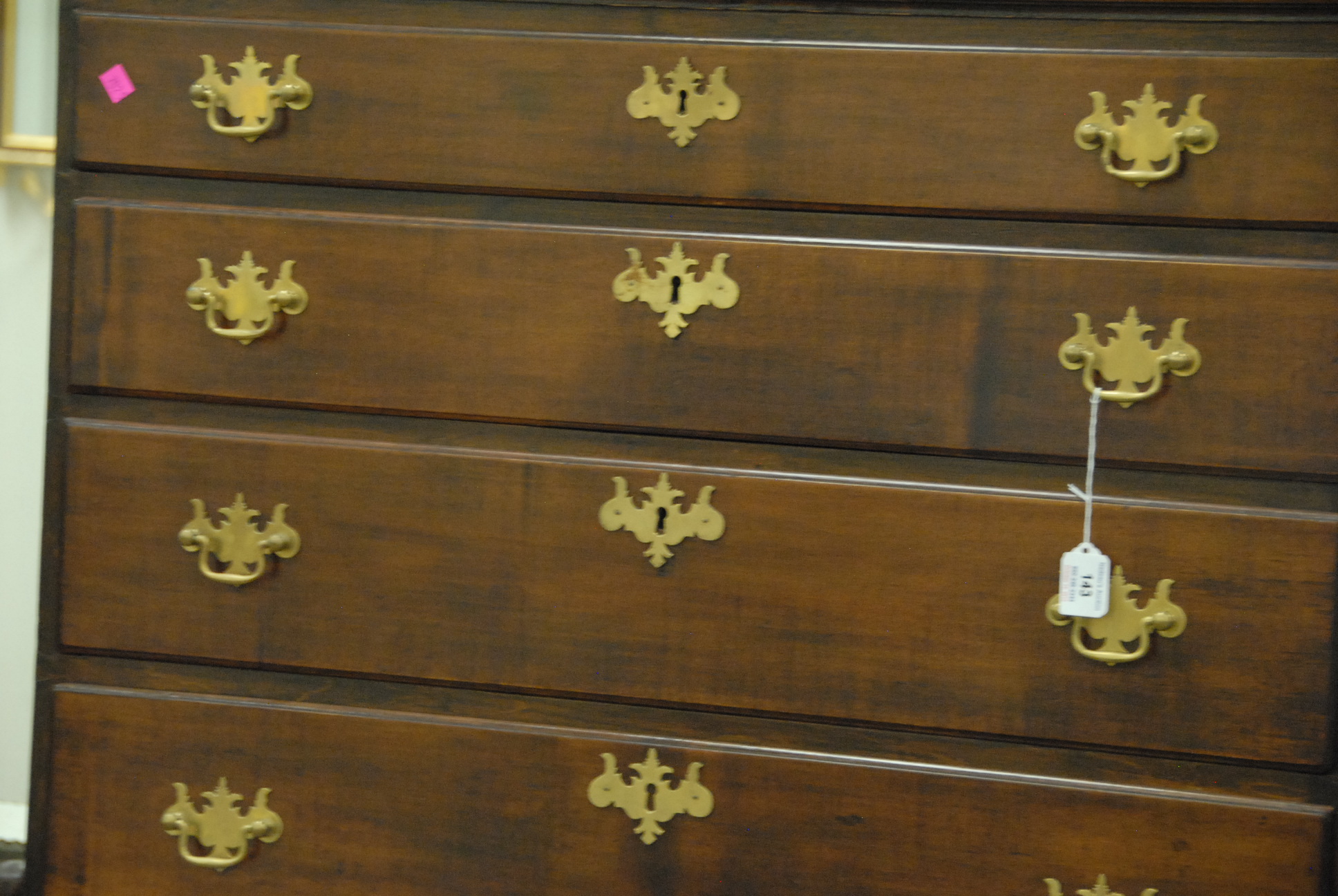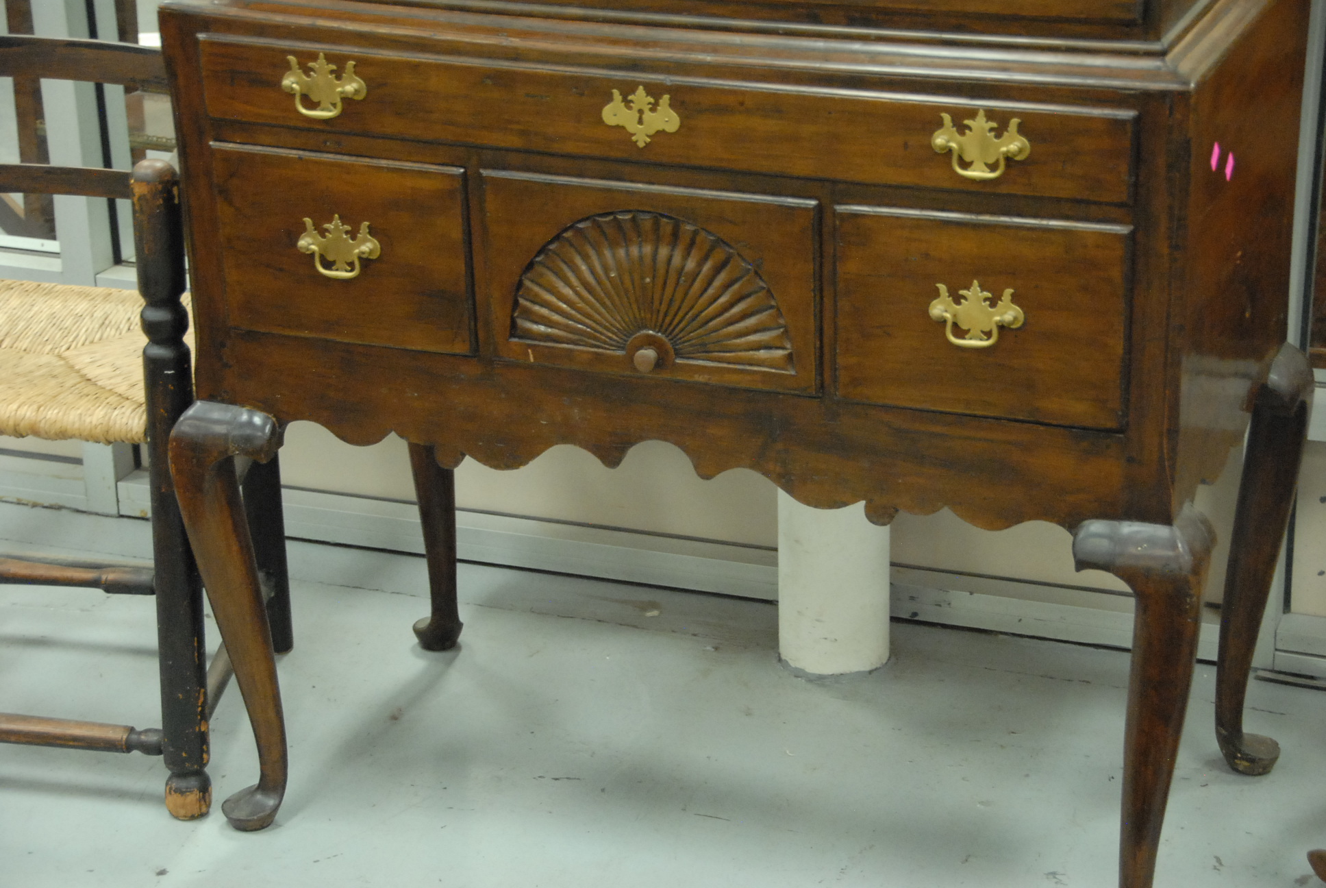 Lot 143: Queen Anne high chest in two parts, upper section with five graduated drawers on lower section with one long drawer over three short drawers, center drawer with fan carving. upper case wd. 35in., ht. 6′ 1