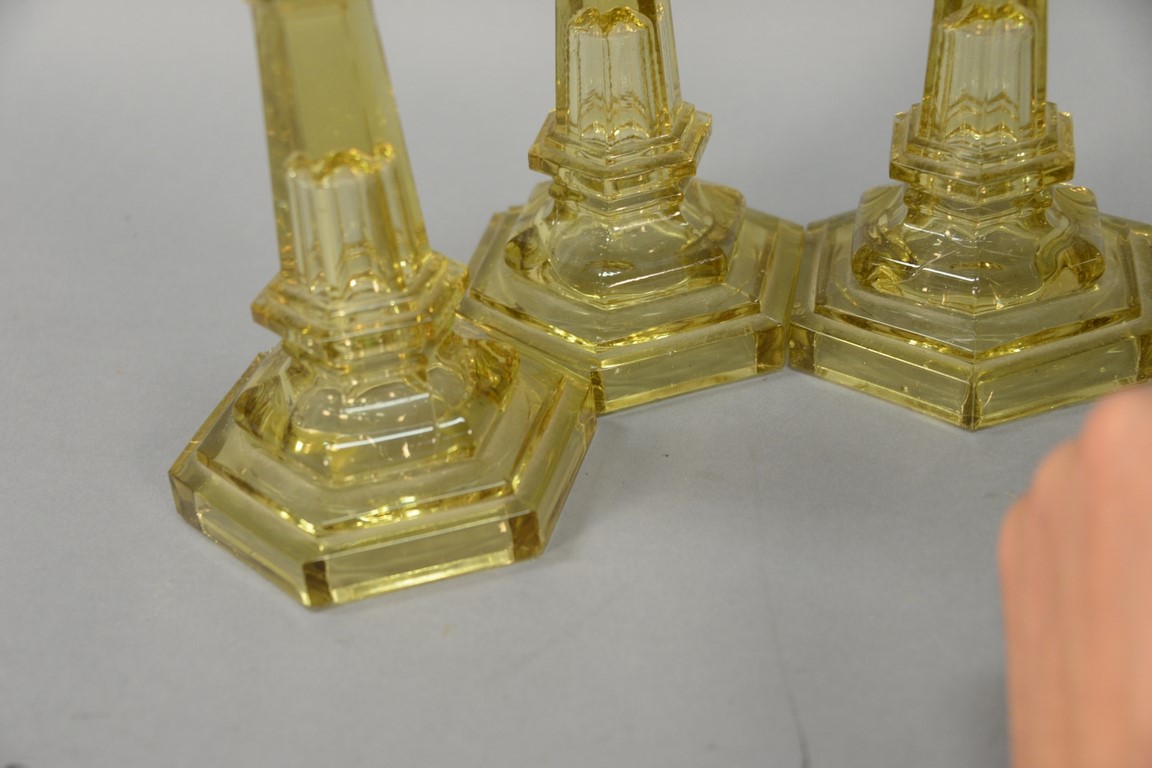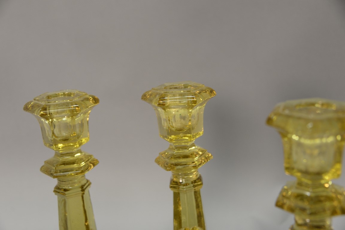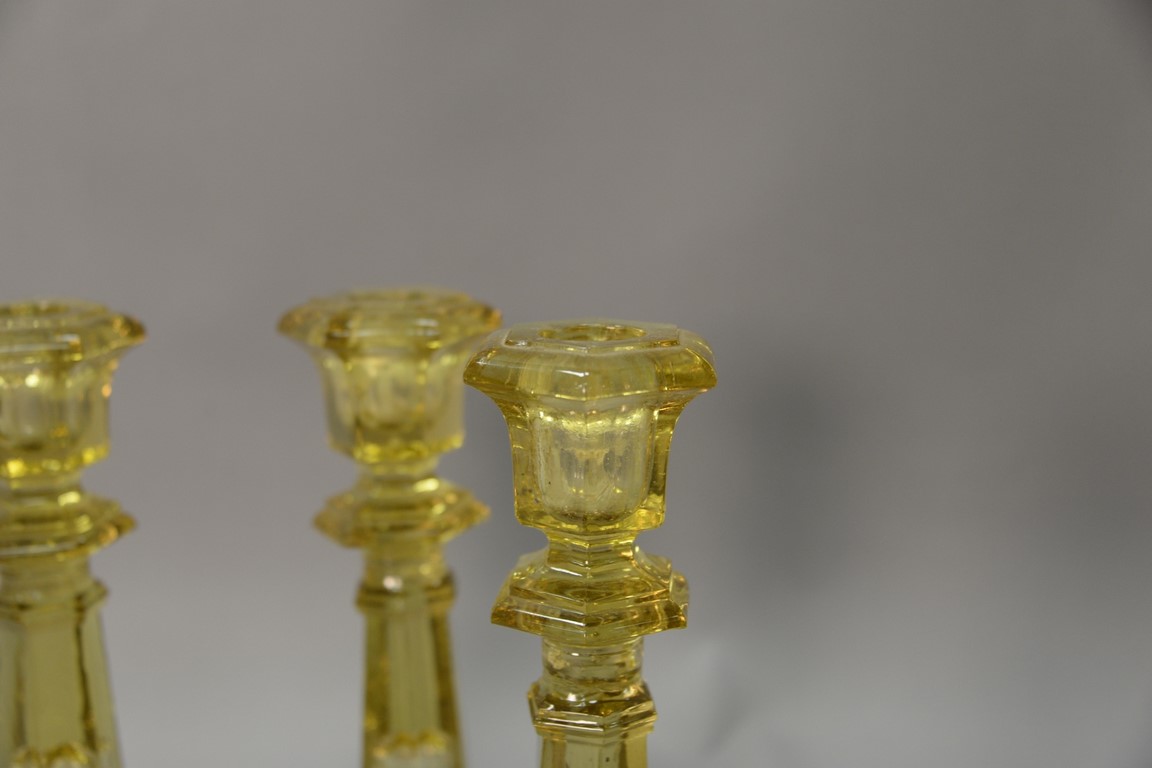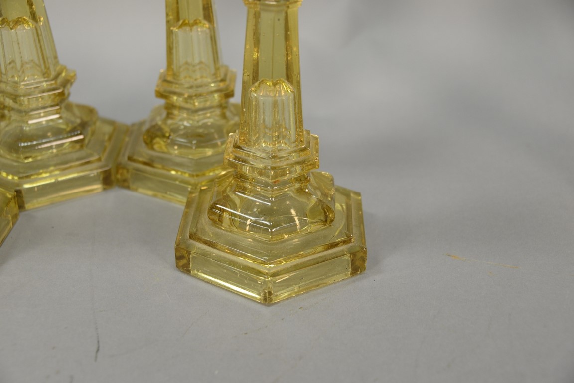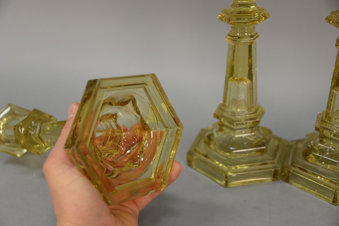 Set of four sandwich glass candlesticks, amber color, six sided. ht. 10in.