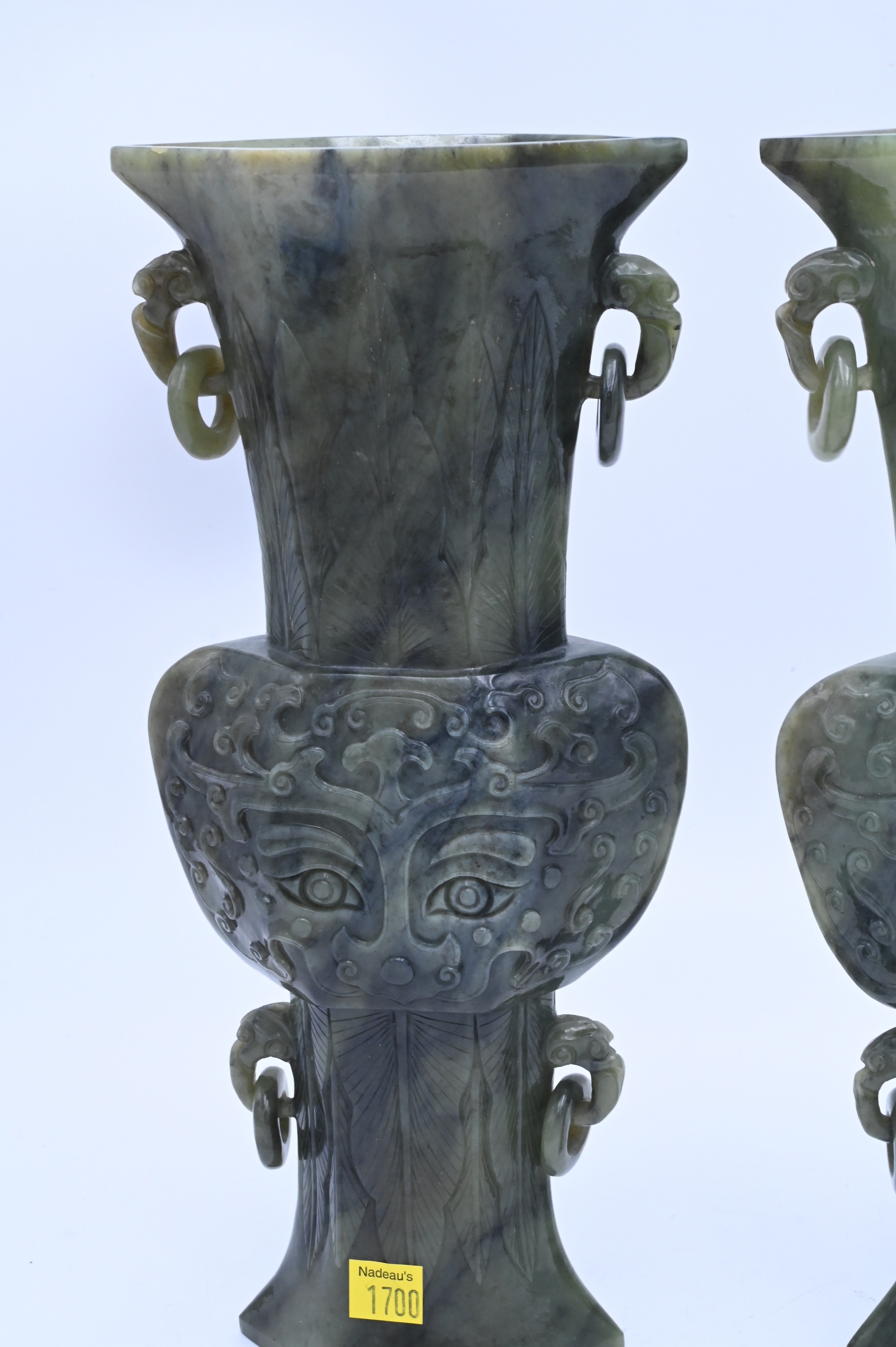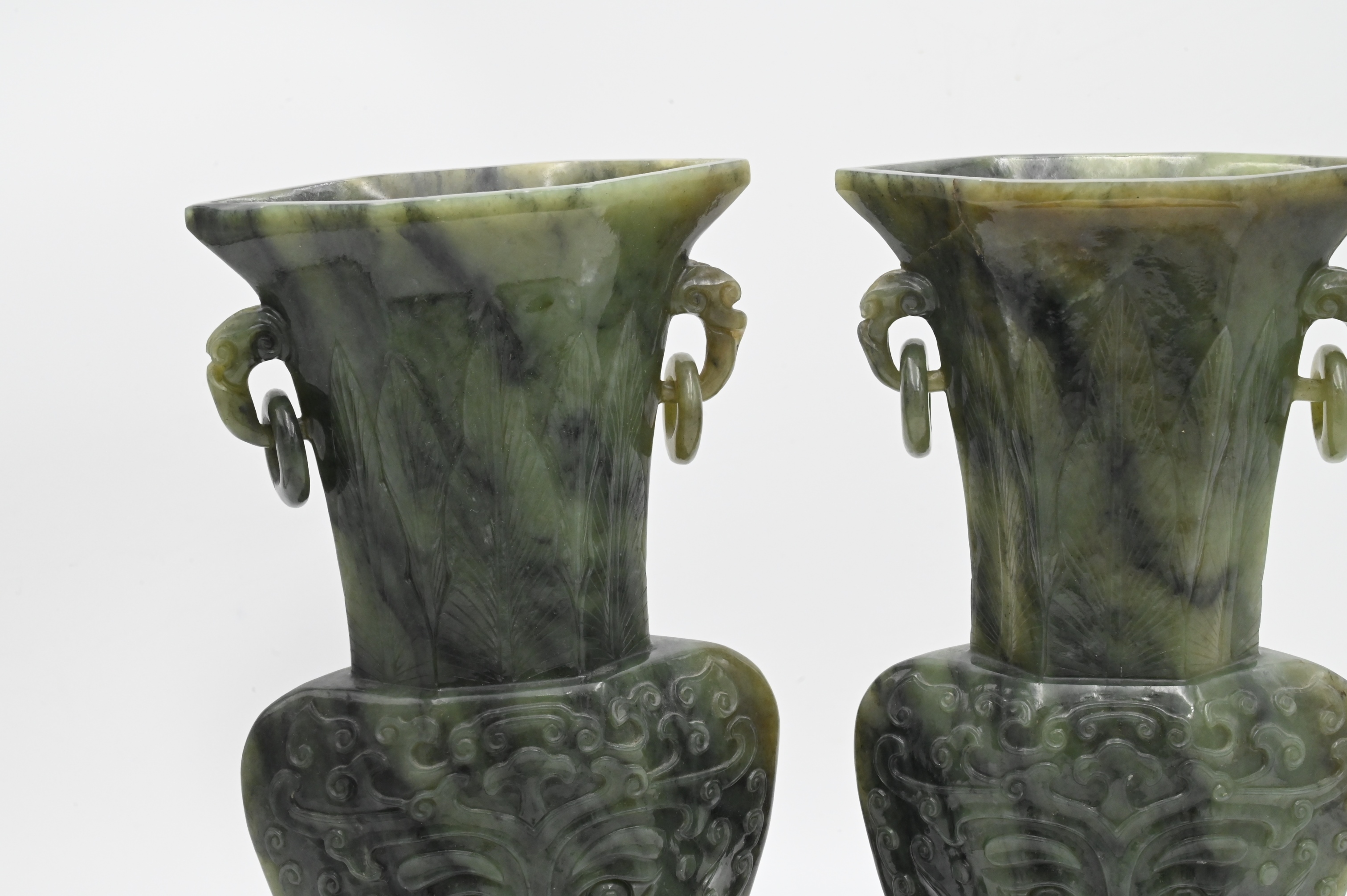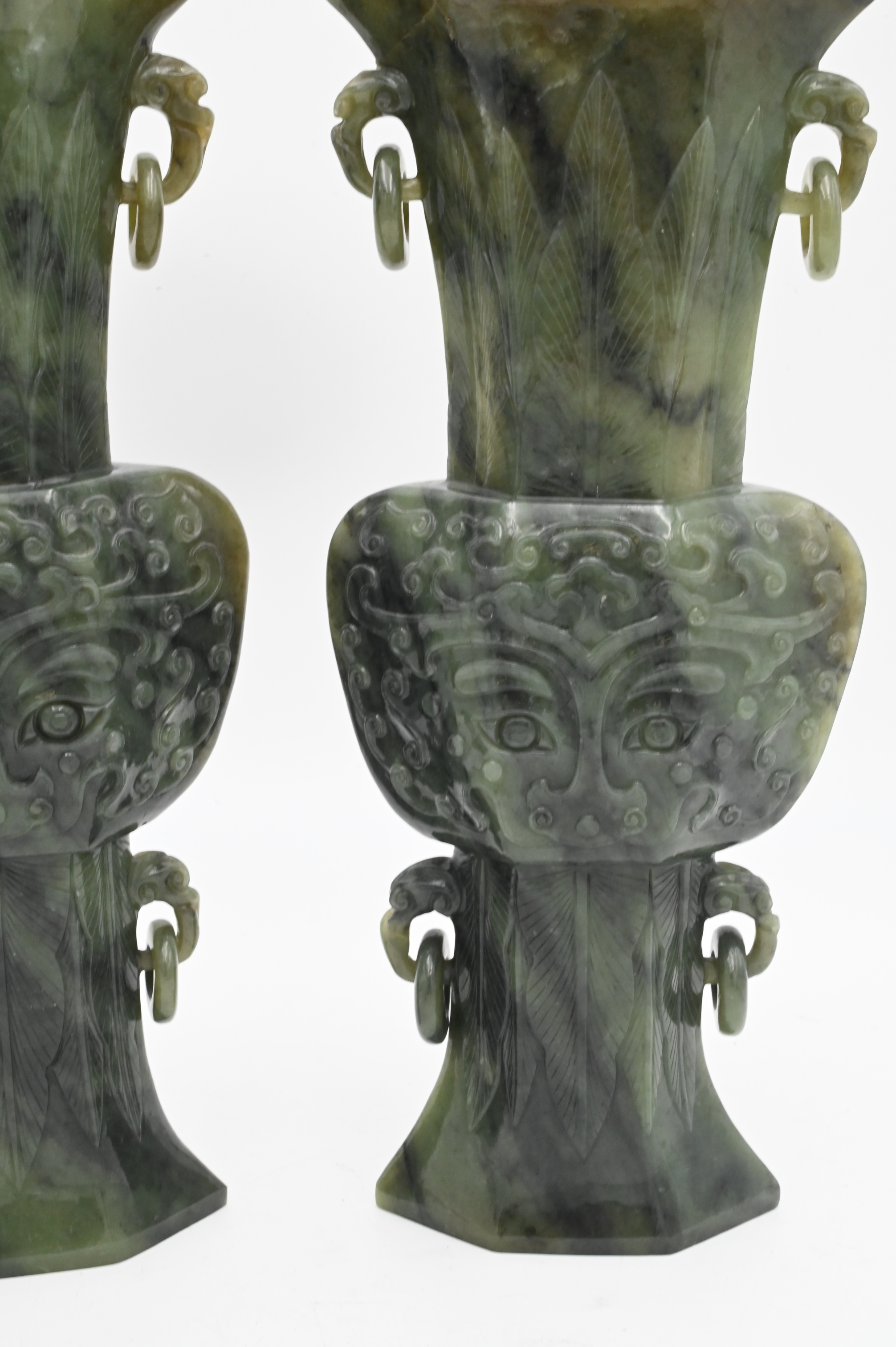 pair of jade vessels with ring handles. Ralph Chait Galleries label on bottoms