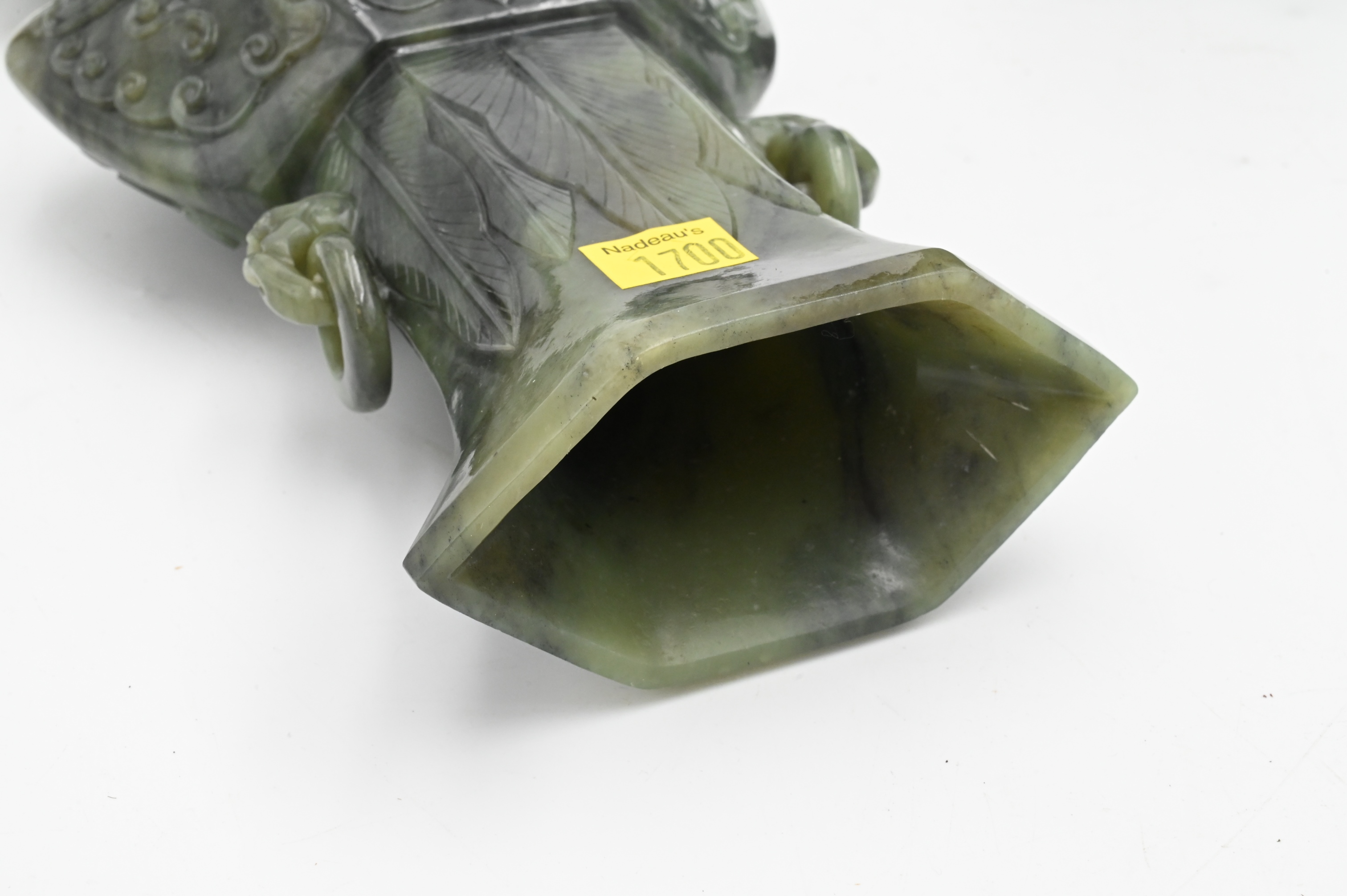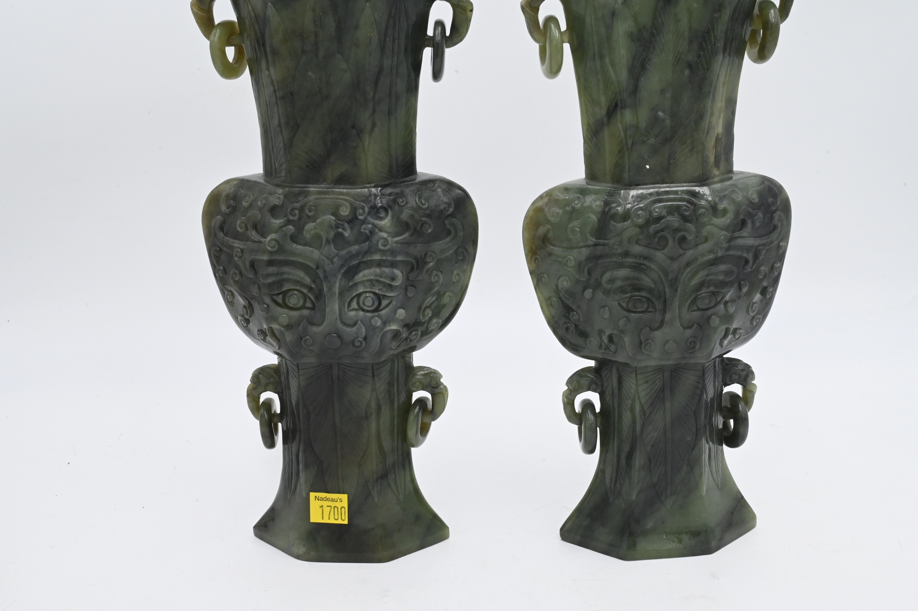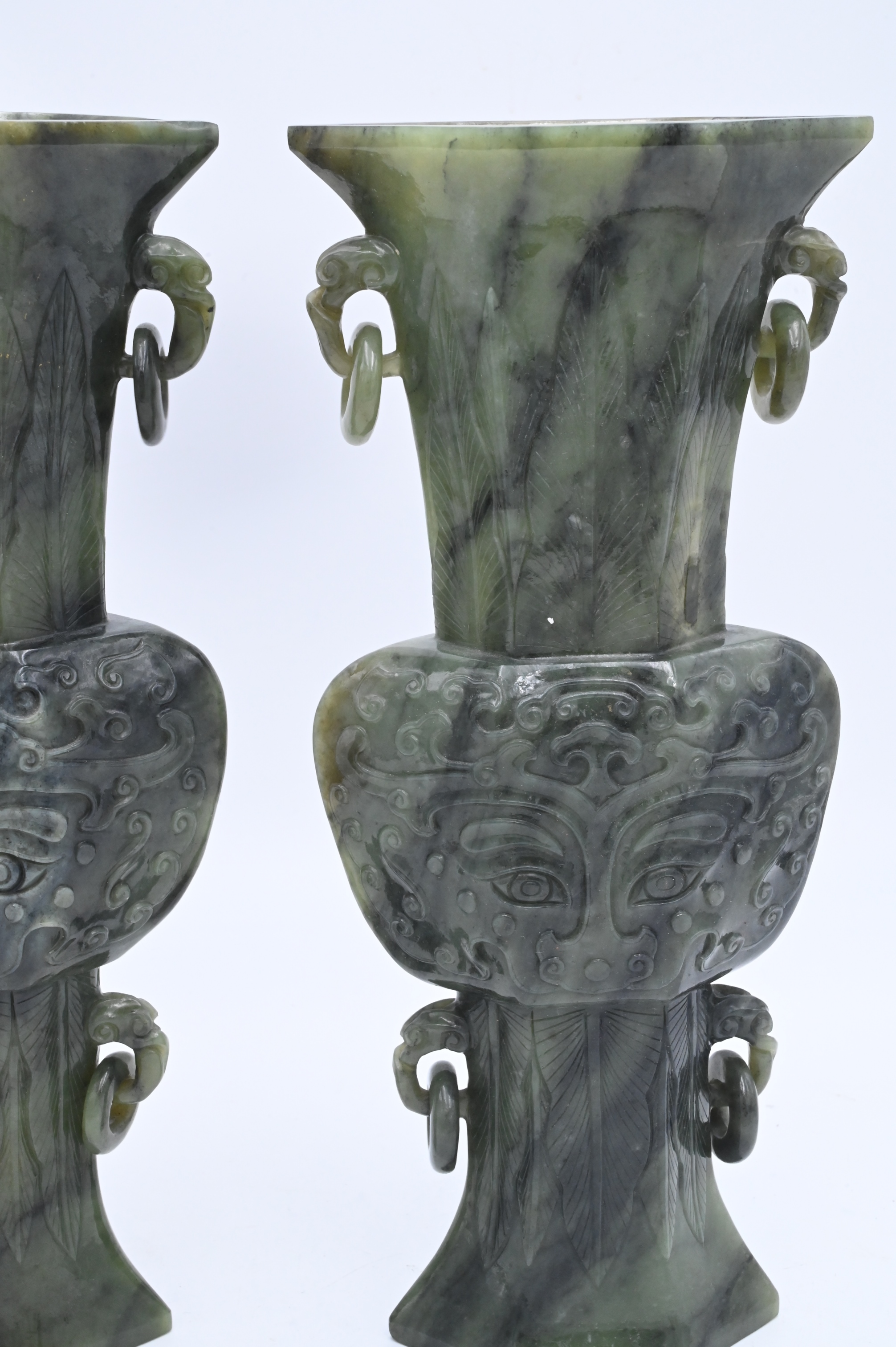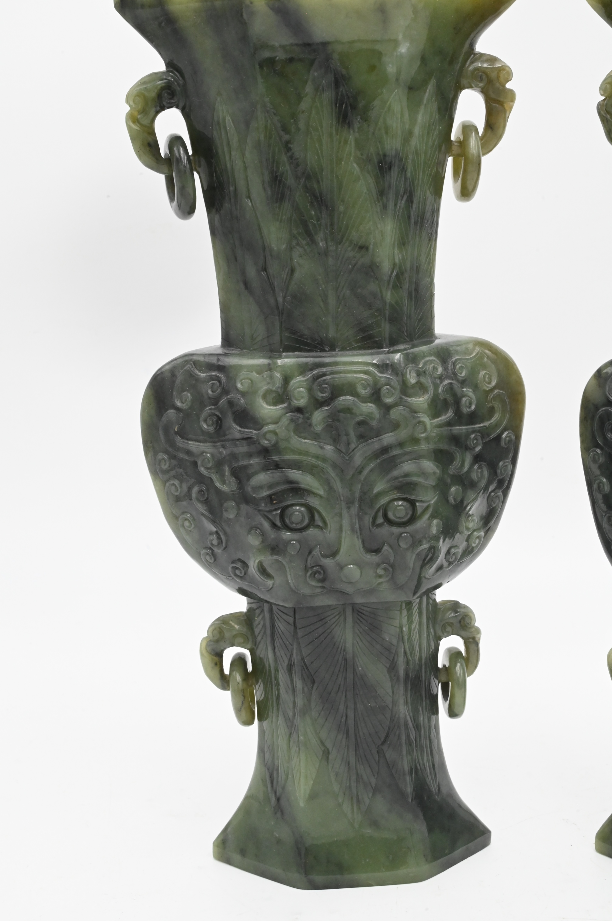 pair of jade vessels with ring handles. Ralph Chait Galleries label on bottoms