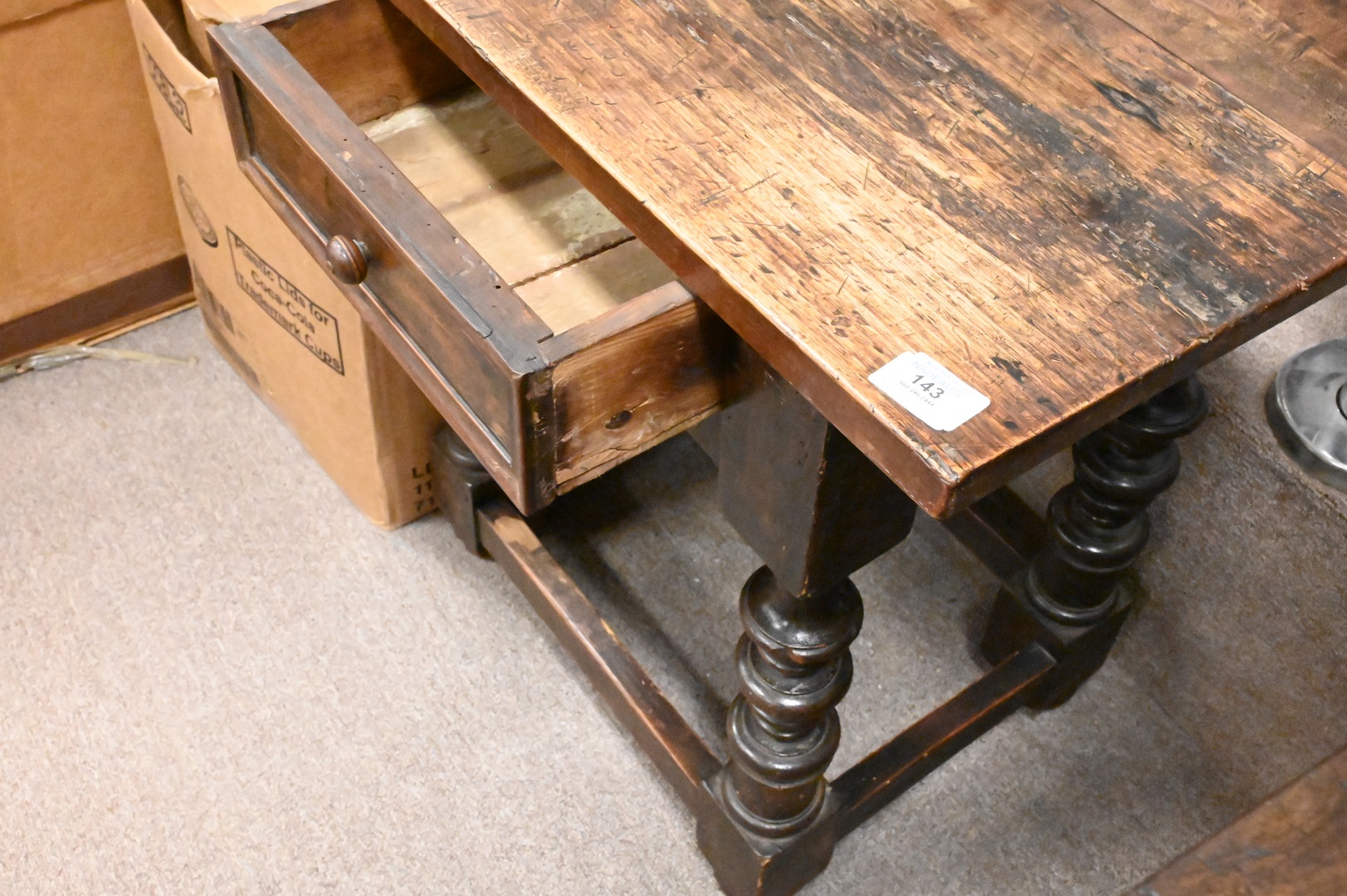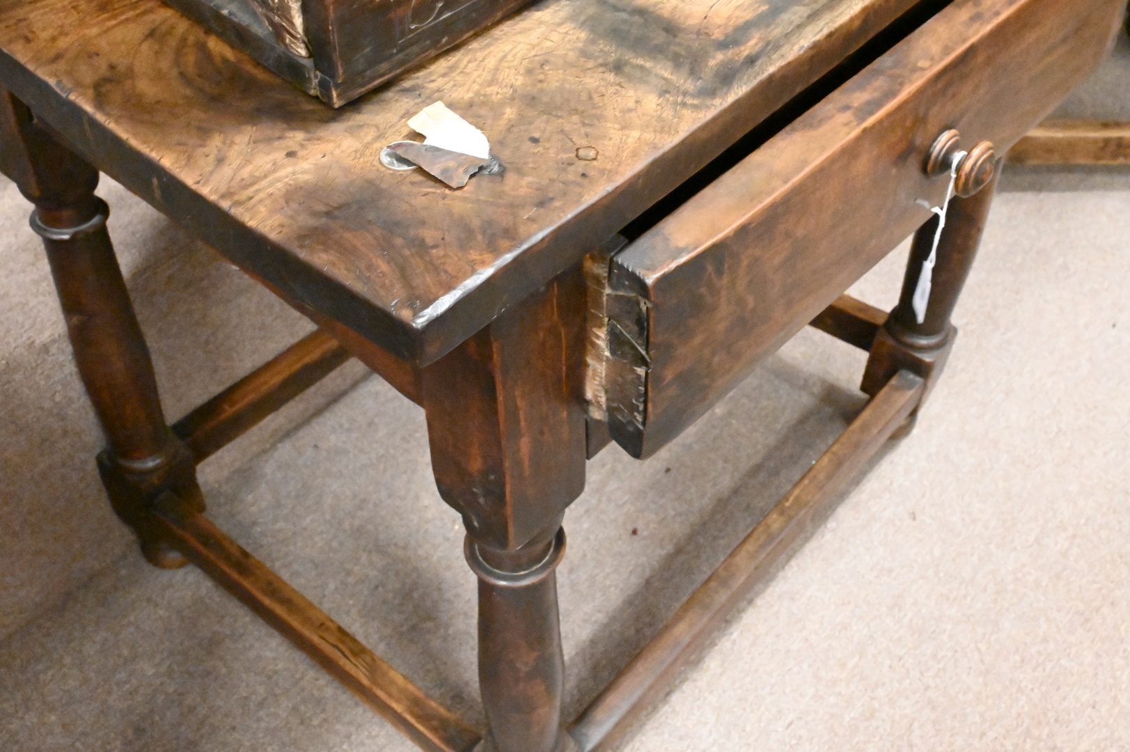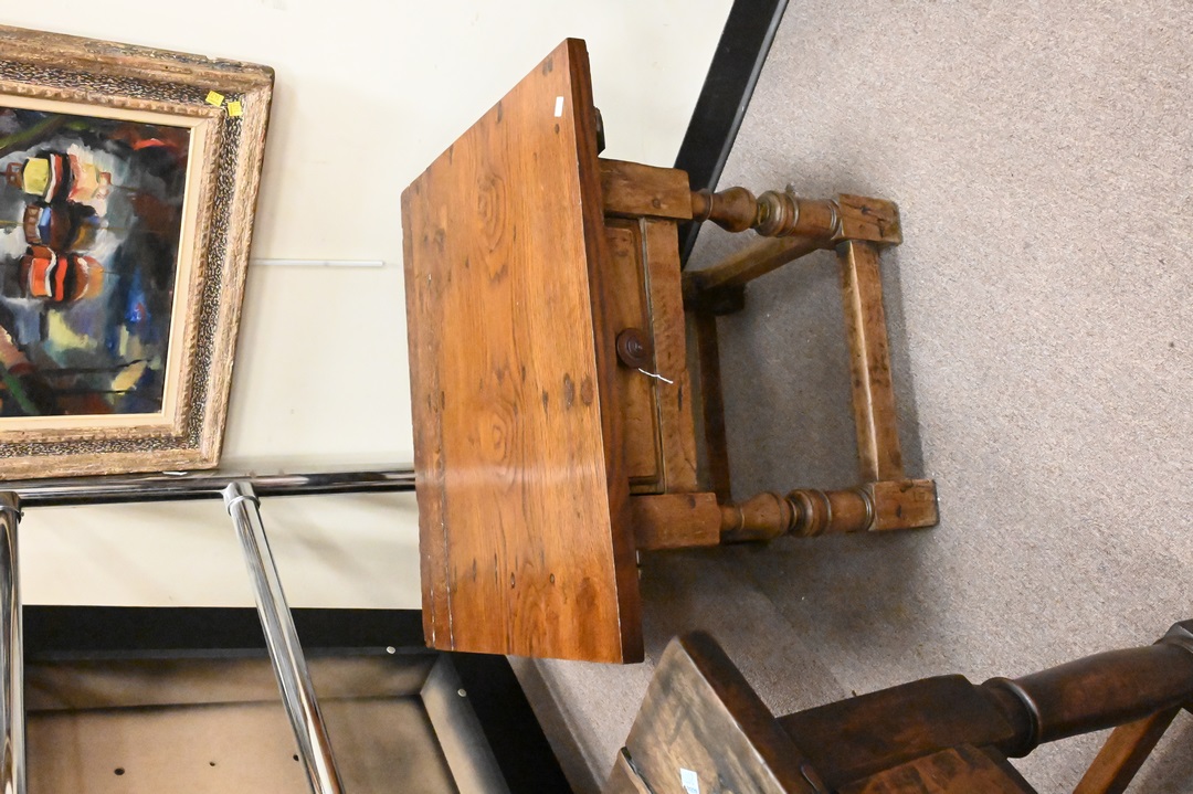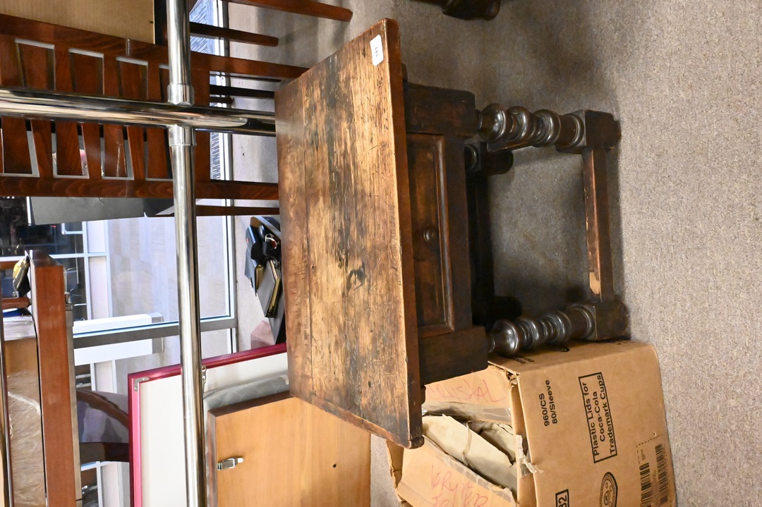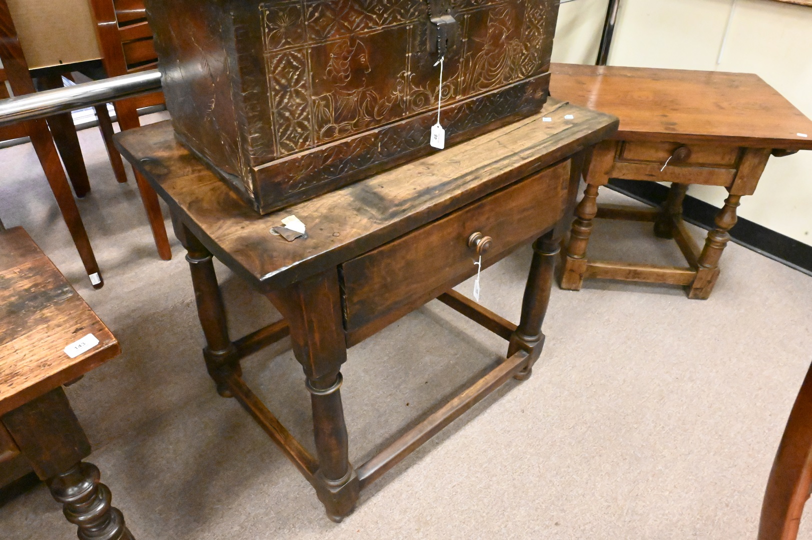 Three Piece Continental Lot, to include two Continental tables, each with tilting top, one drawer on turned legs, 17th century, restored, height of one is 24 inches, height of other is 25 1/2 inches, tops are 16 1/2″ x 25 1/4″ and 21 1/4″ x 28 1/2″; along with a Continental work table, having slab top along with one drawer, on turned legs, boxed stretchers, height 30 inches, top 22 1/2″ x 33 1/2″.