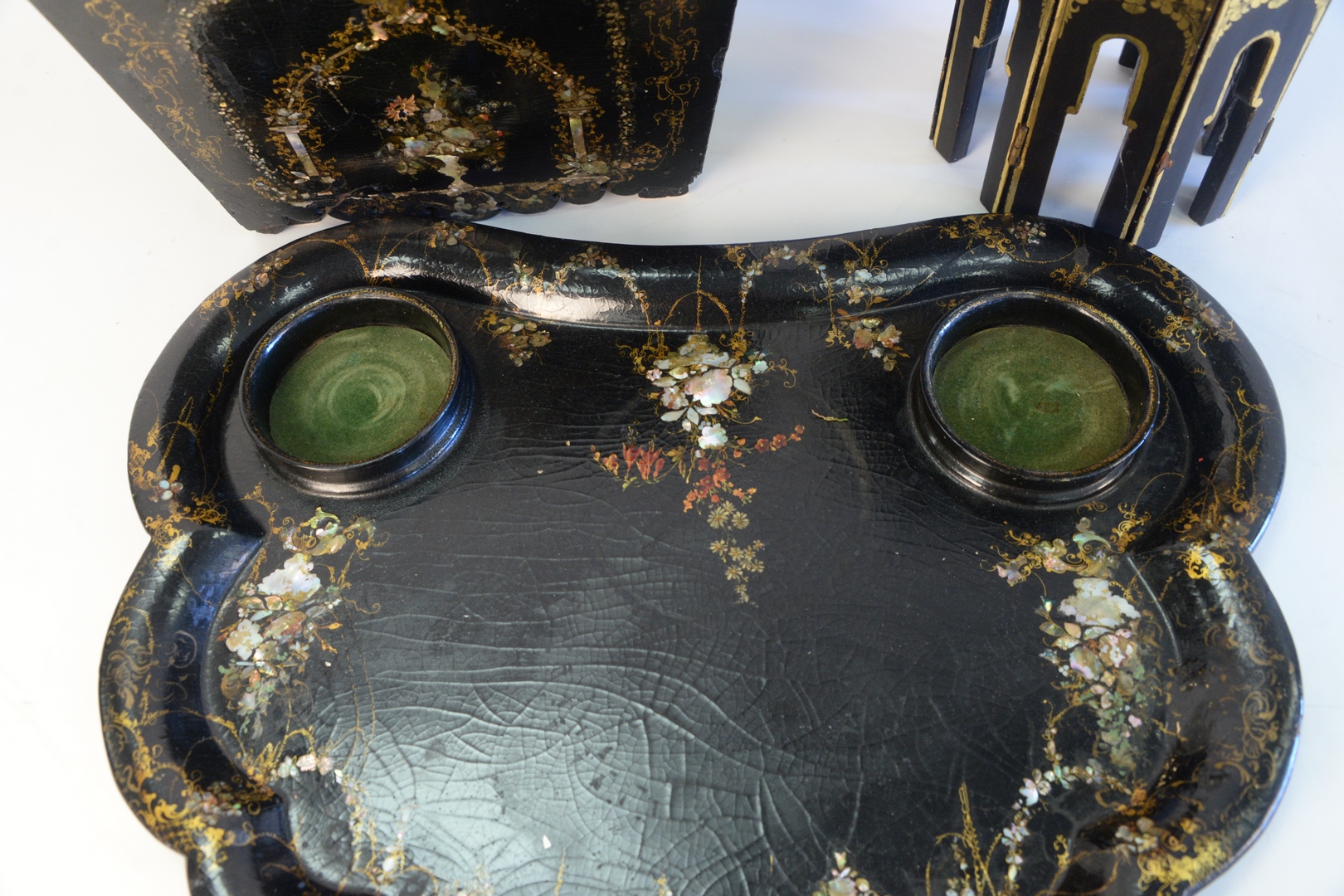 Three Piece Lot to include, papier mache tray, having black lacquer, mother of pearl, and gilt decoration, length 24 inches a small, black lacquer stand along with a box with missing cover and mother of pearl inlay.