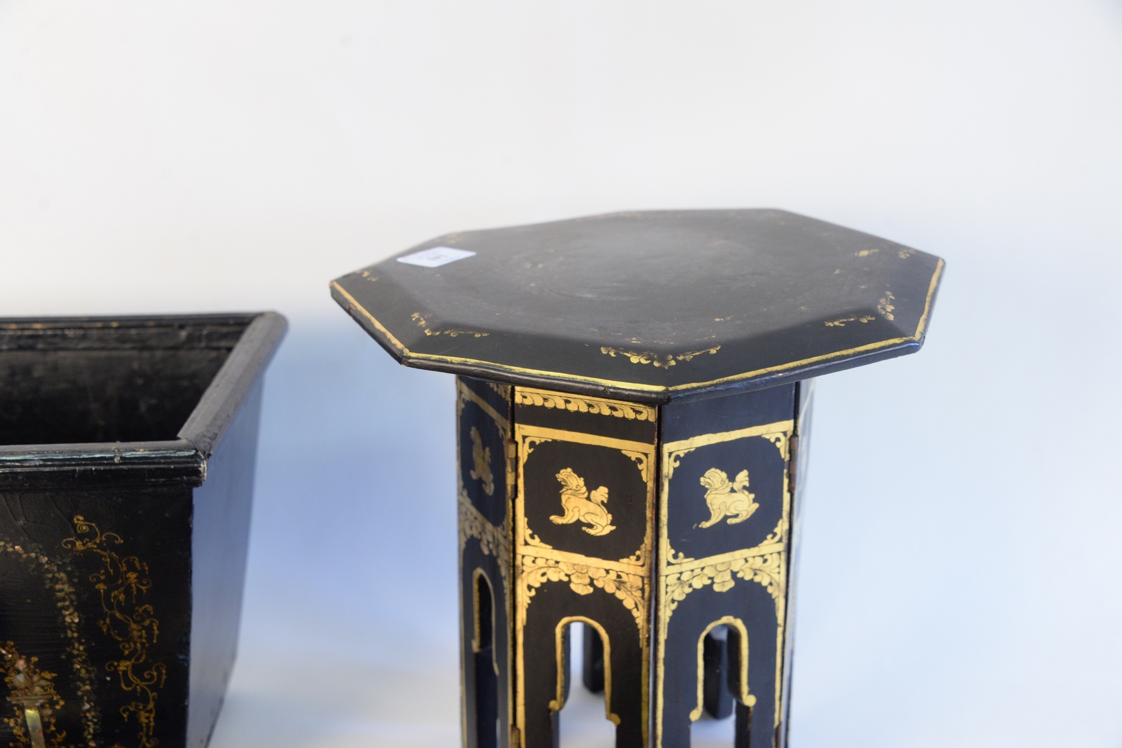 Lot 143: Three Piece Lot to include, papier mache tray, having black lacquer, mother of pearl, and gilt decoration, length 24 inches a small…