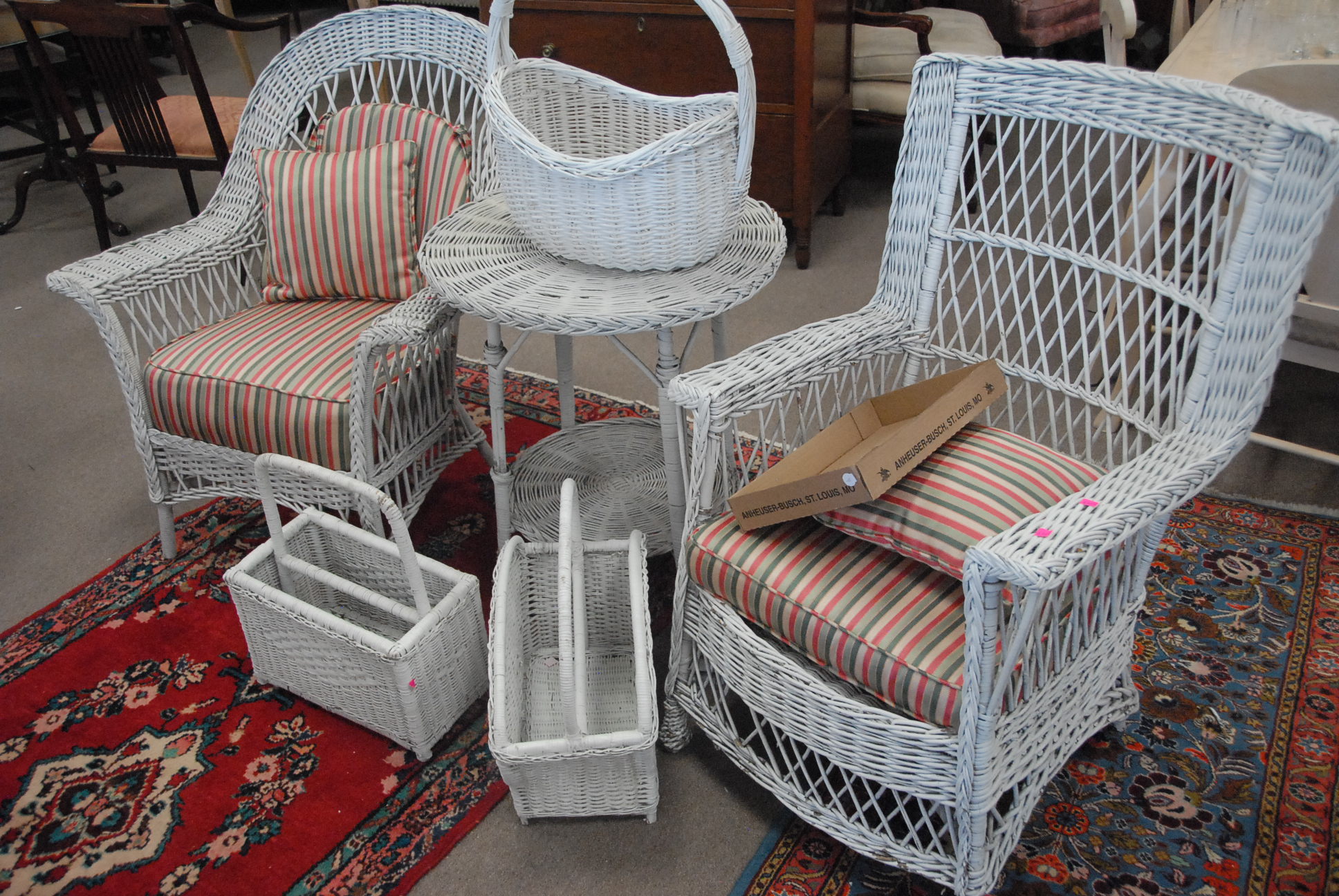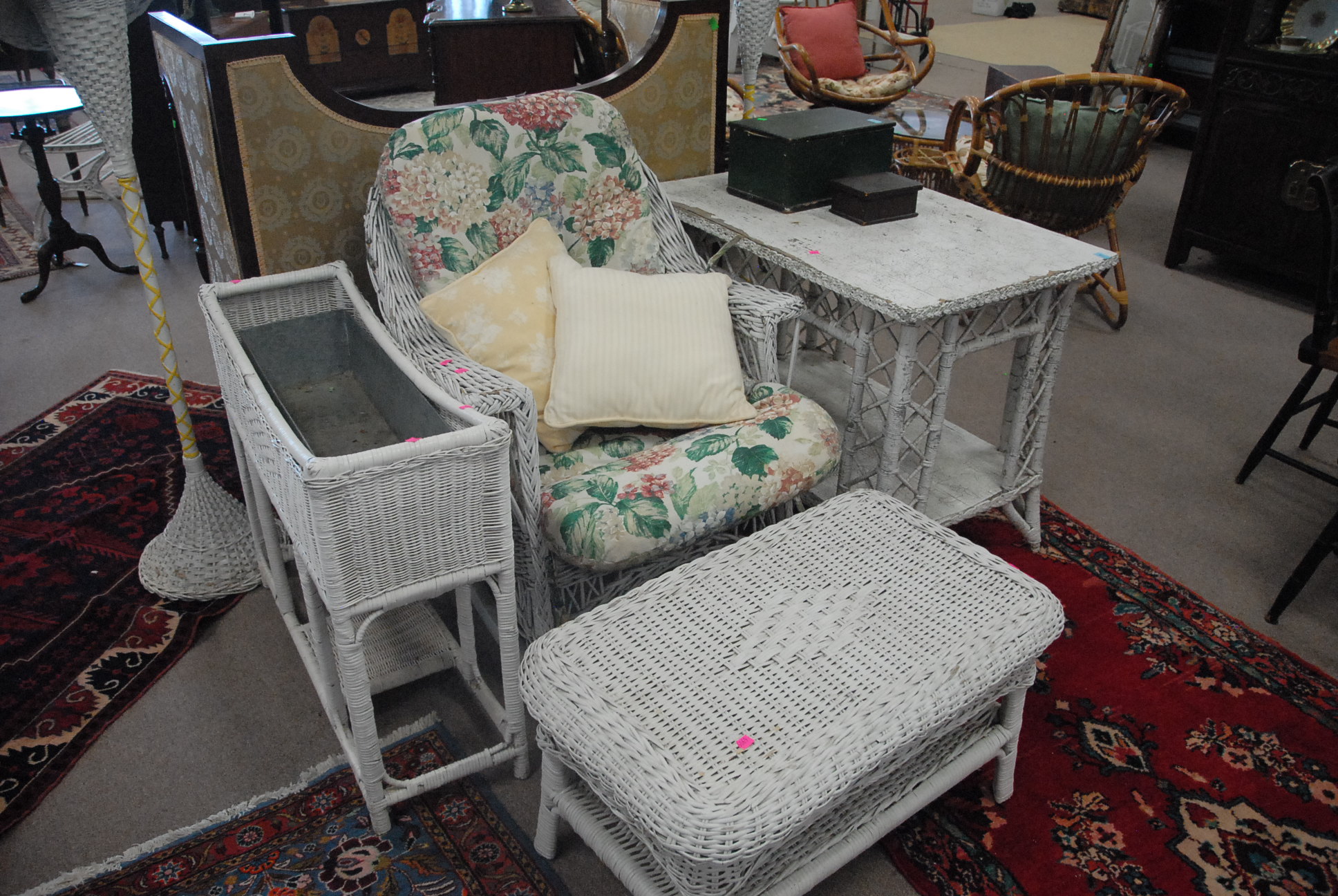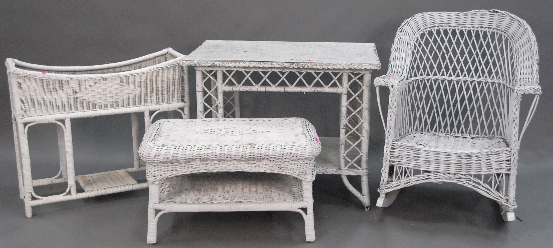 Twelve piece wicker lot to include planter, two magazine racks, basket, and two fern stands, two armchairs, rocker, two tables, and coffee table.