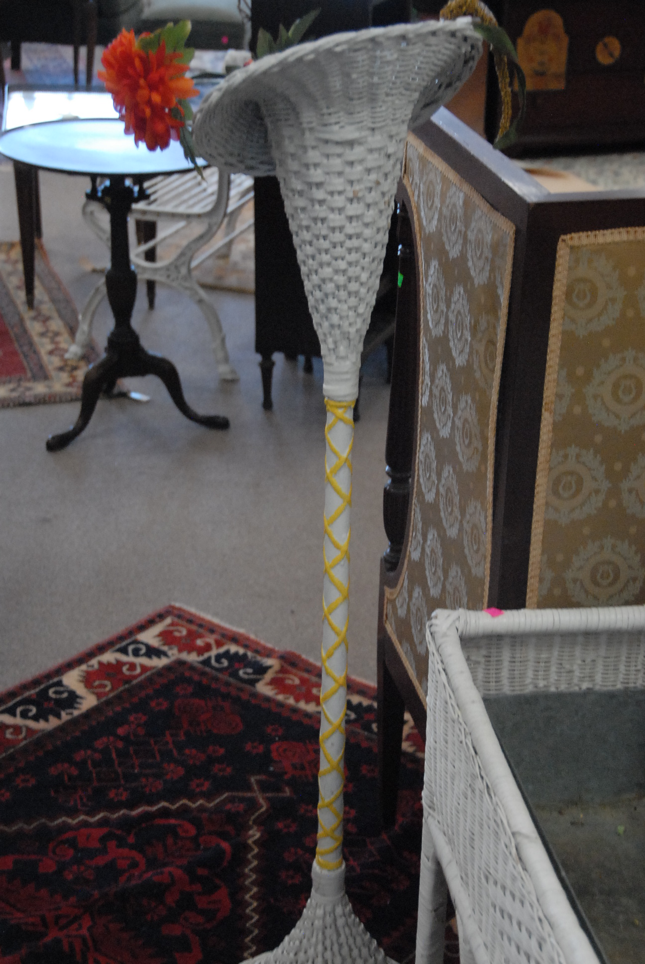 Lot 143: Twelve piece wicker lot to include planter, two magazine racks, basket, and two fern stands, two armchairs, rocker, two tables, and …