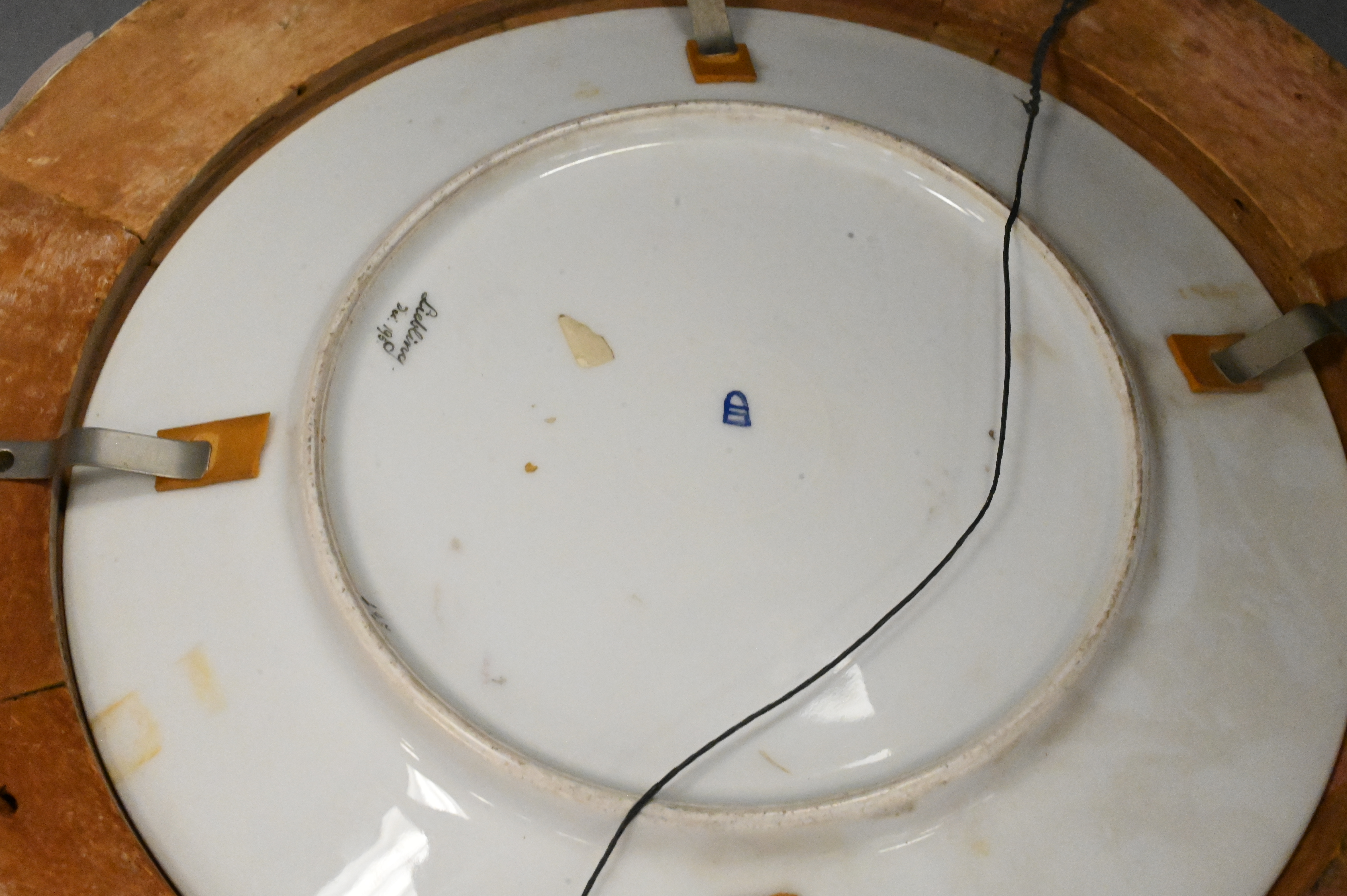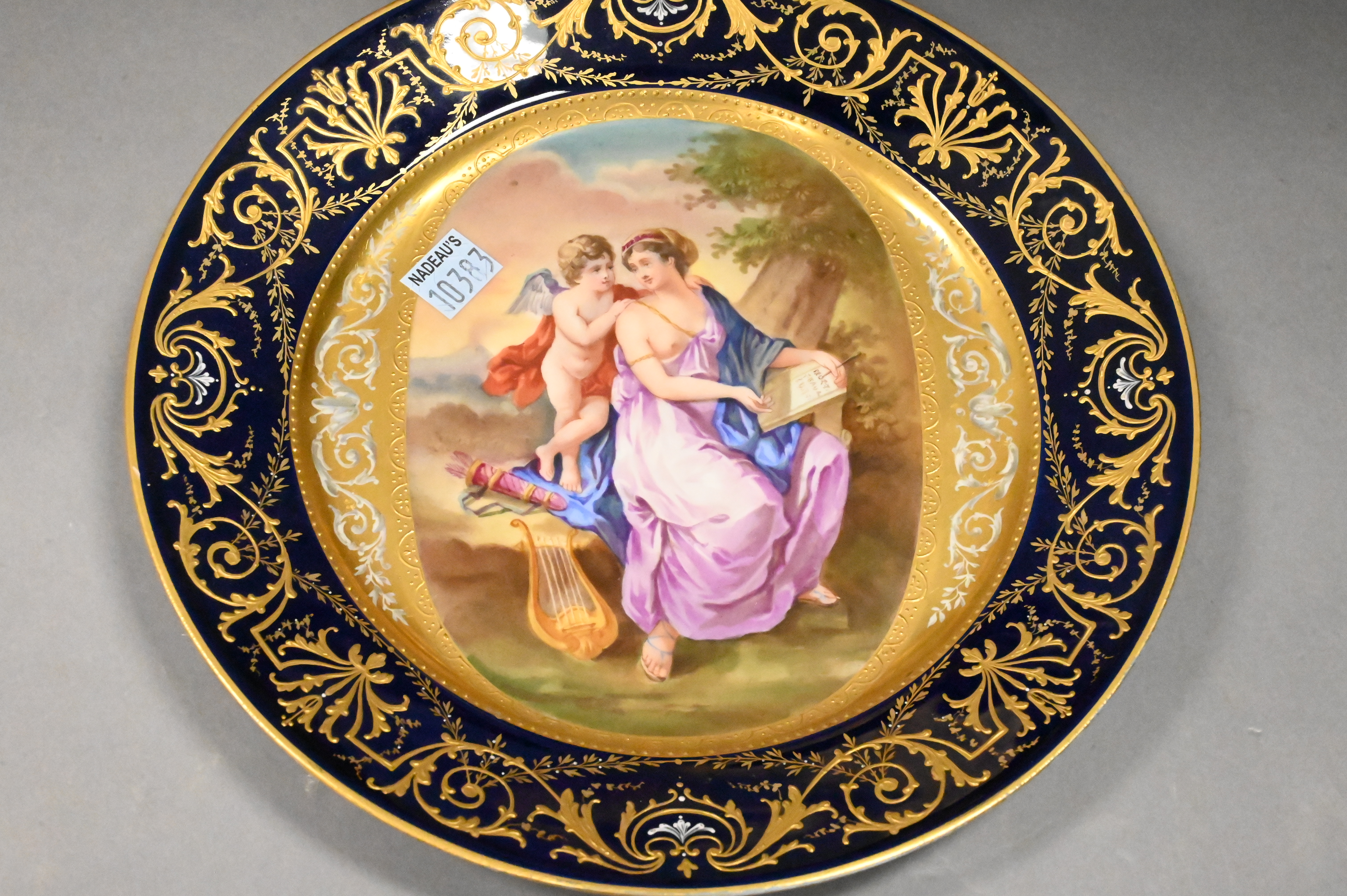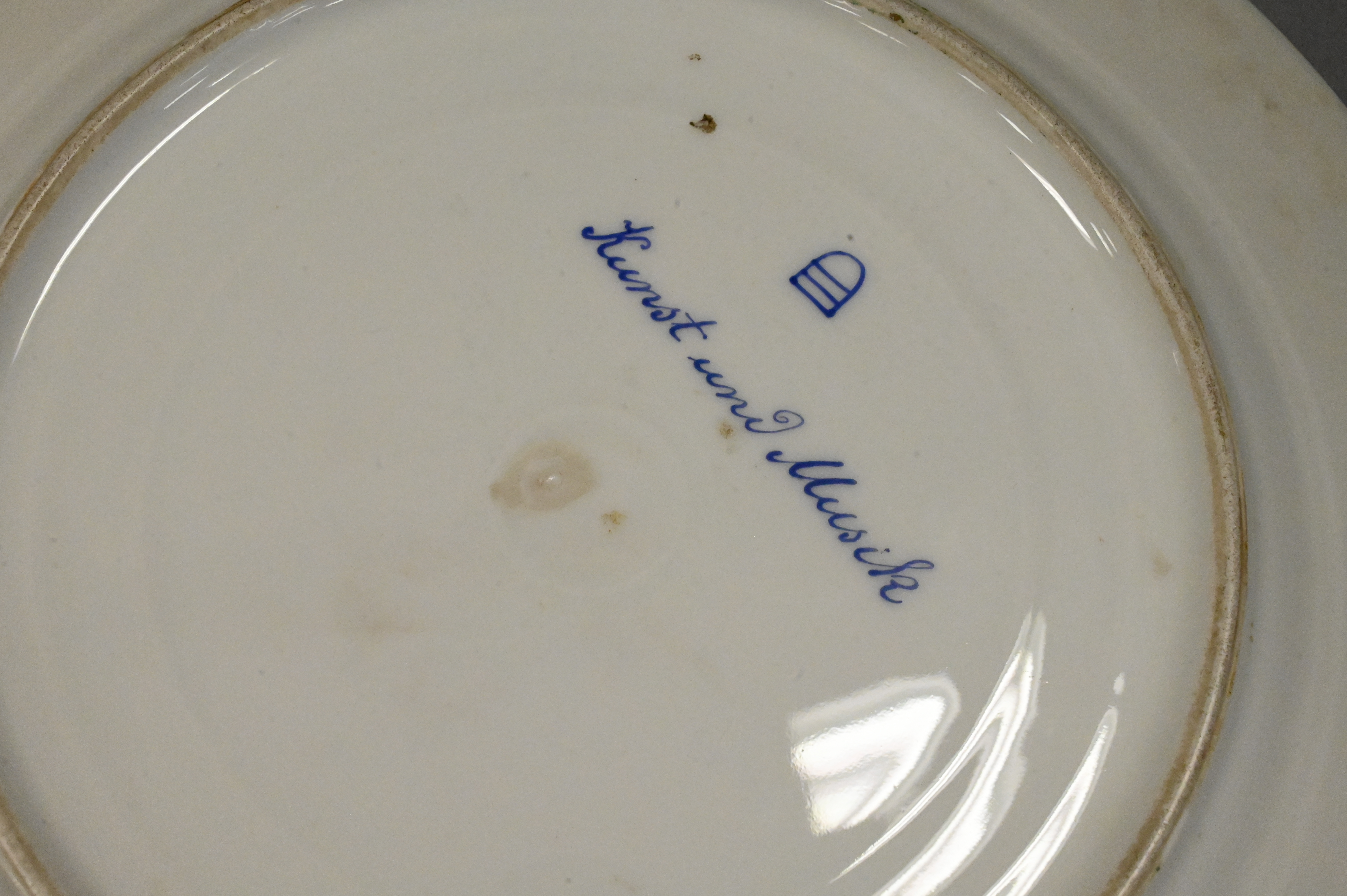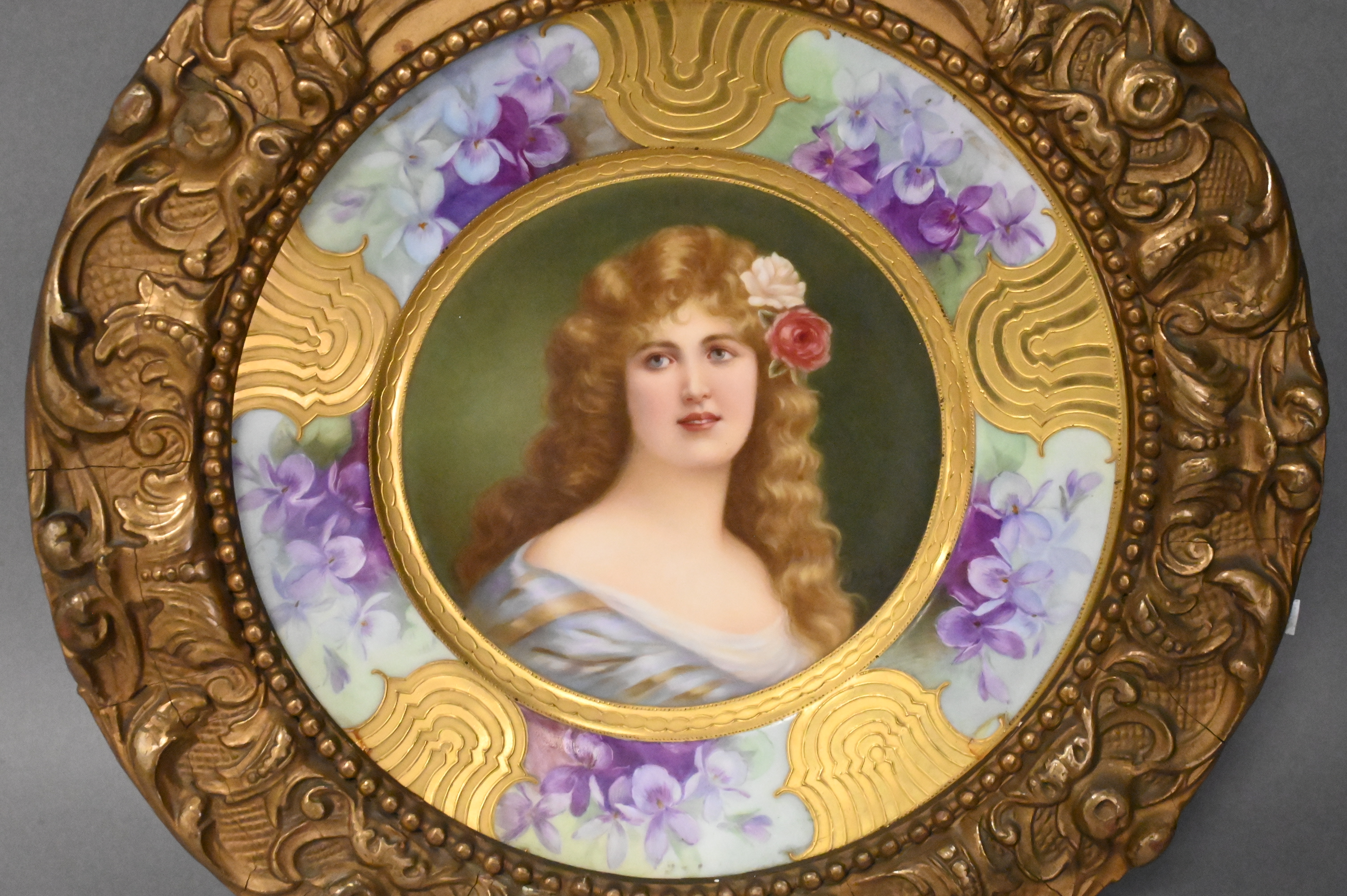 “Liebling” portrait of a blonde beauty with raised gilt border signed illegibly lower right in giltwood frame, “Kunst und Musik” art and music classical scene having cobalt and high relief gilt border both inscribed with beehive mark