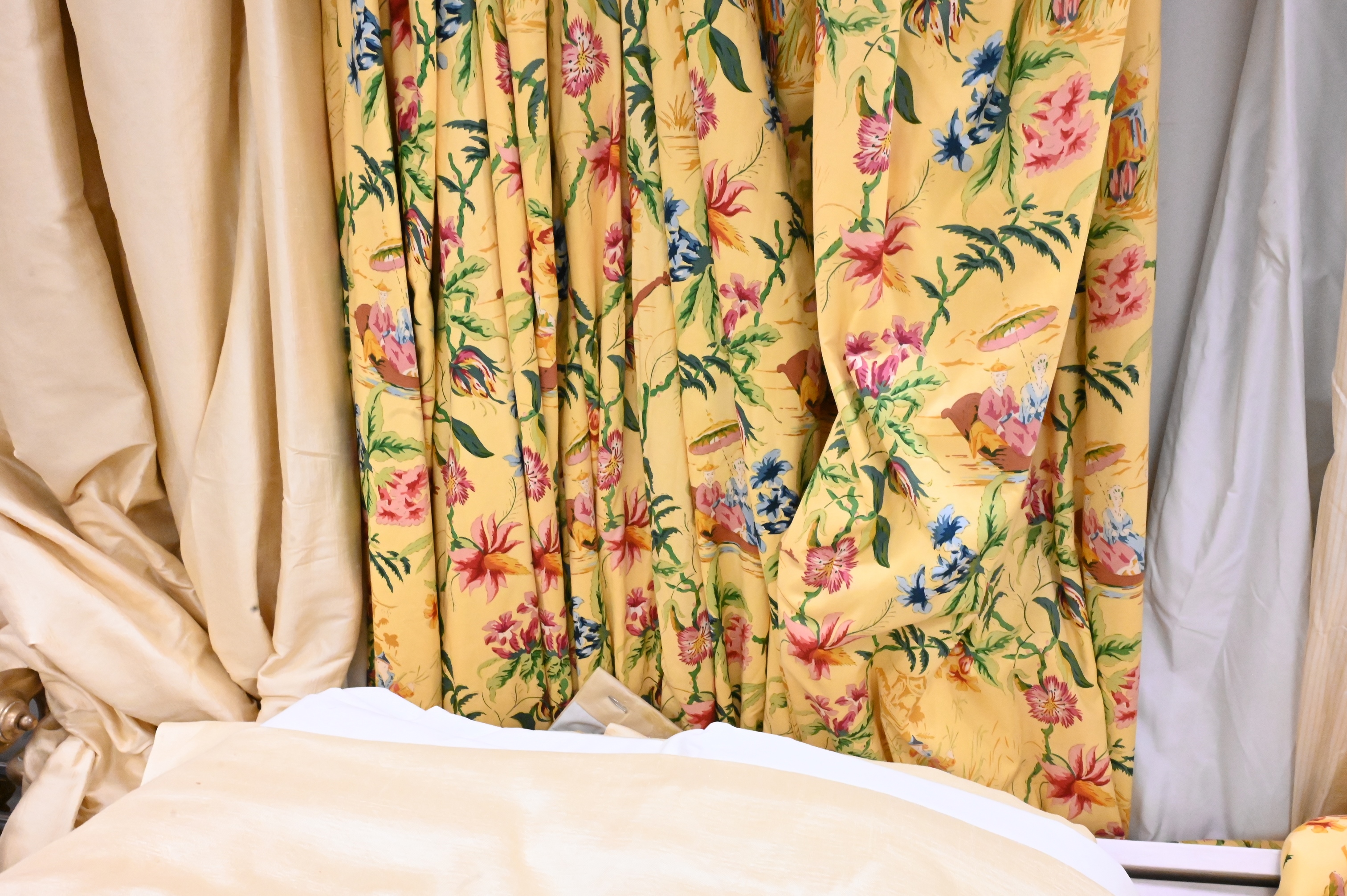 Two Sets of Custom Window Curtains/Drapes, to include eight Scalamandre 100% silk interlined blackout curtains approximately 115″ x 69″; along with three floral motif curtains, approximately 92″ x 103″.