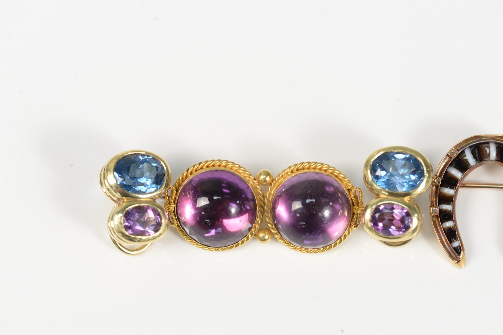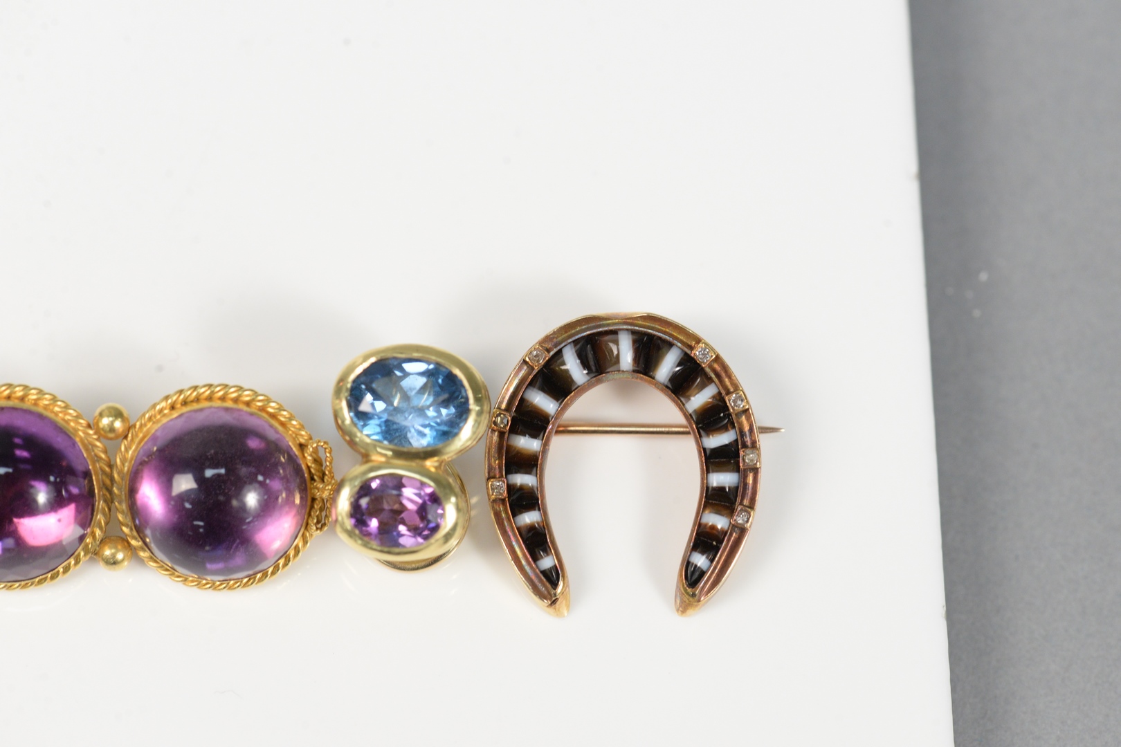 to include pair of ear clips, each set with large blue topaz, and amethyst a horseshoe pin with small diamond chips, along with a Victorian pin with two cabochon cut amethyst