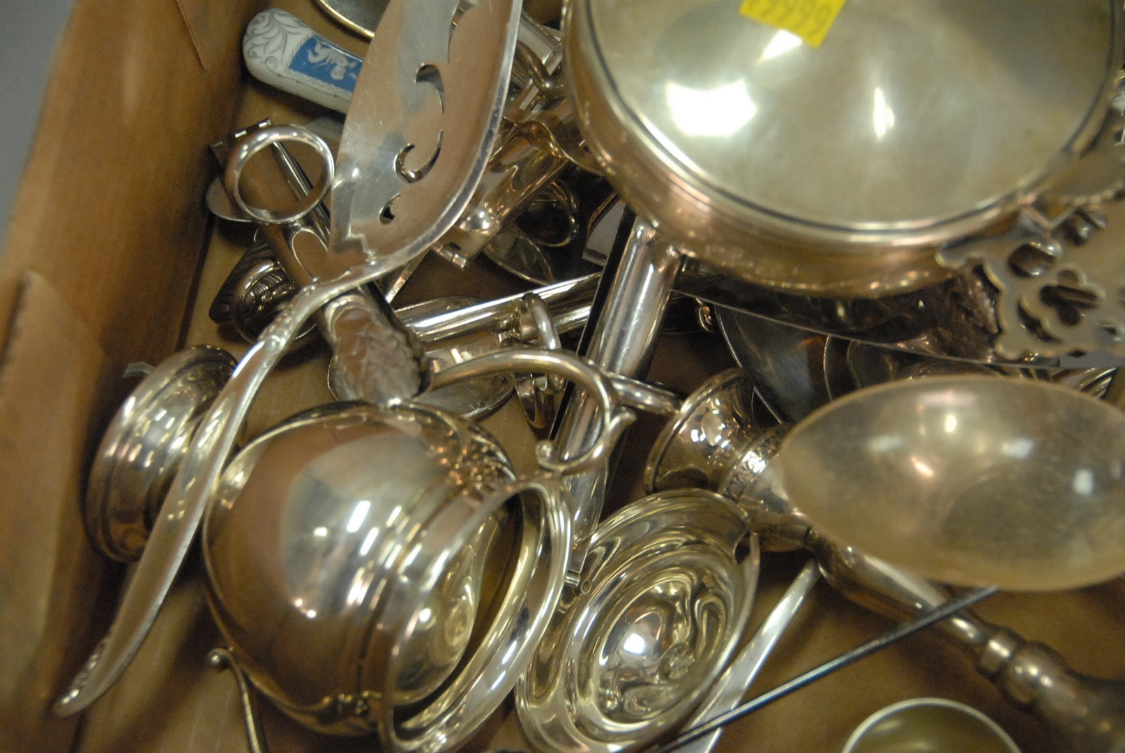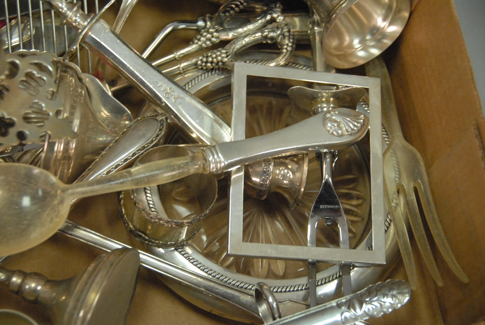 Lot 144: Box lot with sterling silver and silverplate to include sterling silver covered dish, mussel shell box, large stuffing spoon, and more.