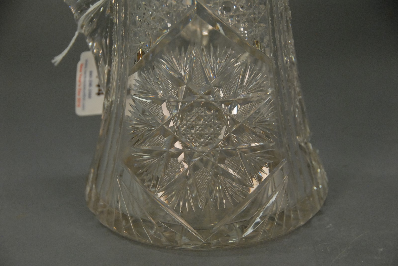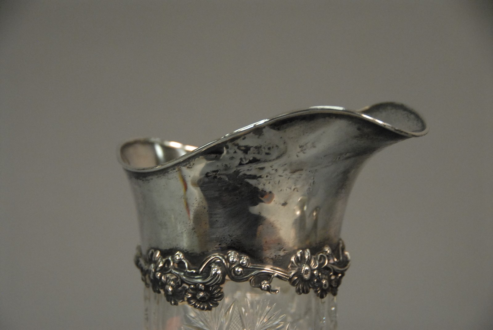 Lot 144: Cut glass pitcher with heavy sterling silver top flake on base. ht. 13 in.