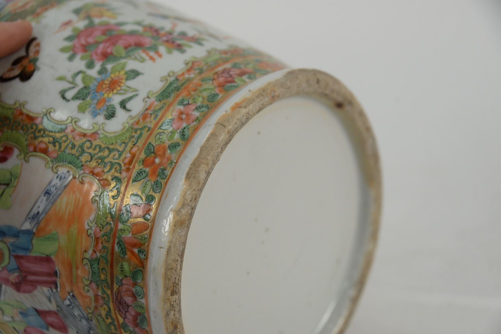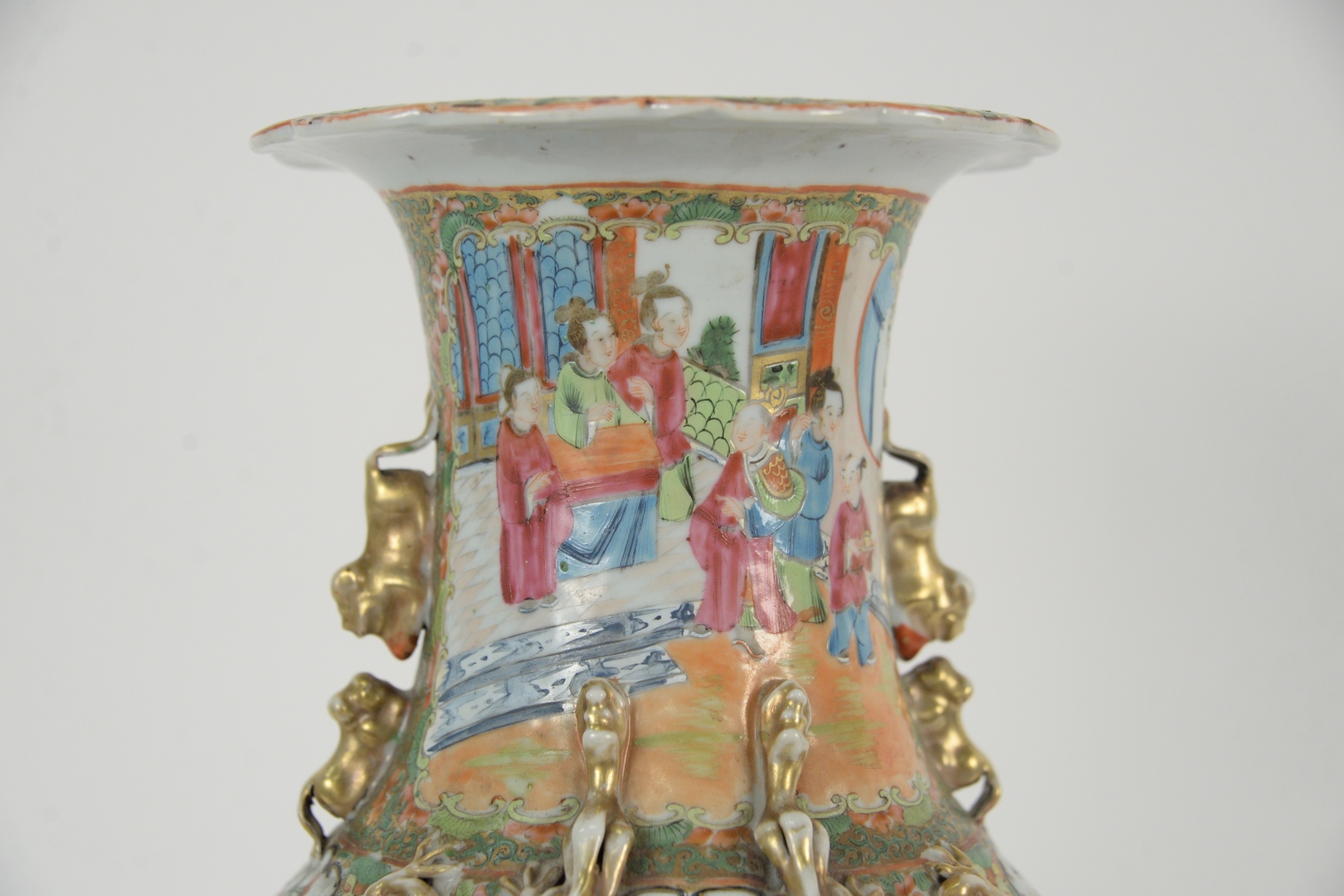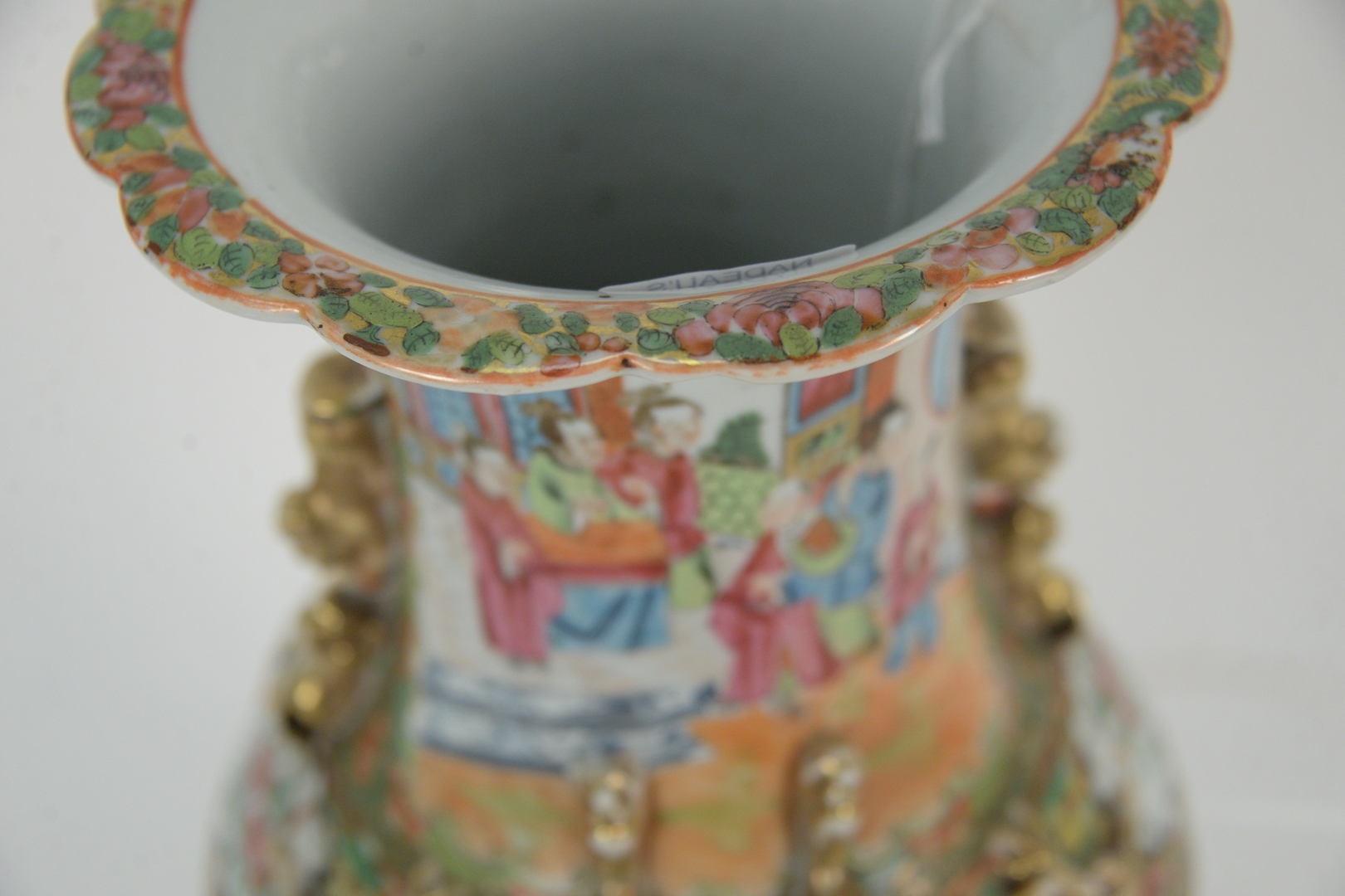 Lot 144: Famille Rose Medallion Baluster/Vase with gilt Qilin dragon and foo dog handles, Daoguang, 19th century, height 17 inches.
