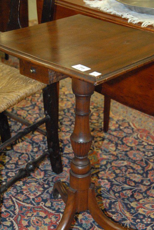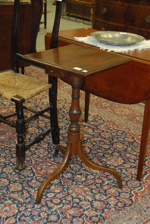 Lot 144: Federal mahogany candlestand, square molded top with a drawer, reeded urn on tripod base, cuff inlay at ankle. ht. 29in. top: 16…..