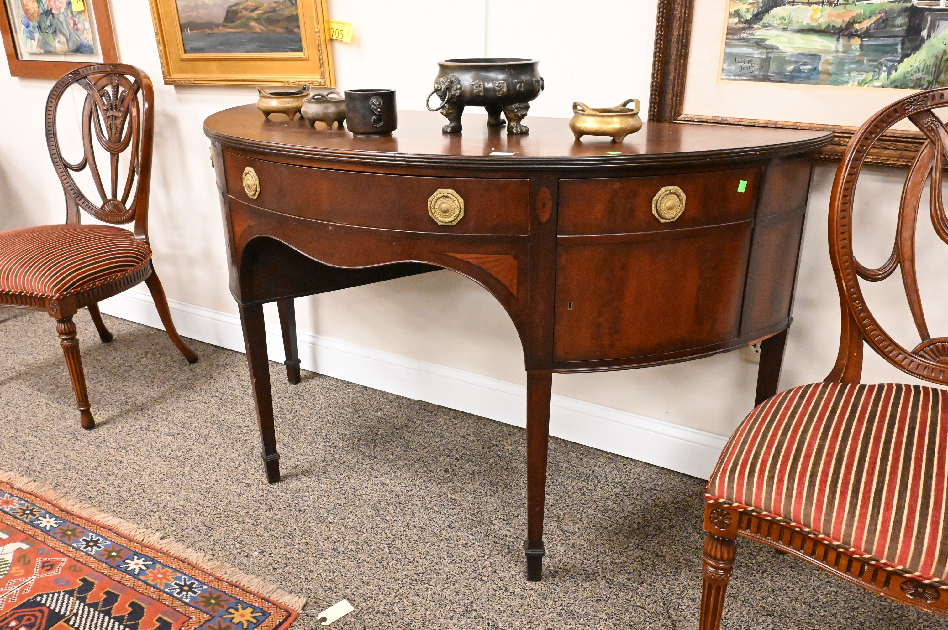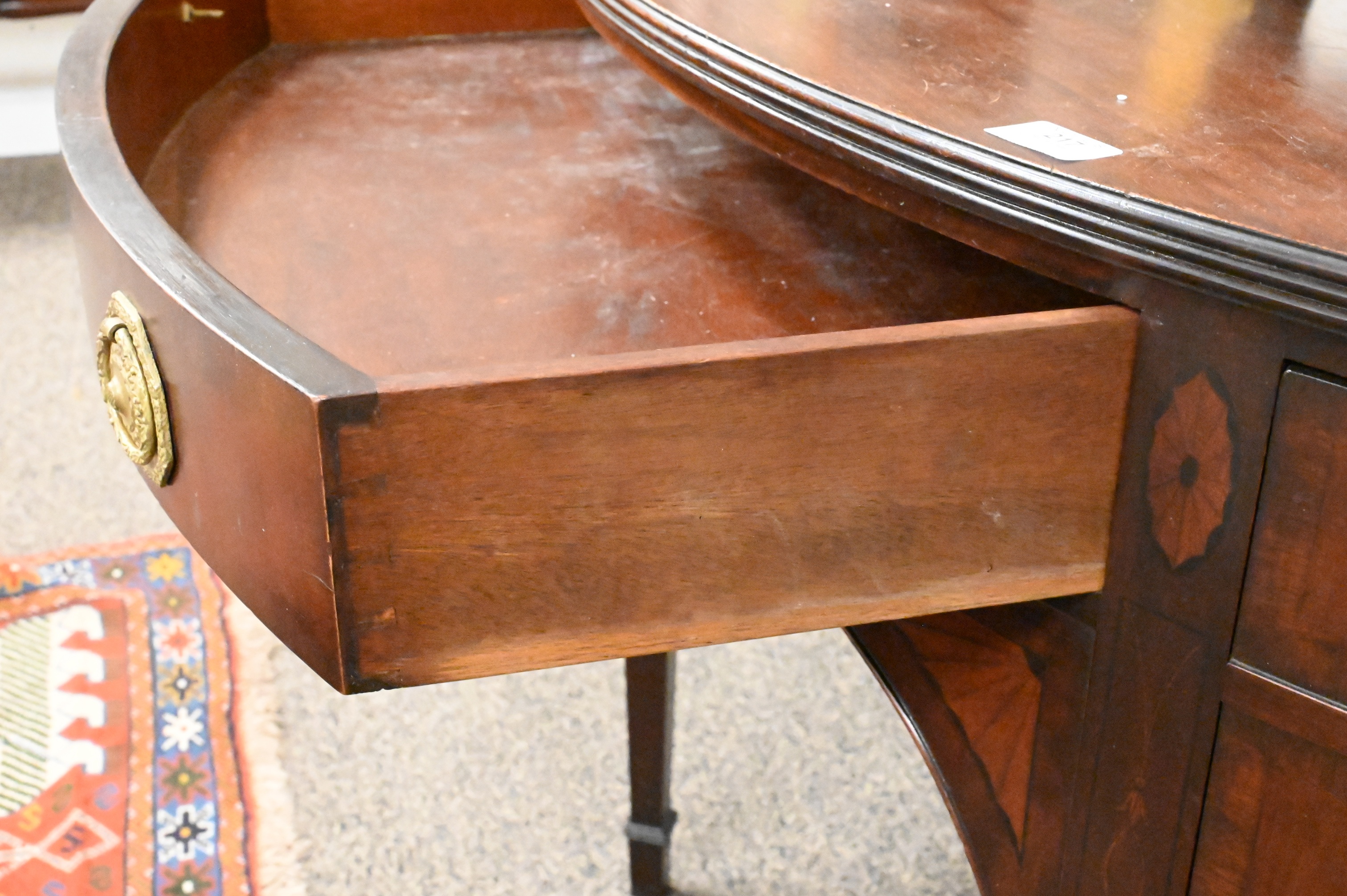 half round form with center drawer flanked by two bowed doors with fan, panel, and bell flower inlays