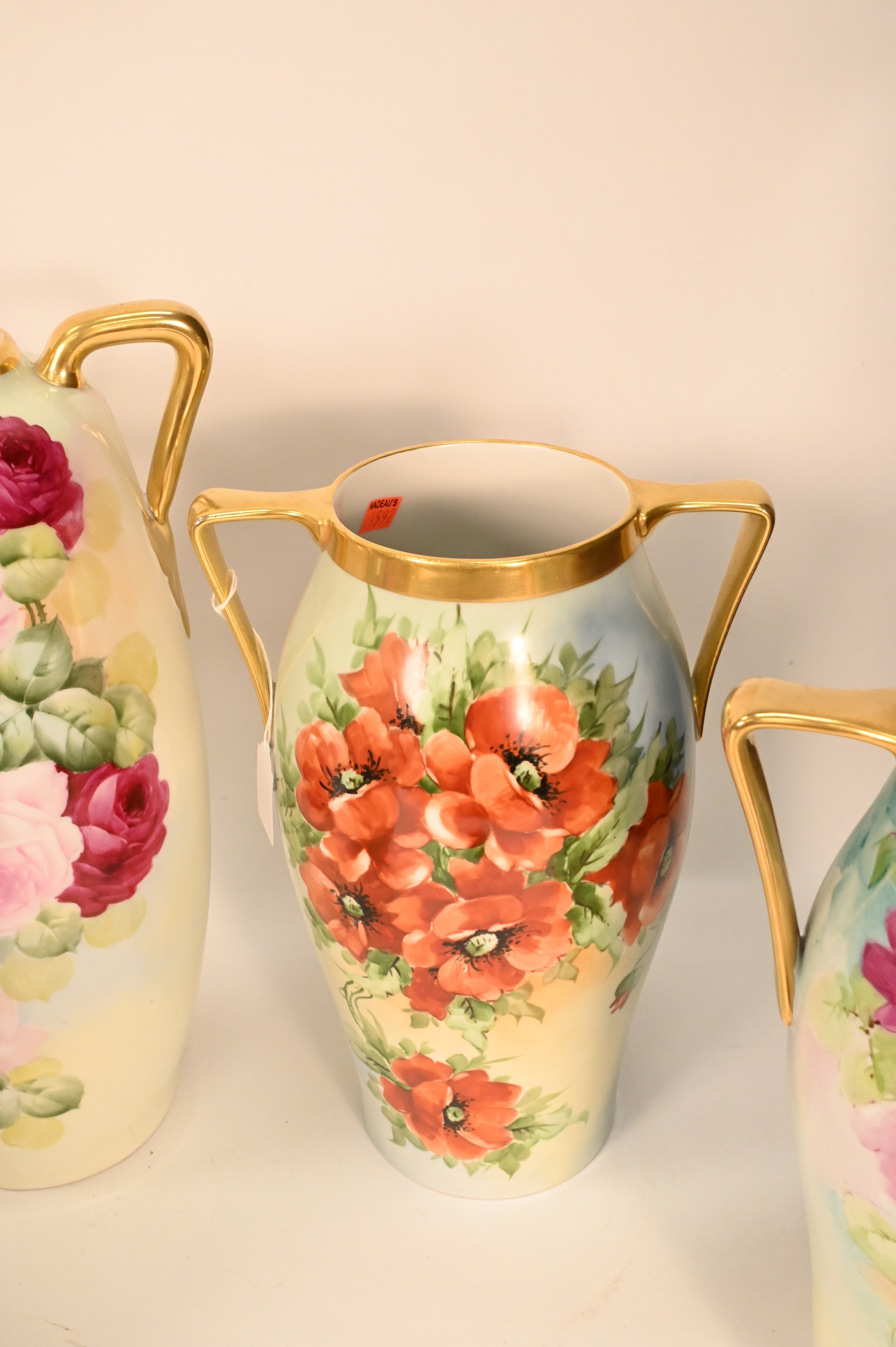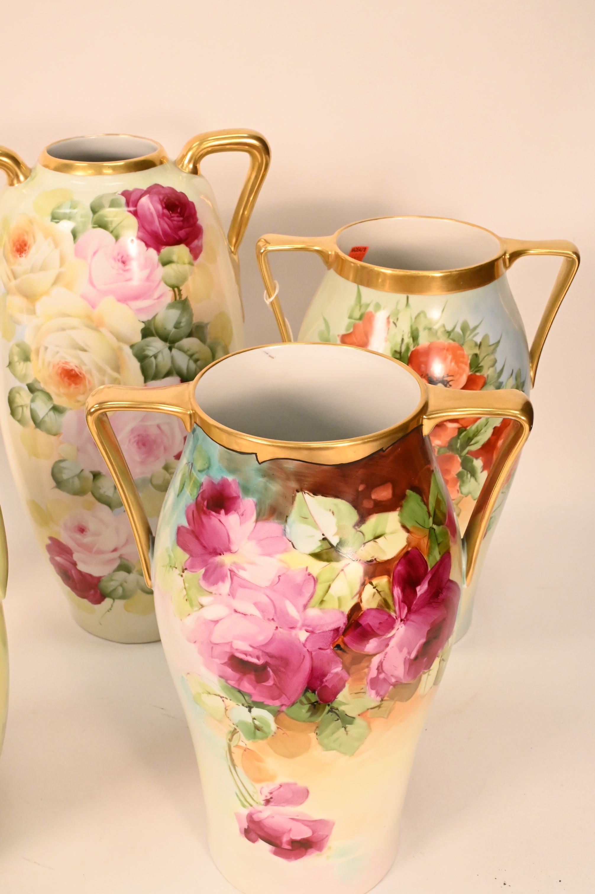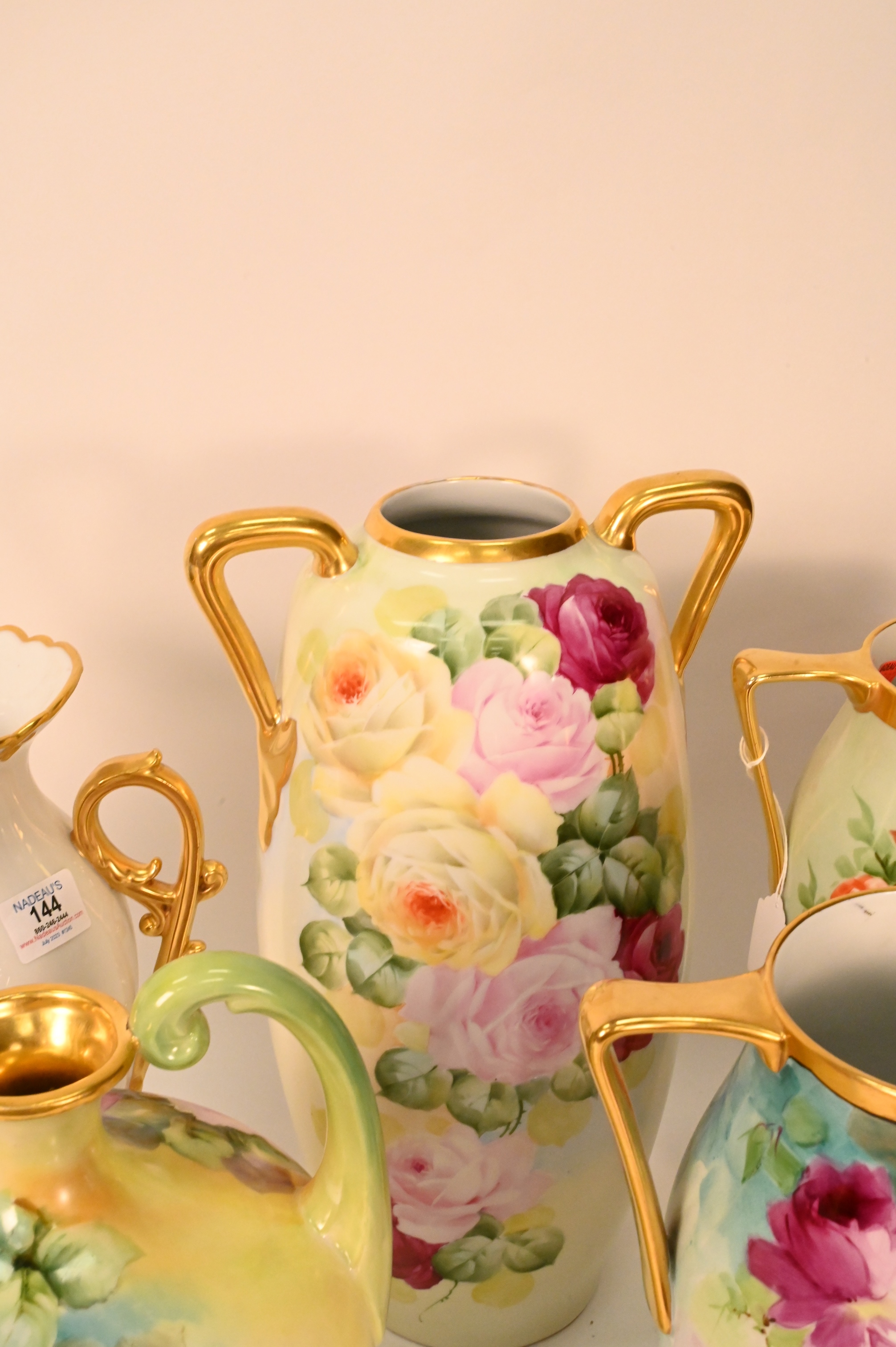 Group of Five Large Porcelain Handled Vases, each hand painted with flowers and gilt decoration, tallest 15 1/4 inches, diameter 8 1/2 inches.