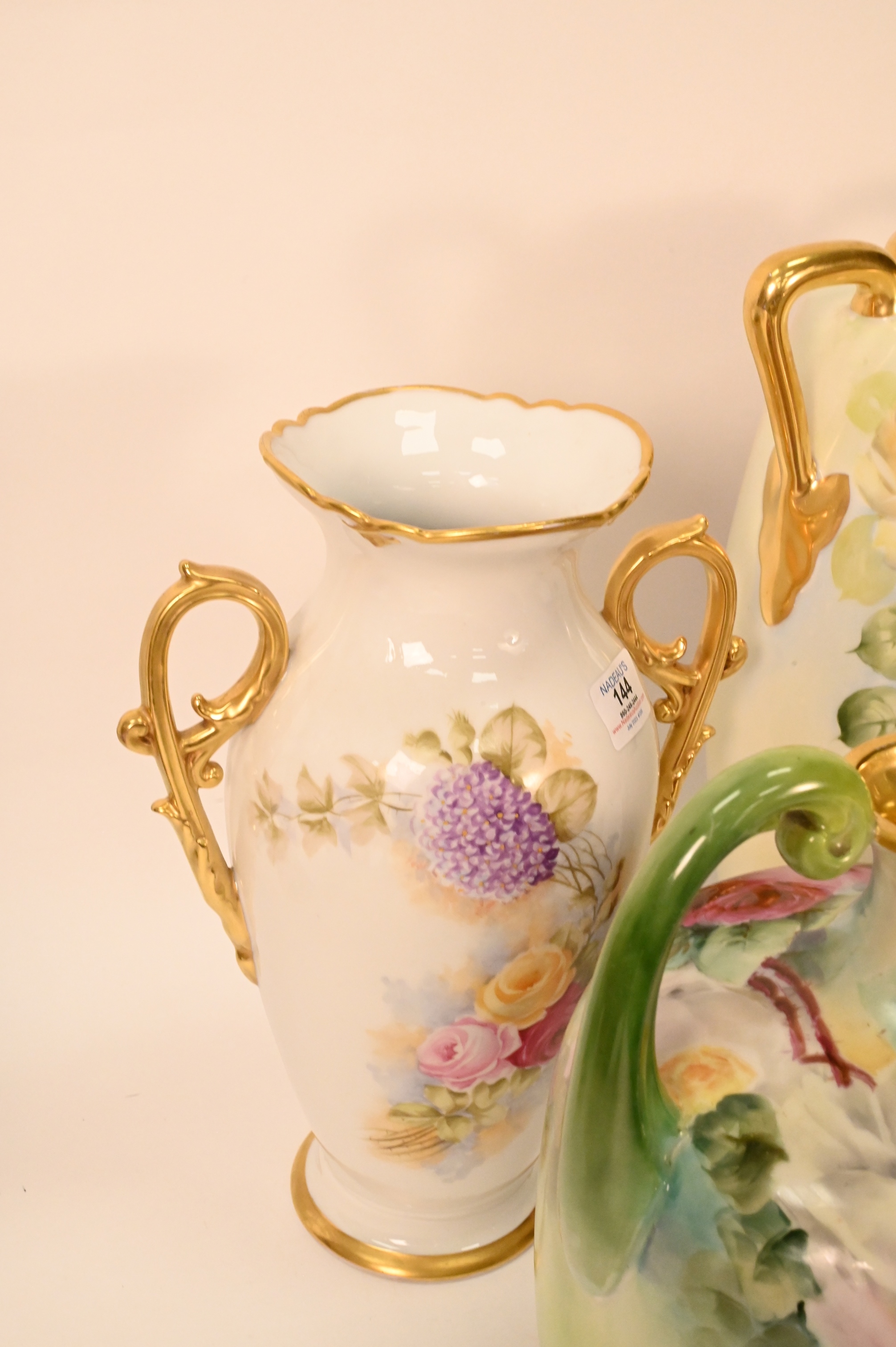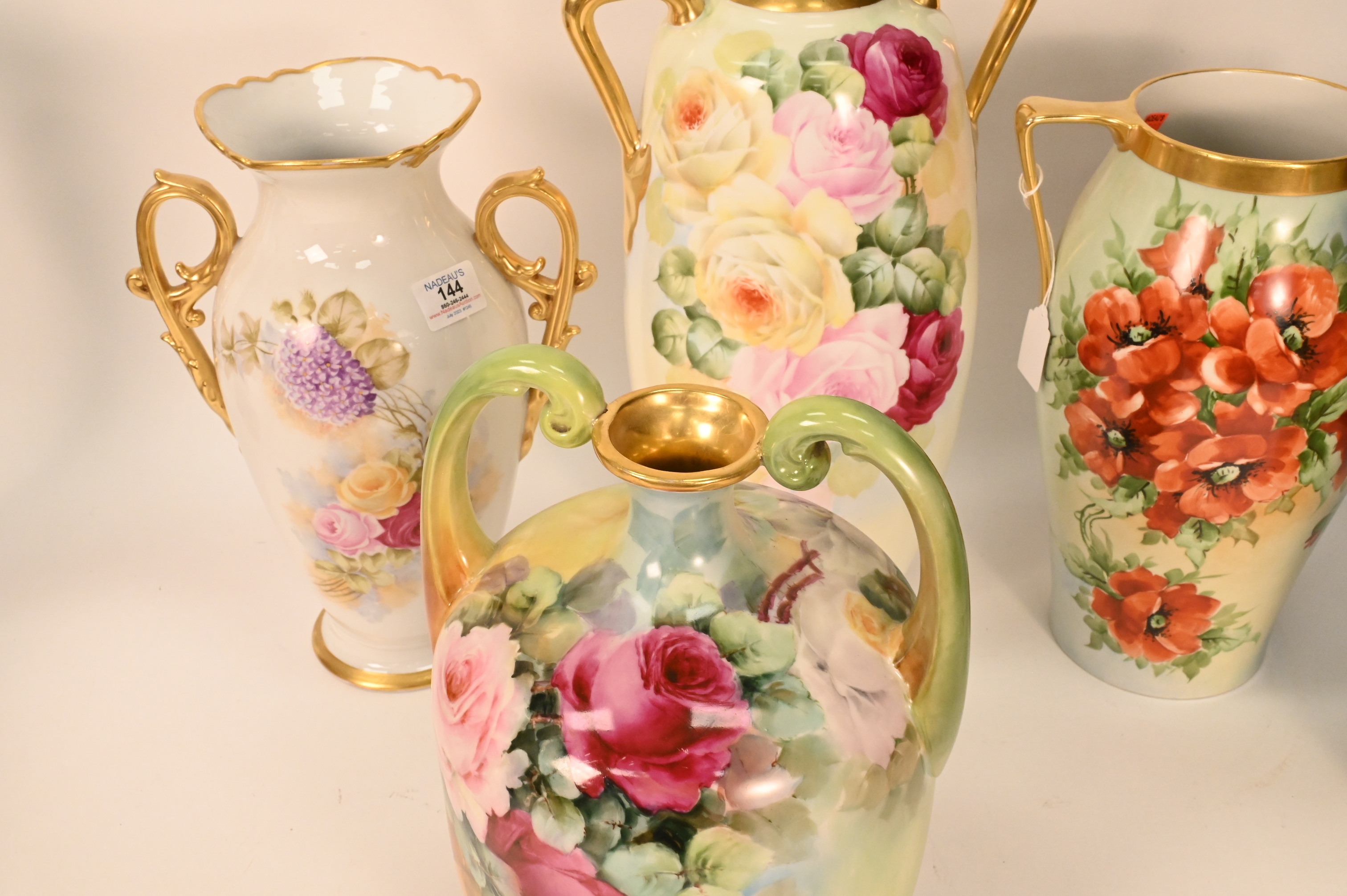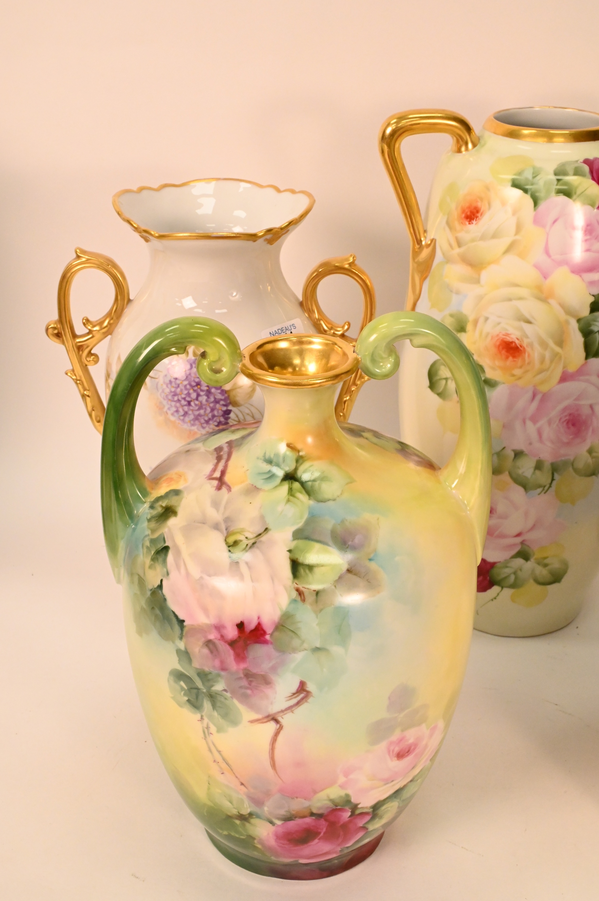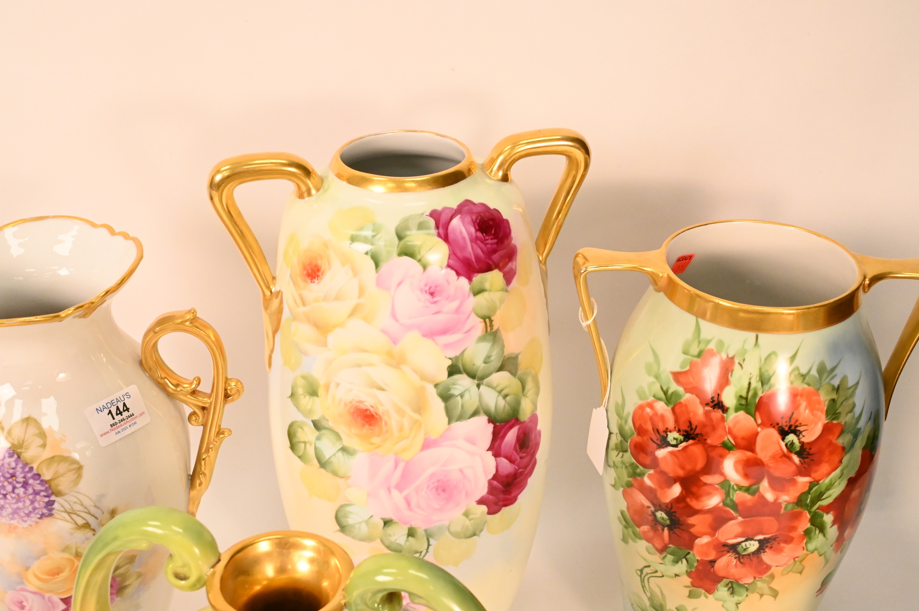Group of Five Large Porcelain Handled Vases, each hand painted with flowers and gilt decoration, tallest 15 1/4 inches, diameter 8 1/2 inches.