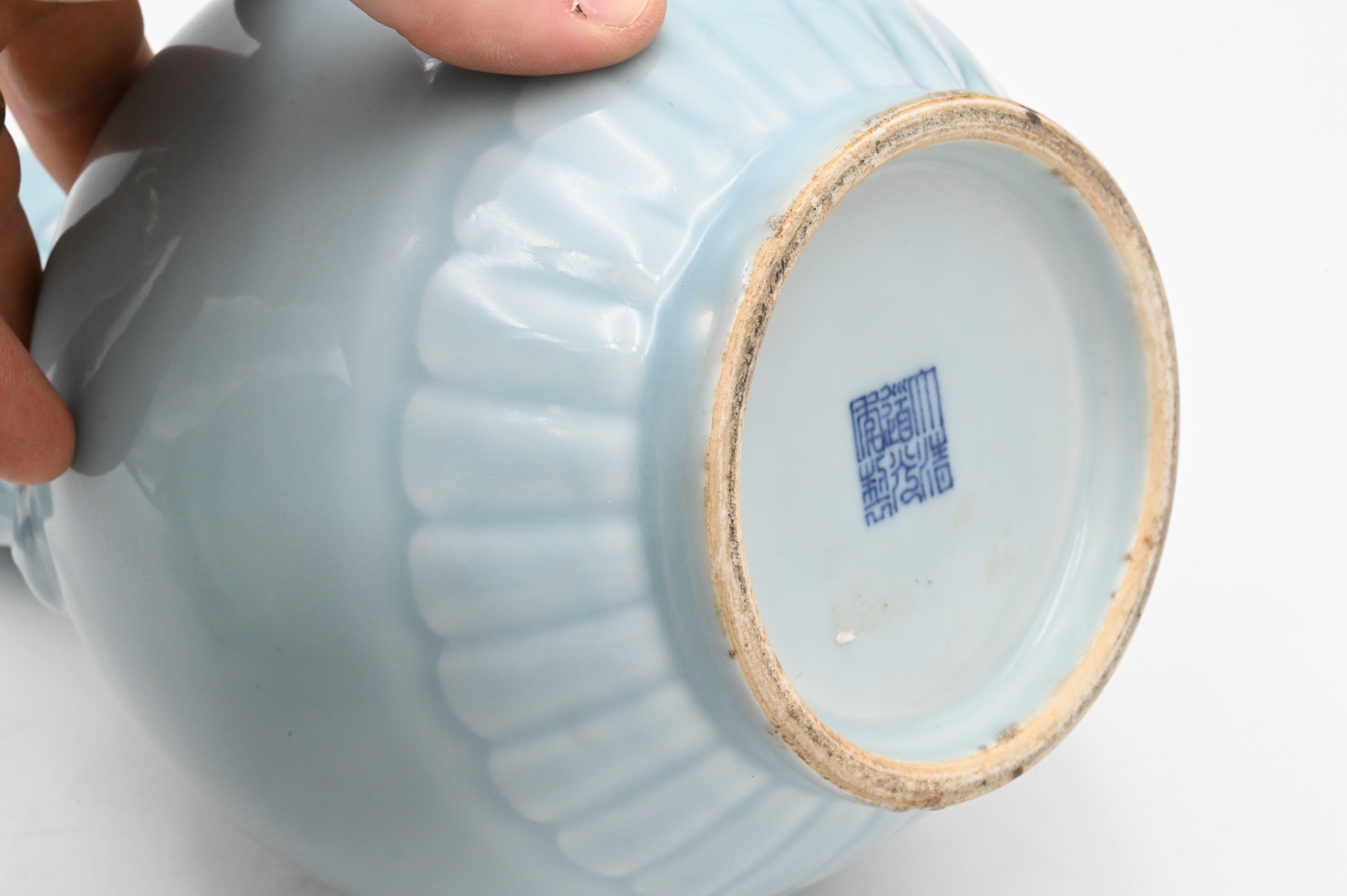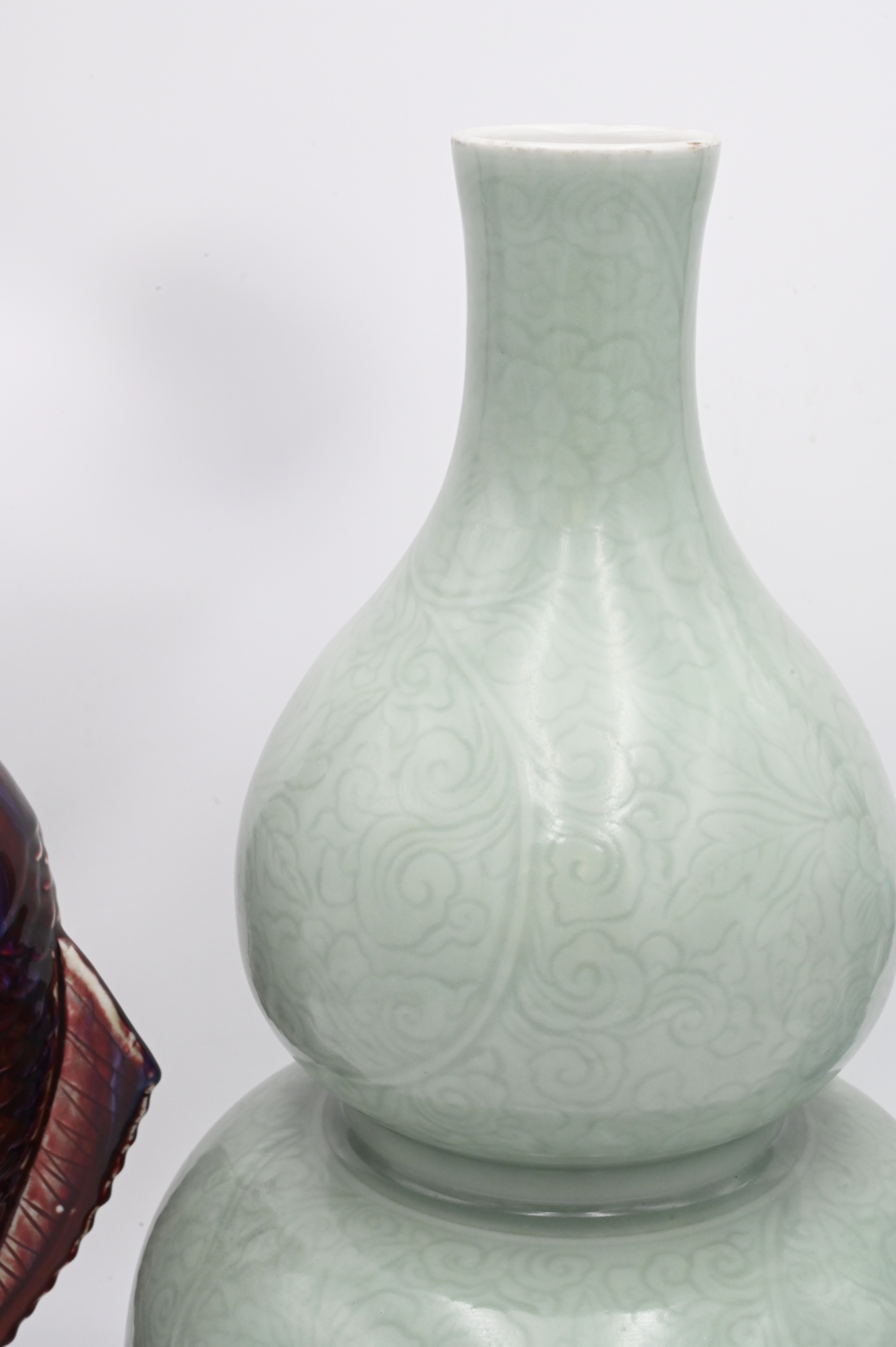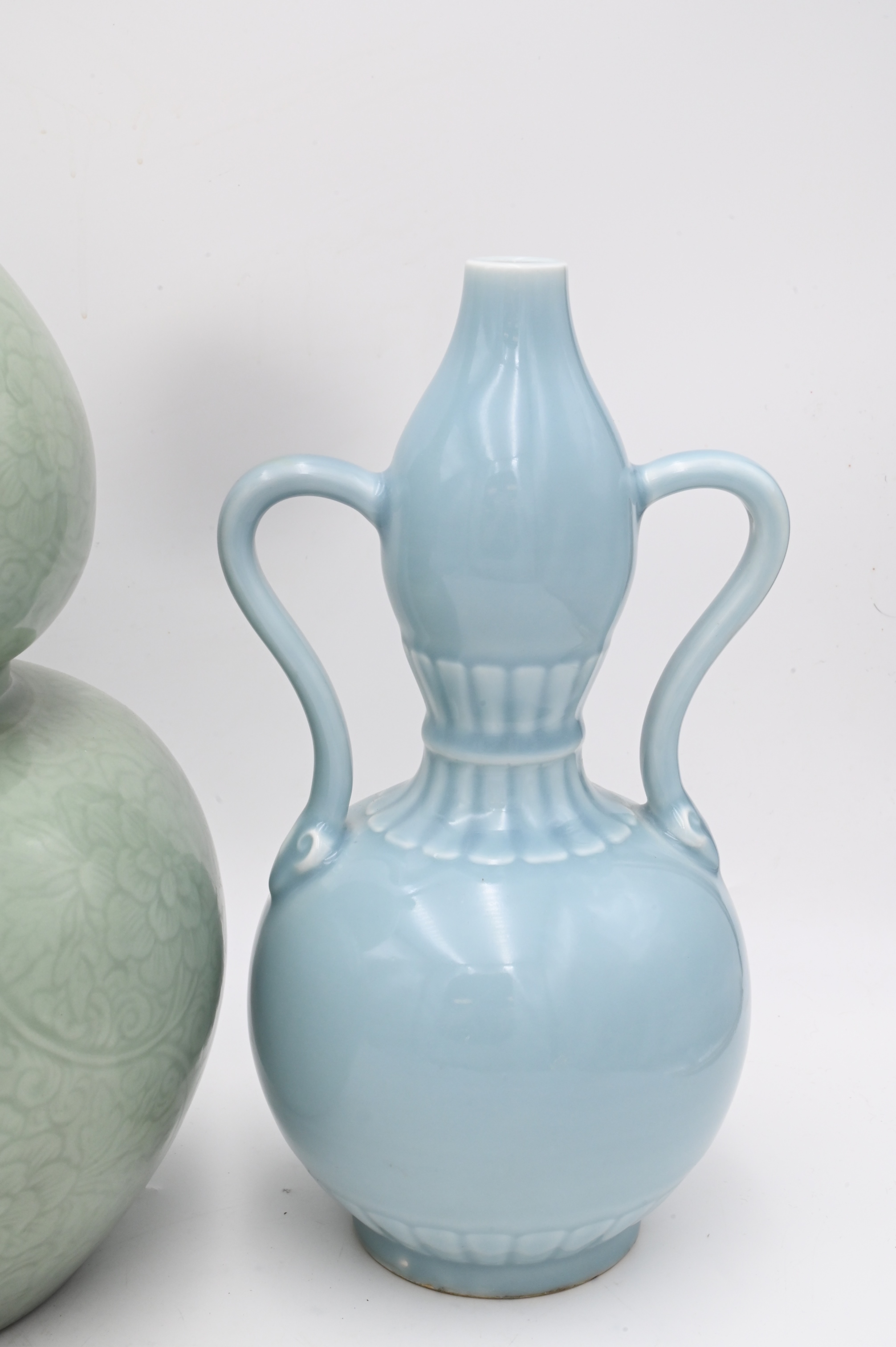celadon double gourd vase having incised scrolling wines, light blue double gourd vase