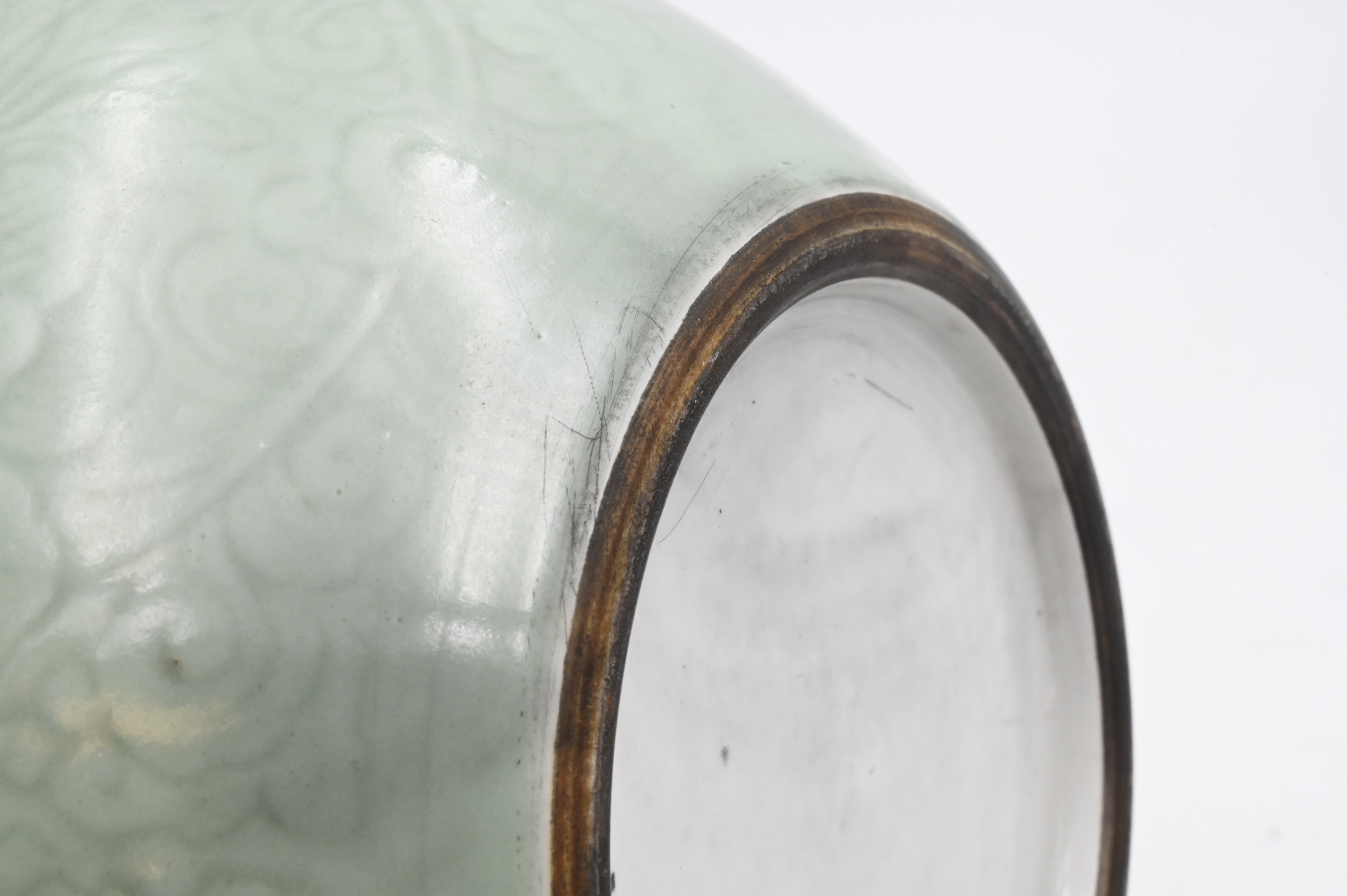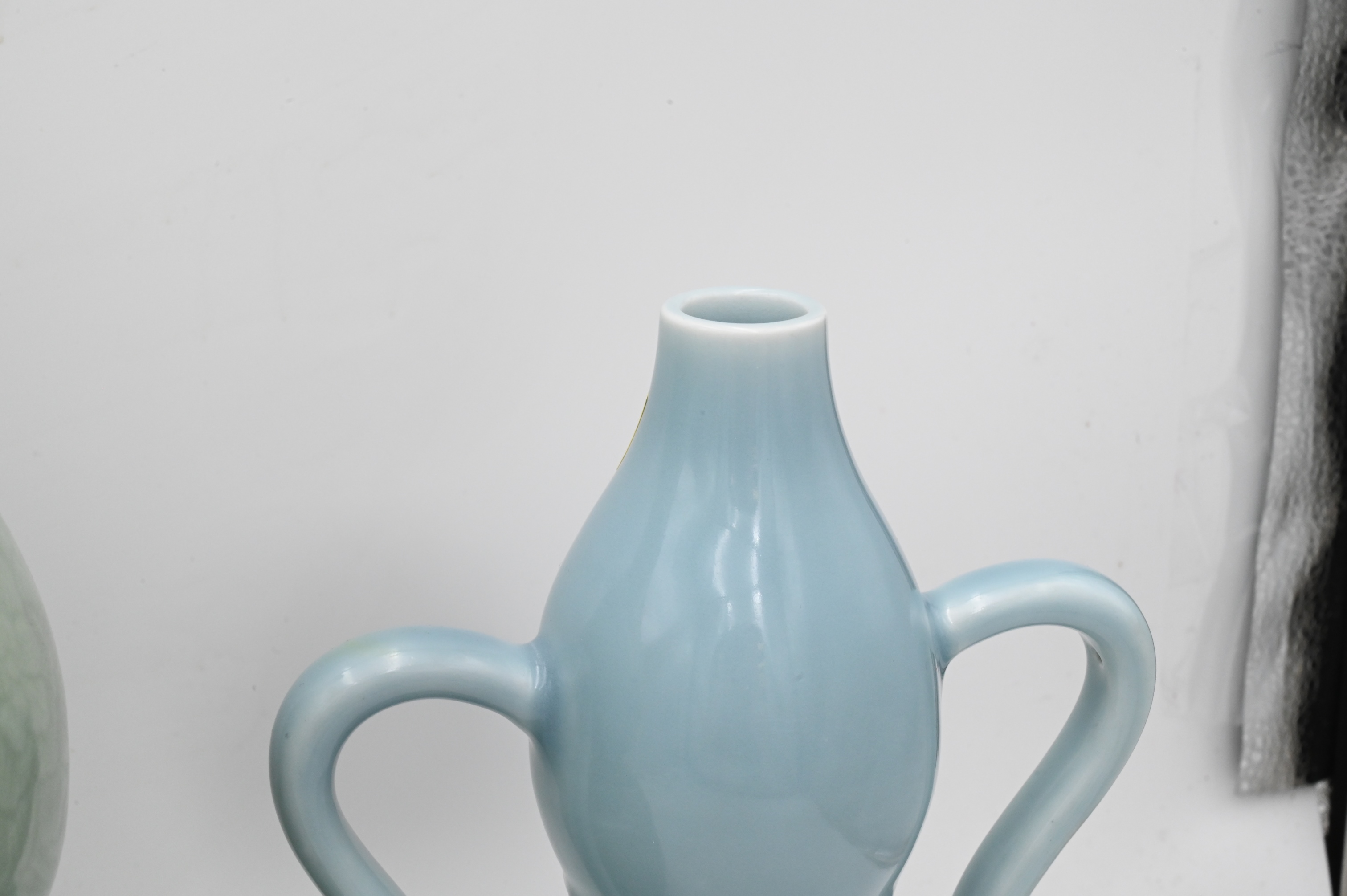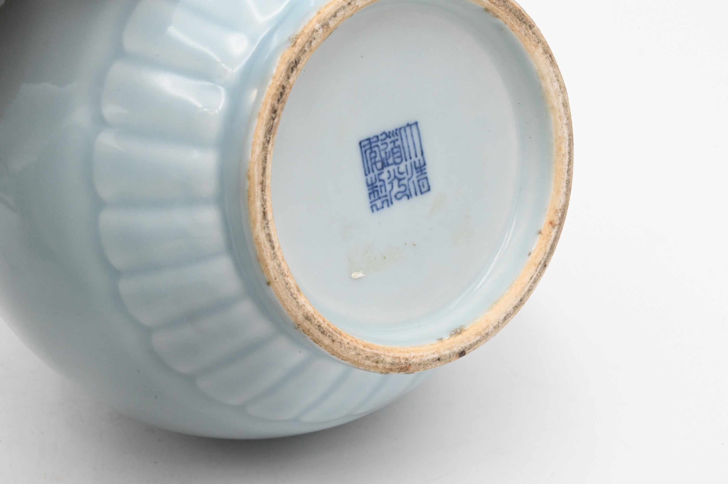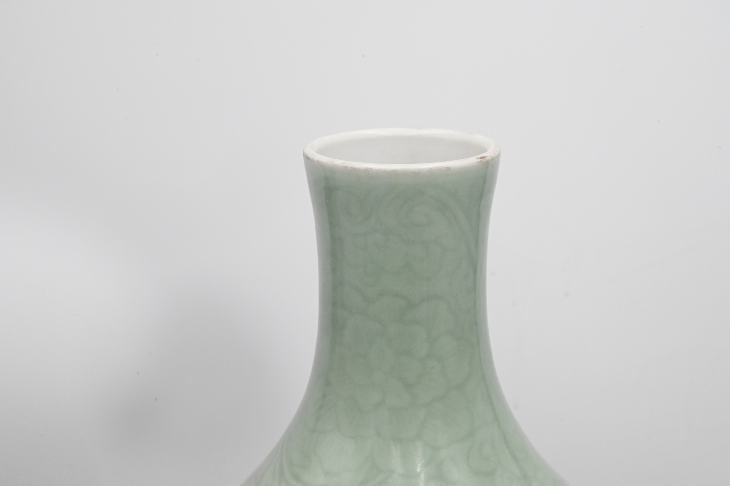 celadon double gourd vase having incised scrolling wines, light blue double gourd vase