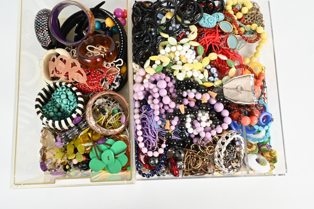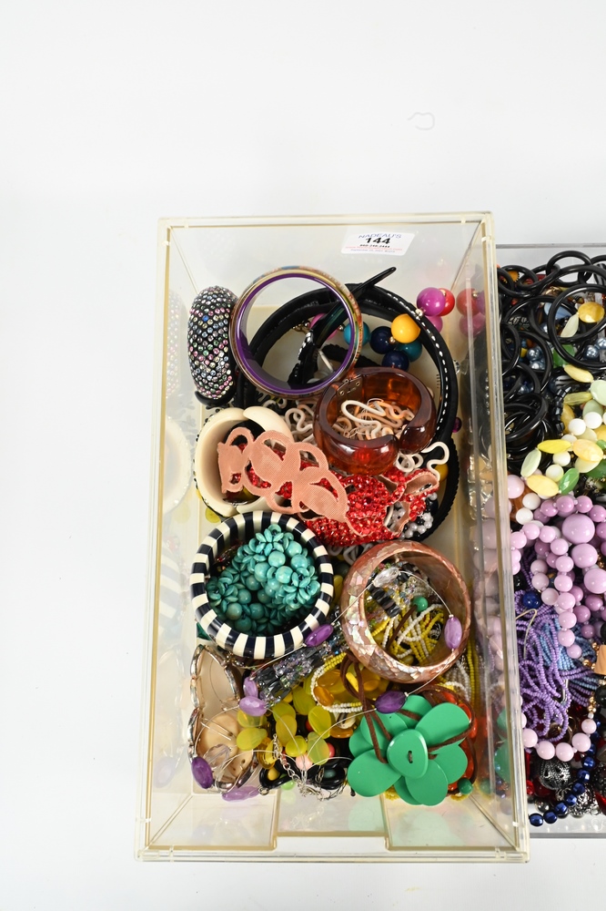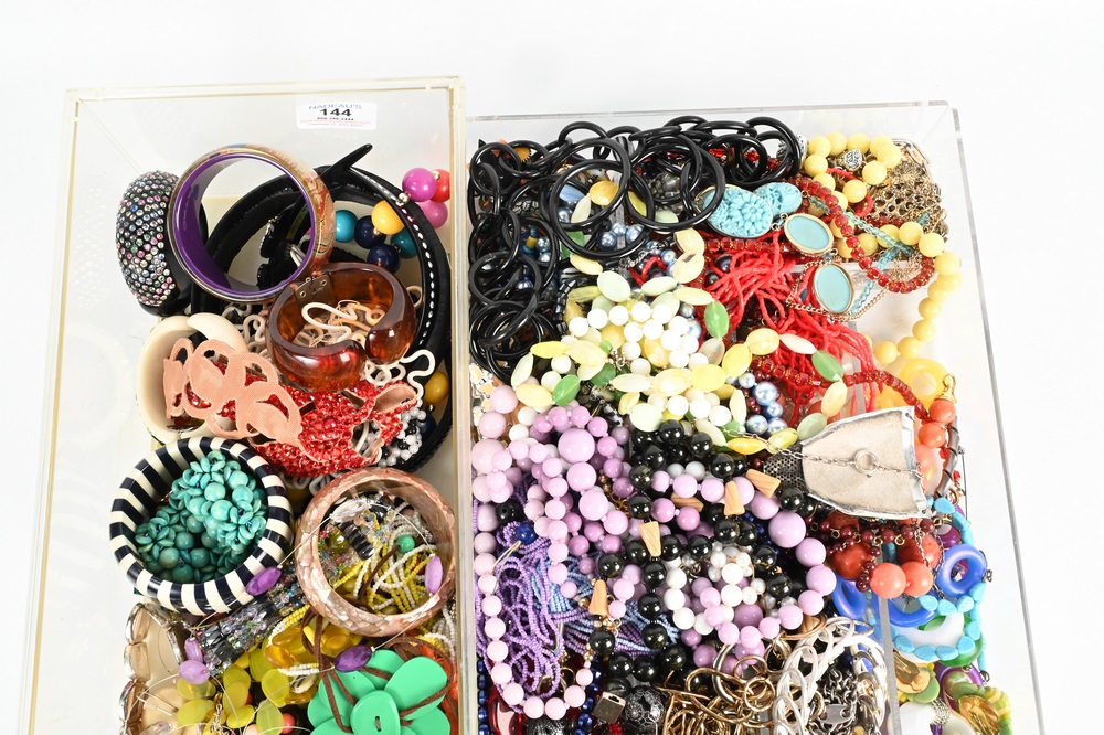 Lot 144: Large Group of Costume Jewelry, to include purple earrings, signed illegibly; Cadoro chain; beaded necklaces; bracelets, etc.