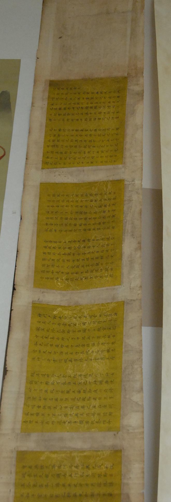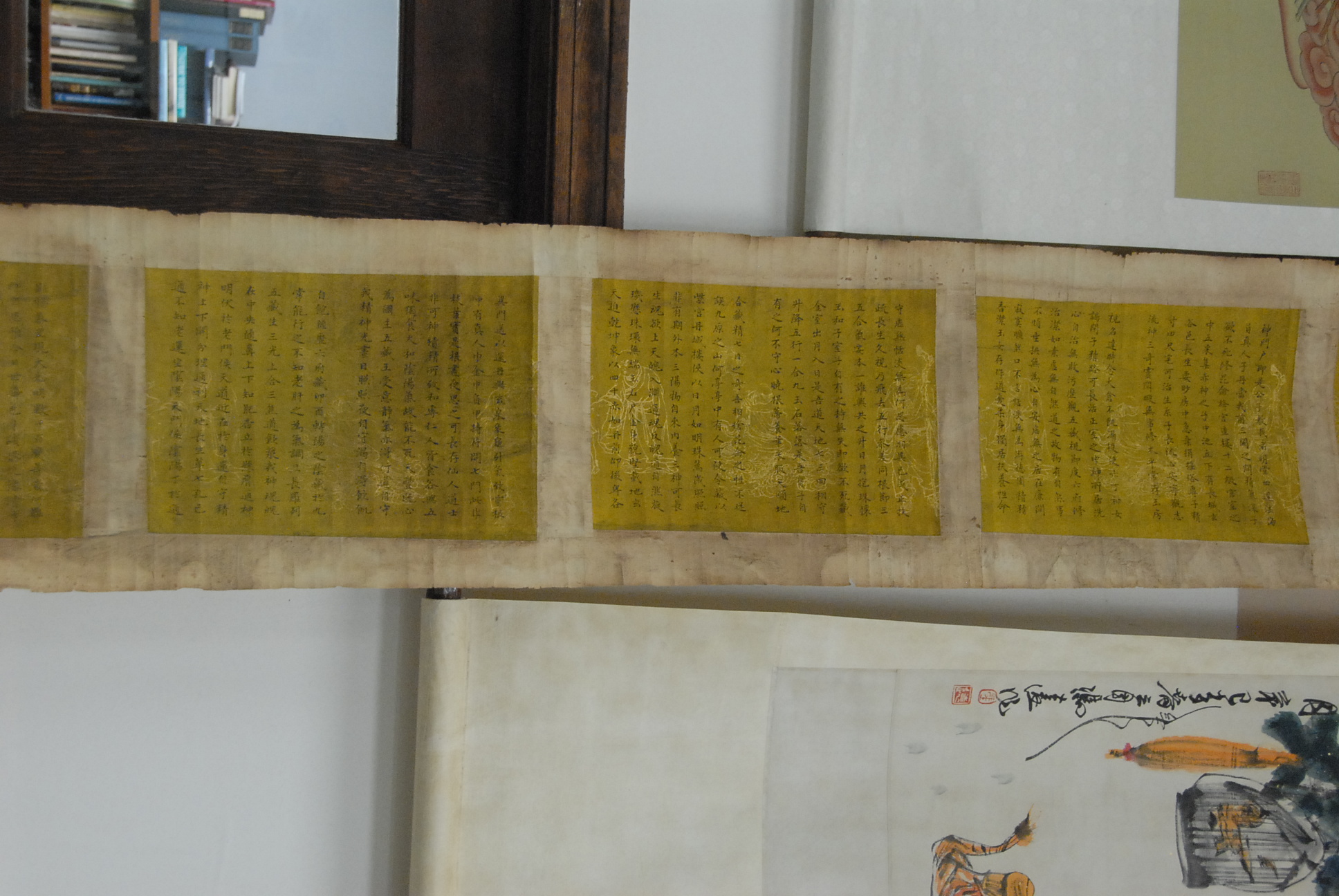 Lot 144: Oriental horizontal He Shaoji character scroll having seven panels with writing, 11 x 120.