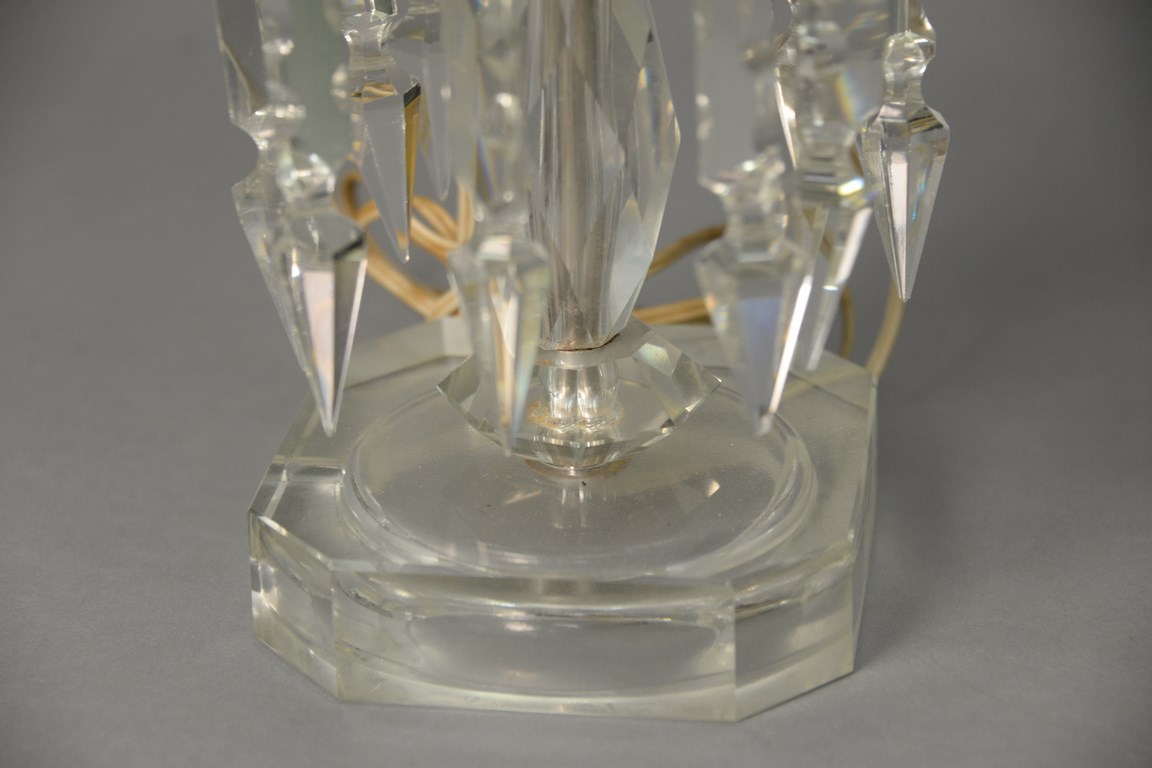 Pair of crystal hurricane lamps with prisms. ht. 21 1/2 in.