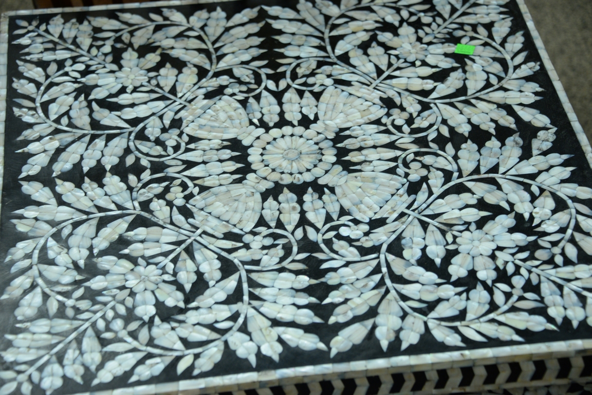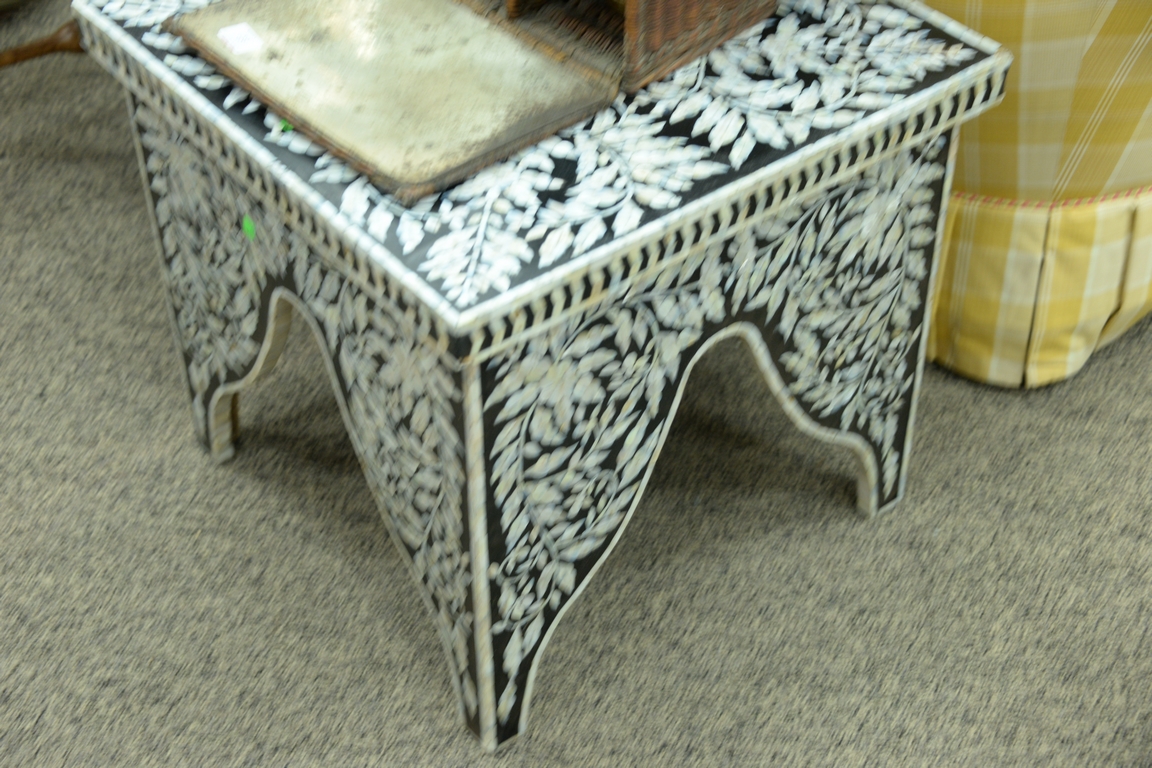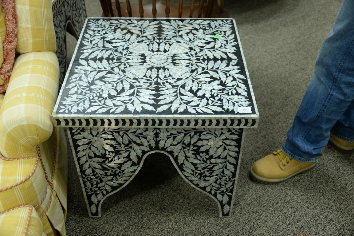 Lot 144: Pair of square mother of pearl inlaid tables on cut out bracket bases, ht. 22in., top: 23 1/2 x 23 3/4