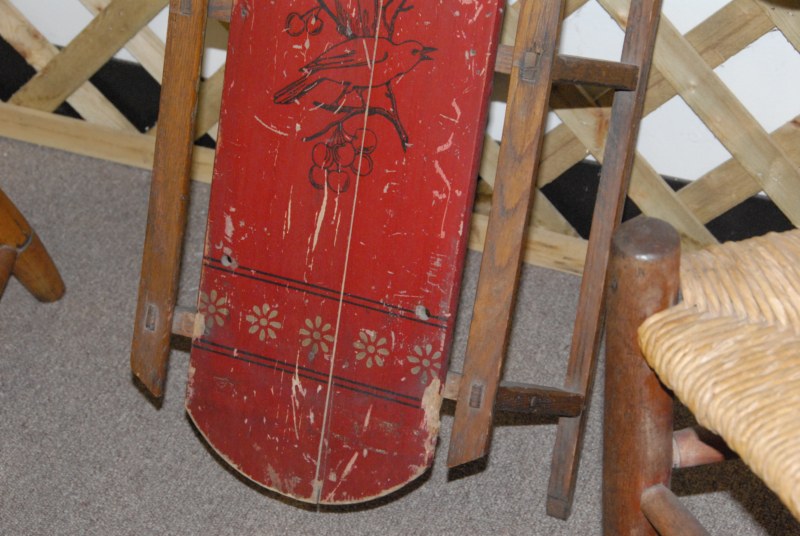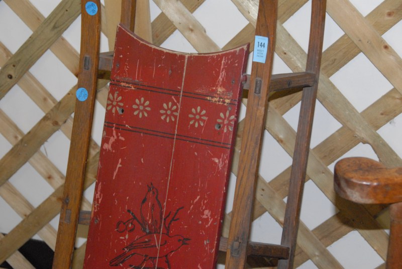 Primitive sled marked Paris Manufacturing Company, South Paris, Maine.