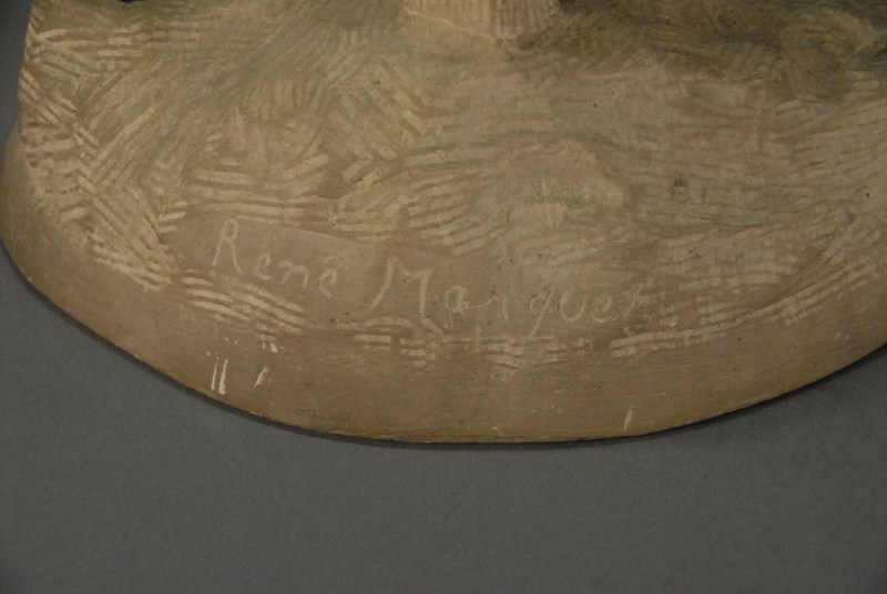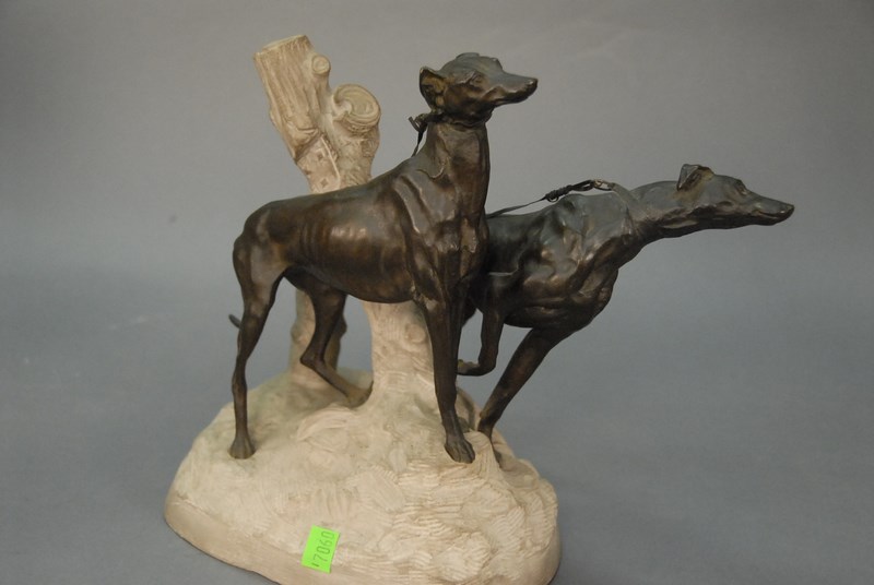 Lot 144: Rene Paul Marquet 1875-1939 Bronze sculpture of two Wolfhounds tied to sculpted cement posts, signed Rene’ Marquet. lg. 12 1/2in.