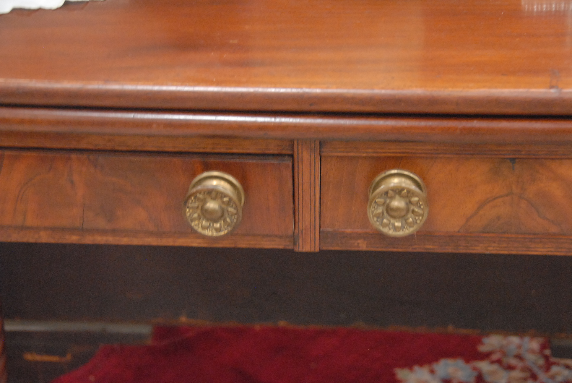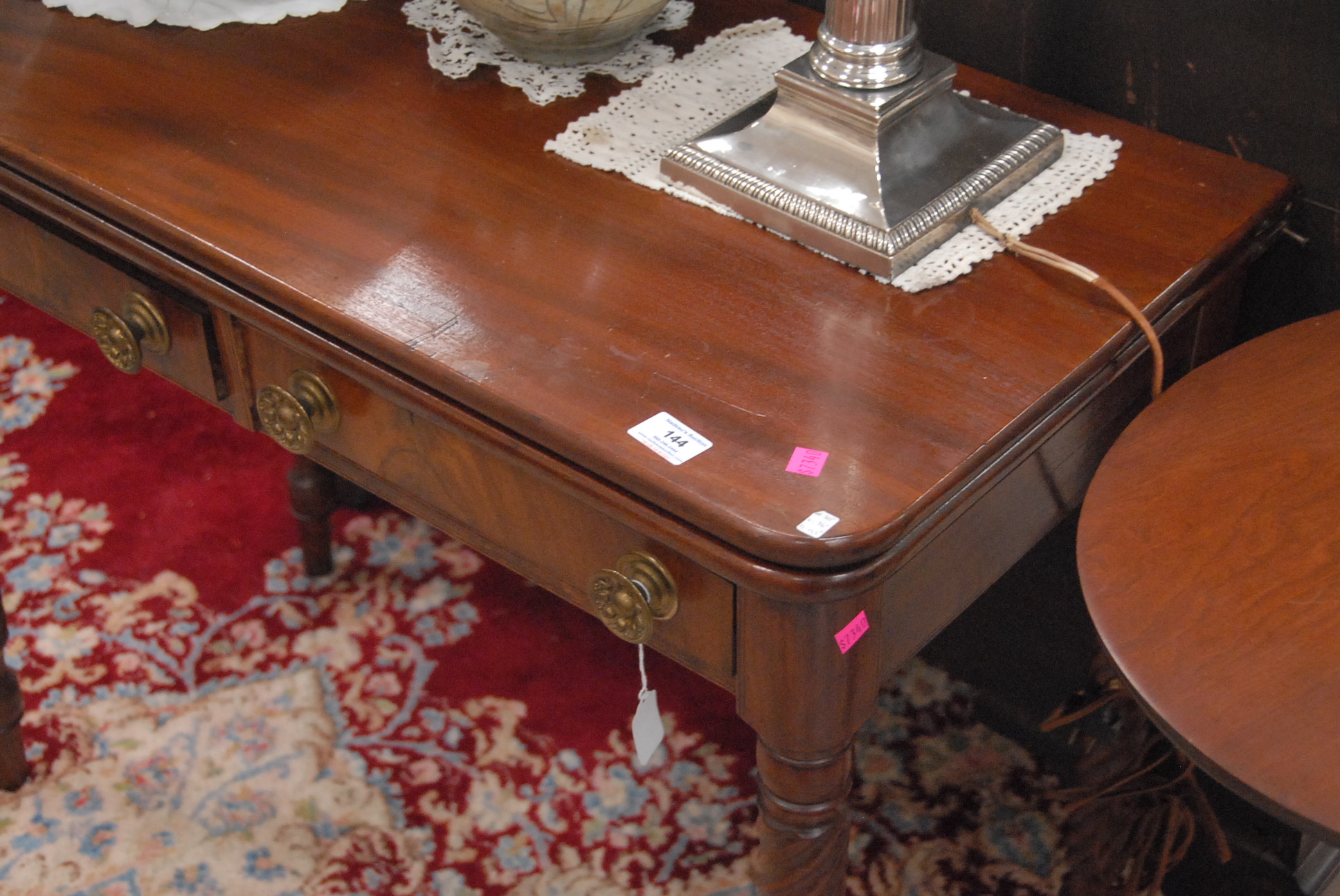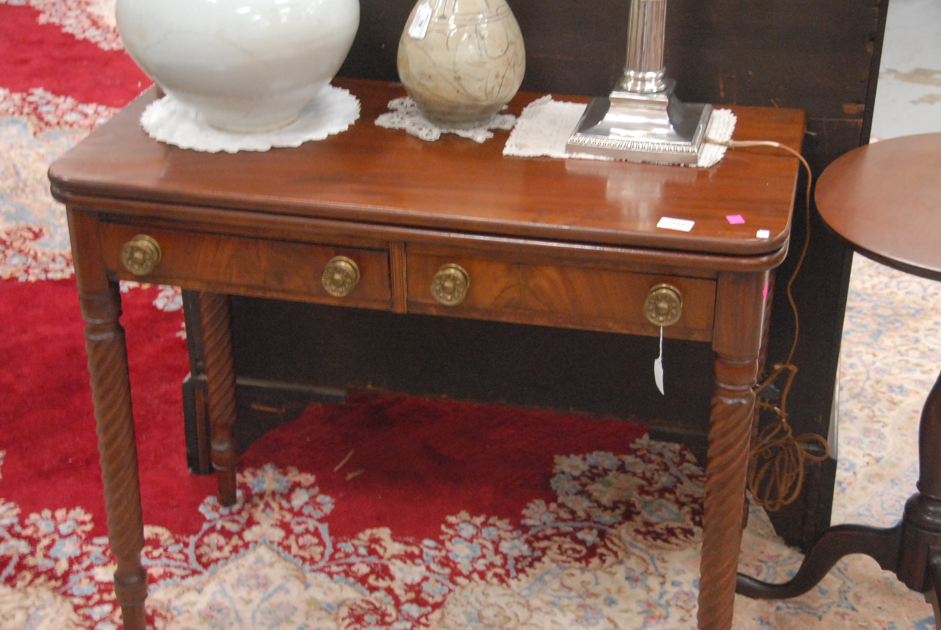 Lot 144: Sheraton mahogany game table with two drawers on spiral turned legs, circa 1830. ht. 30 in. wd. 36 in. dp. 17 1/2 in.