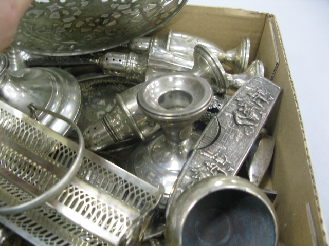 Silver lot to include weighted sterling silver pieces and silver overlay hot plate, salt and pepper shakers, compote, salts, etc.