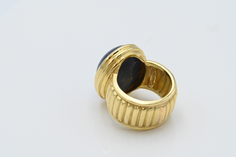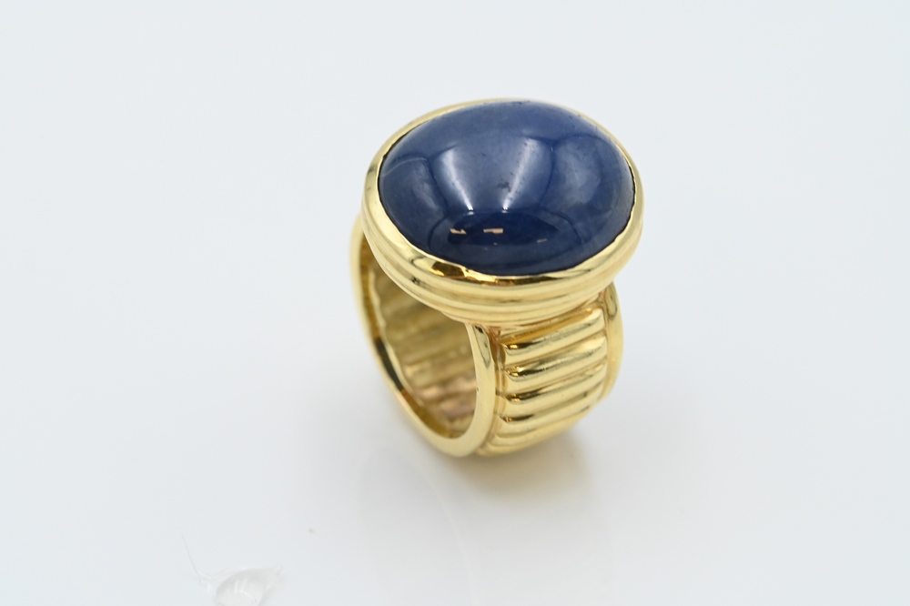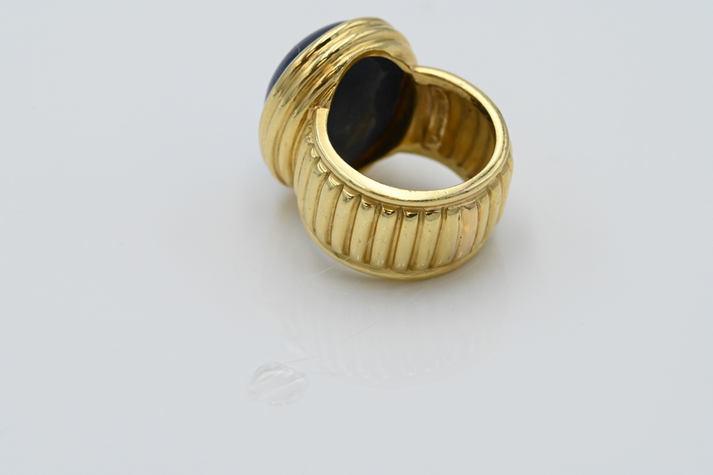 Lot 144: Tambetti 18 Karat Yellow Gold Ring, set with large oval sapphire?, size 7, 17 x 19.6 millimeters, 22 grams total weight.