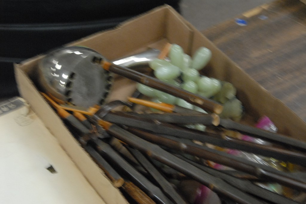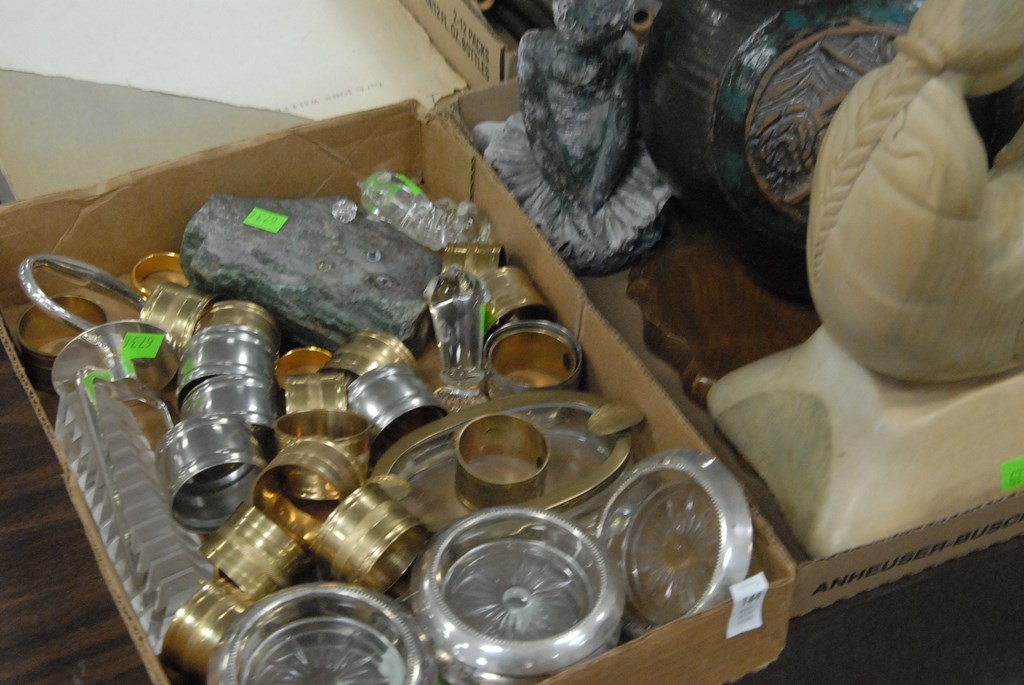 Lot 144: Three box lots: stoneware vase, figures, napkin rings, silver trimmed coasters, alabaster grapes.