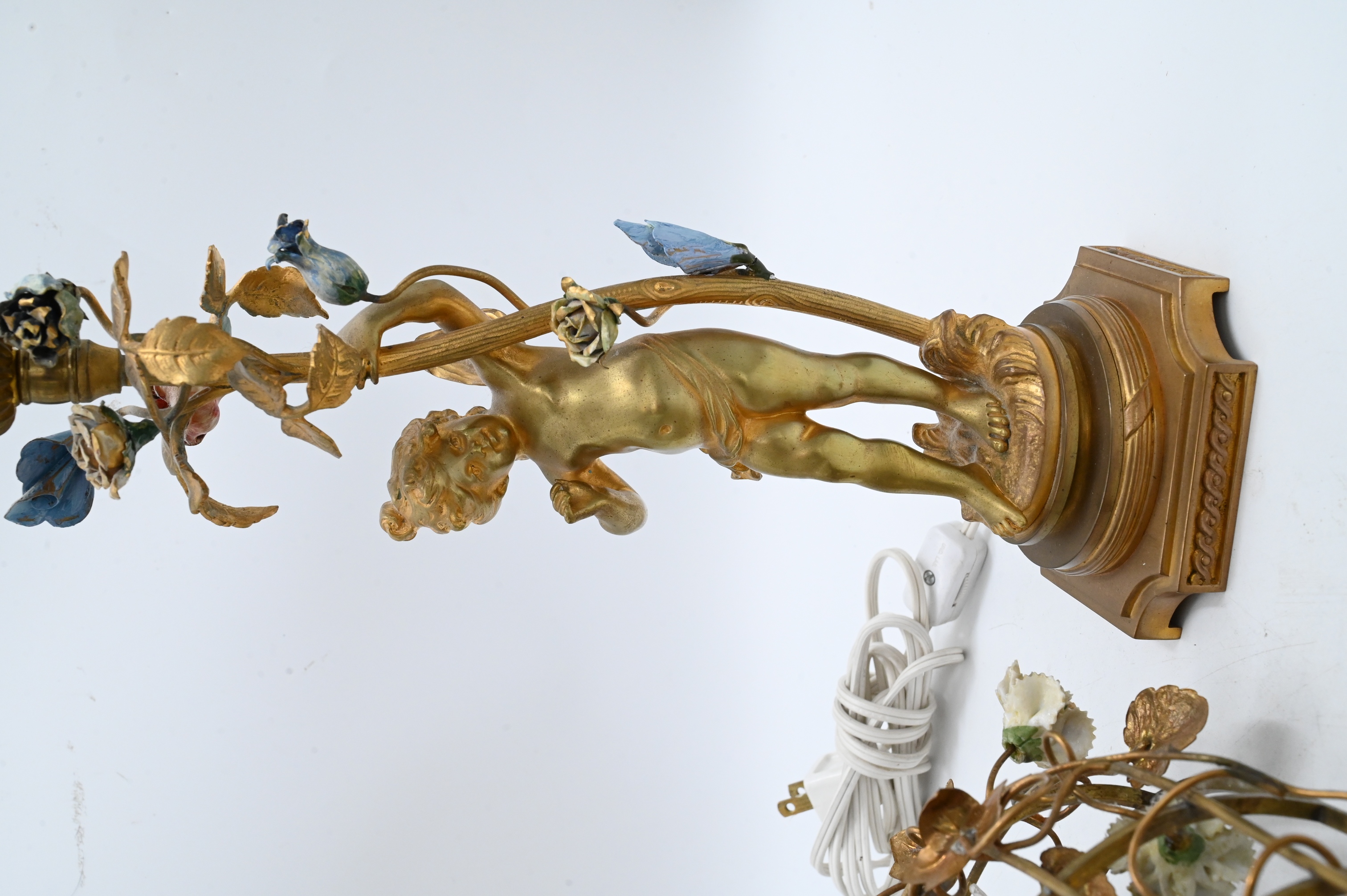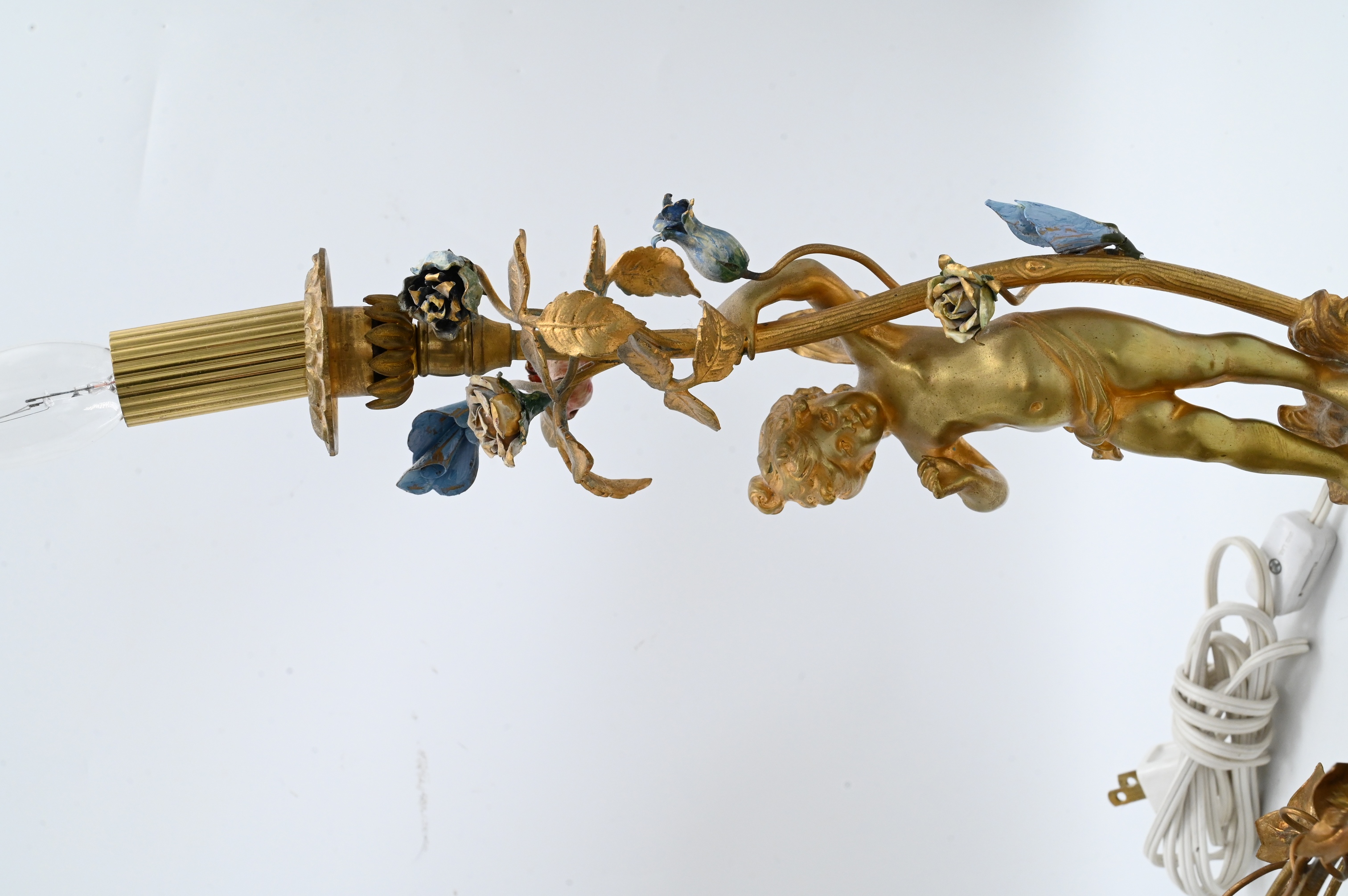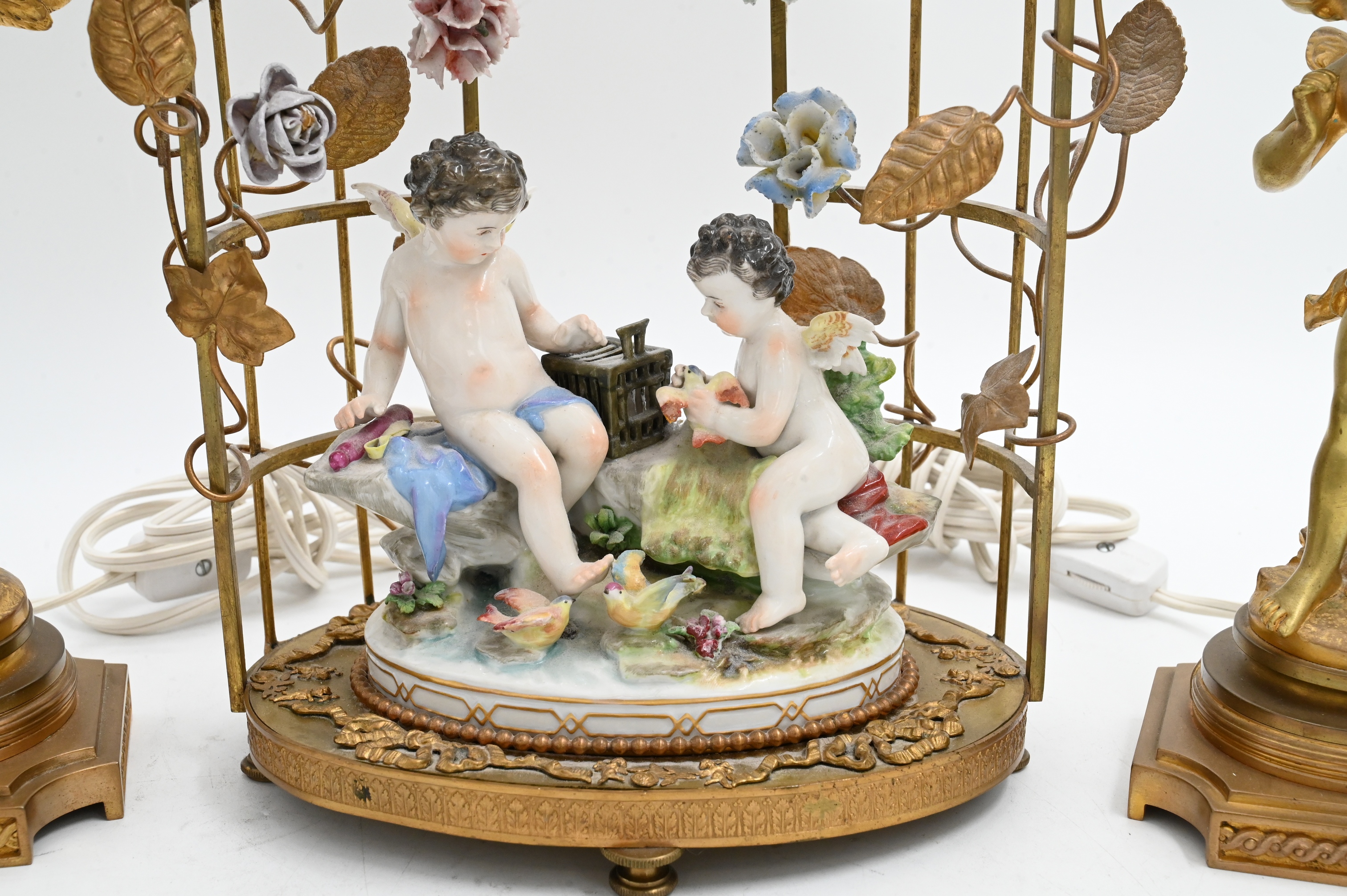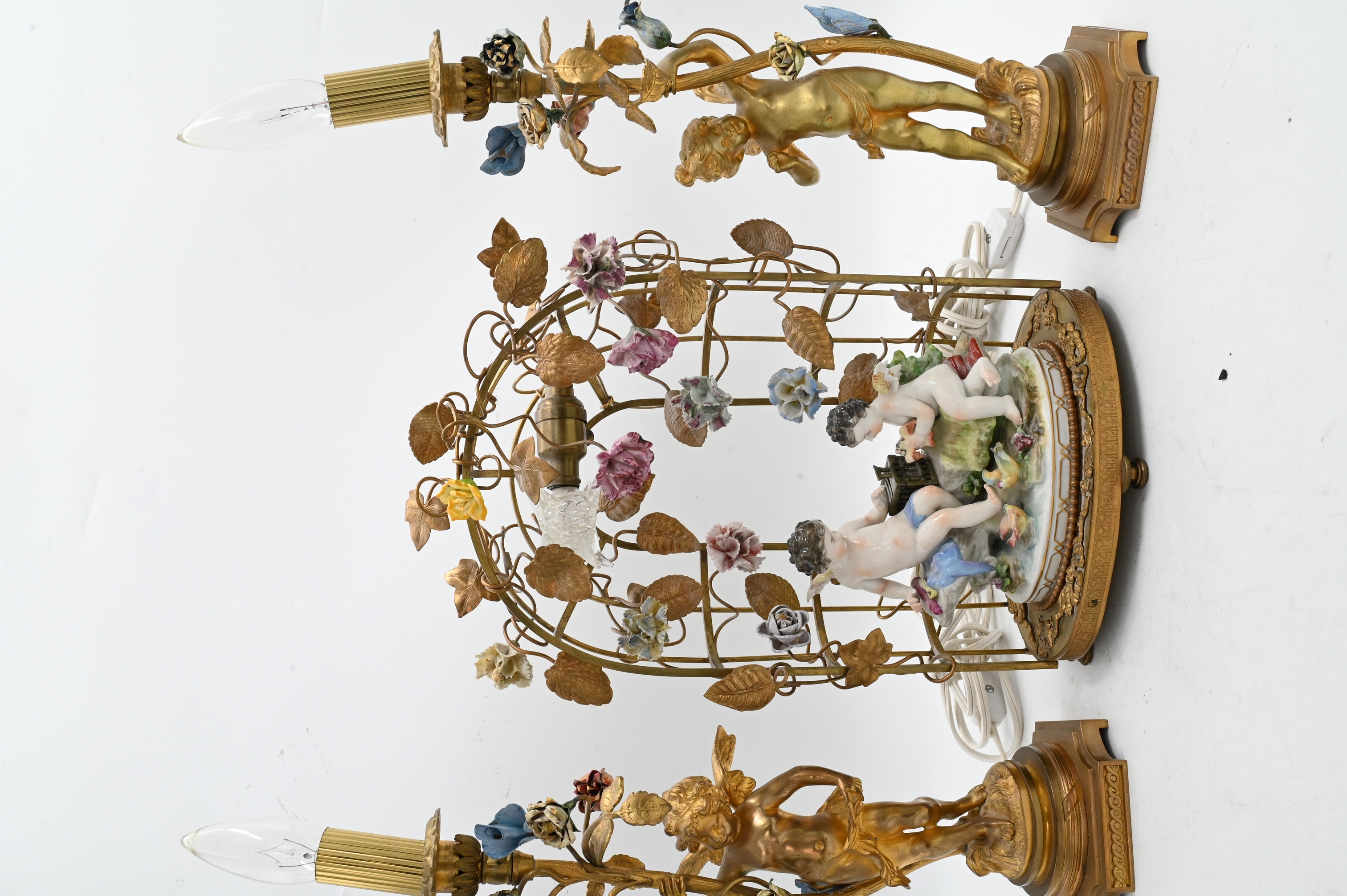 to include Meissen porcelain figural group depicting two cherubs or putti putting a bird in a wooden cage surrounded in gilt metal open arbor cartouche with scrolling vines and roses, along with a pair of gilt bronze candelabras now wired as lamps in working condition one of which having putti and the other having a fairy holding a flowering stem leading to now electrified lights