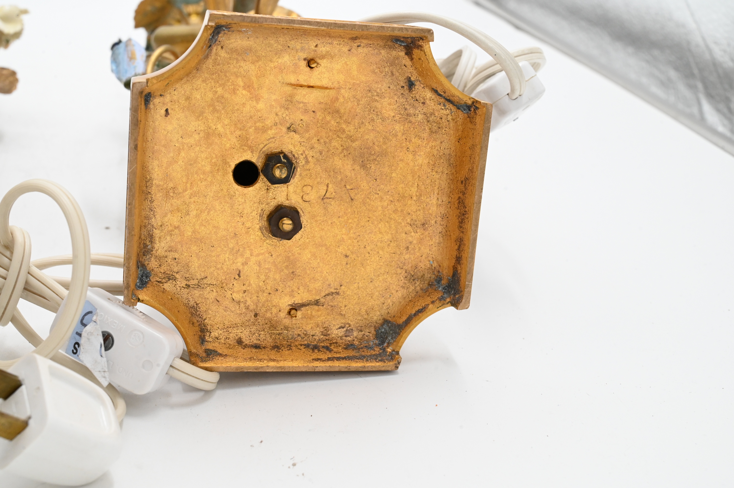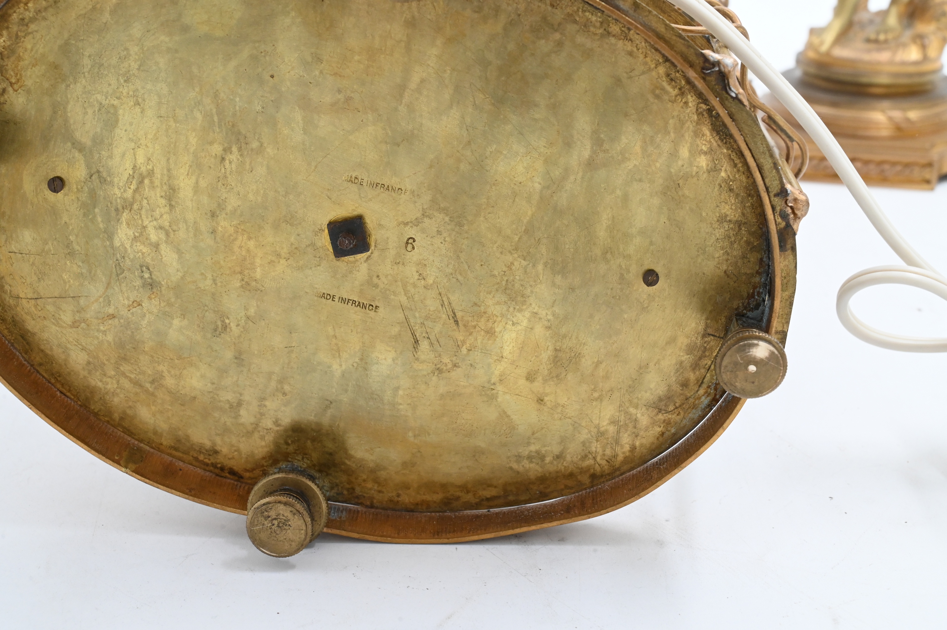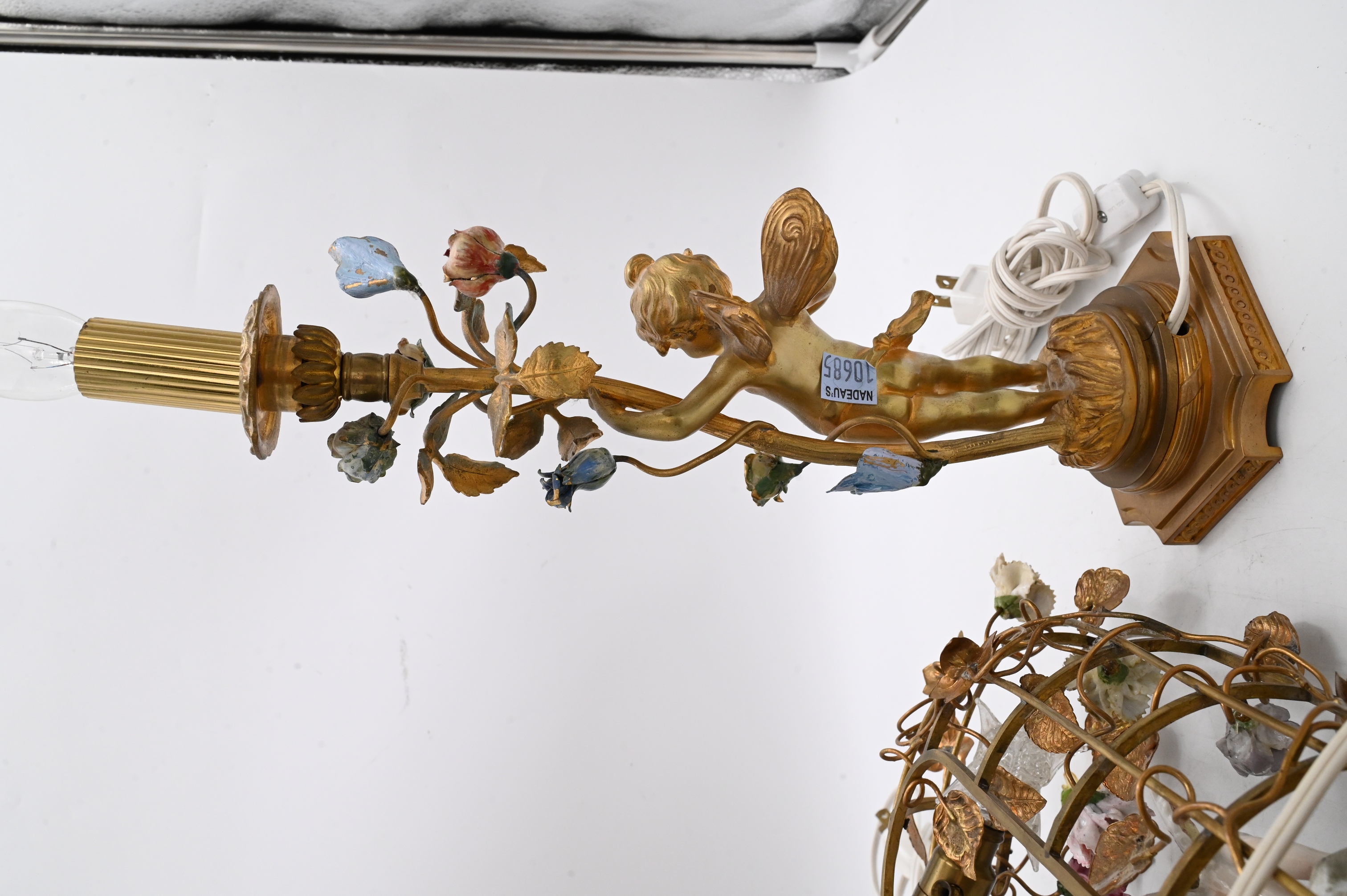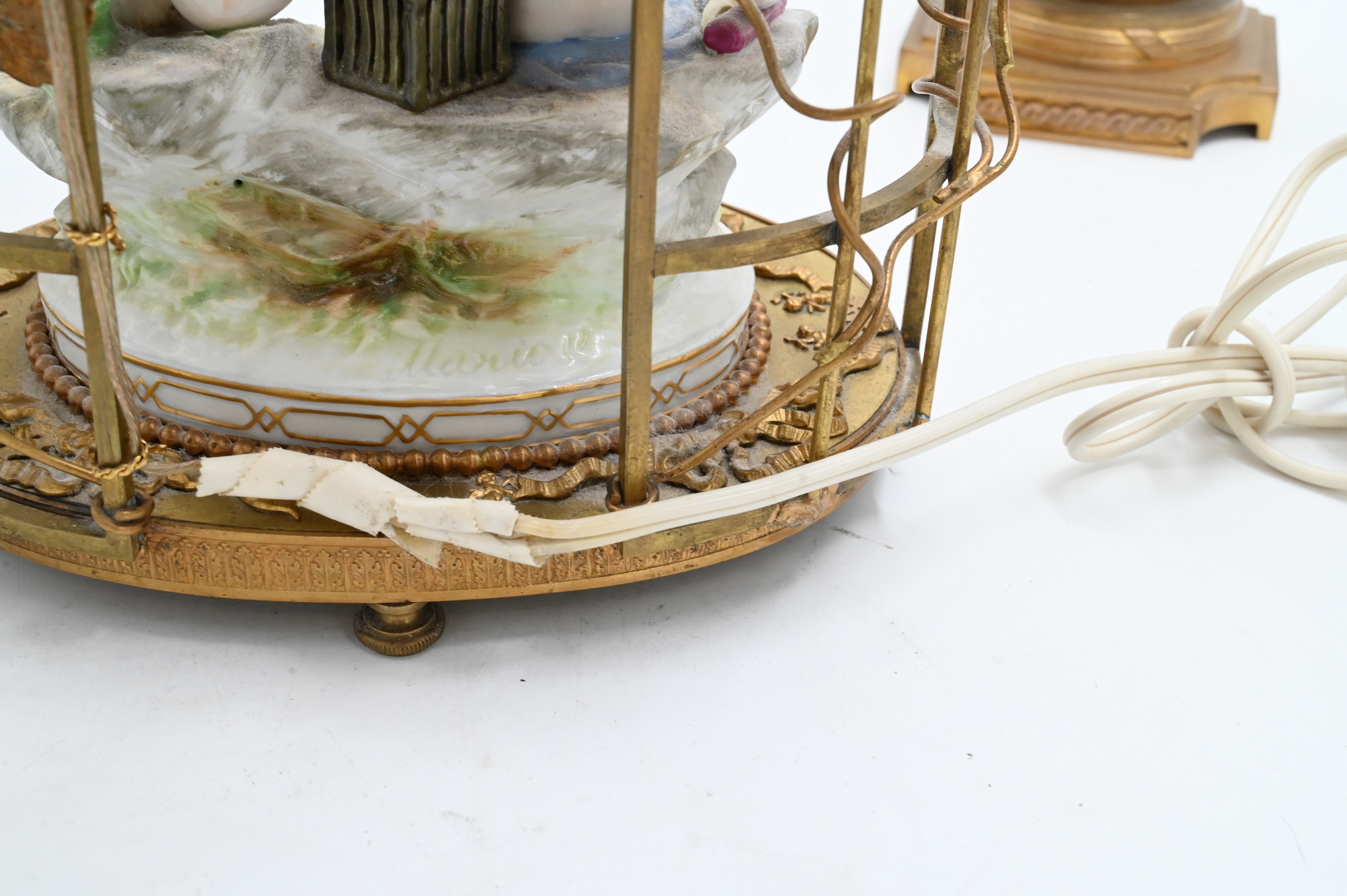 to include Meissen porcelain figural group depicting two cherubs or putti putting a bird in a wooden cage surrounded in gilt metal open arbor cartouche with scrolling vines and roses, along with a pair of gilt bronze candelabras now wired as lamps in working condition one of which having putti and the other having a fairy holding a flowering stem leading to now electrified lights