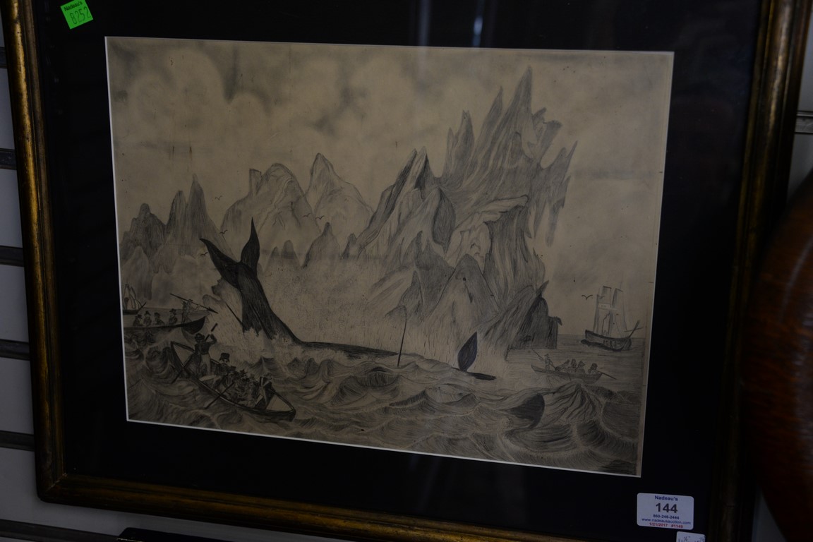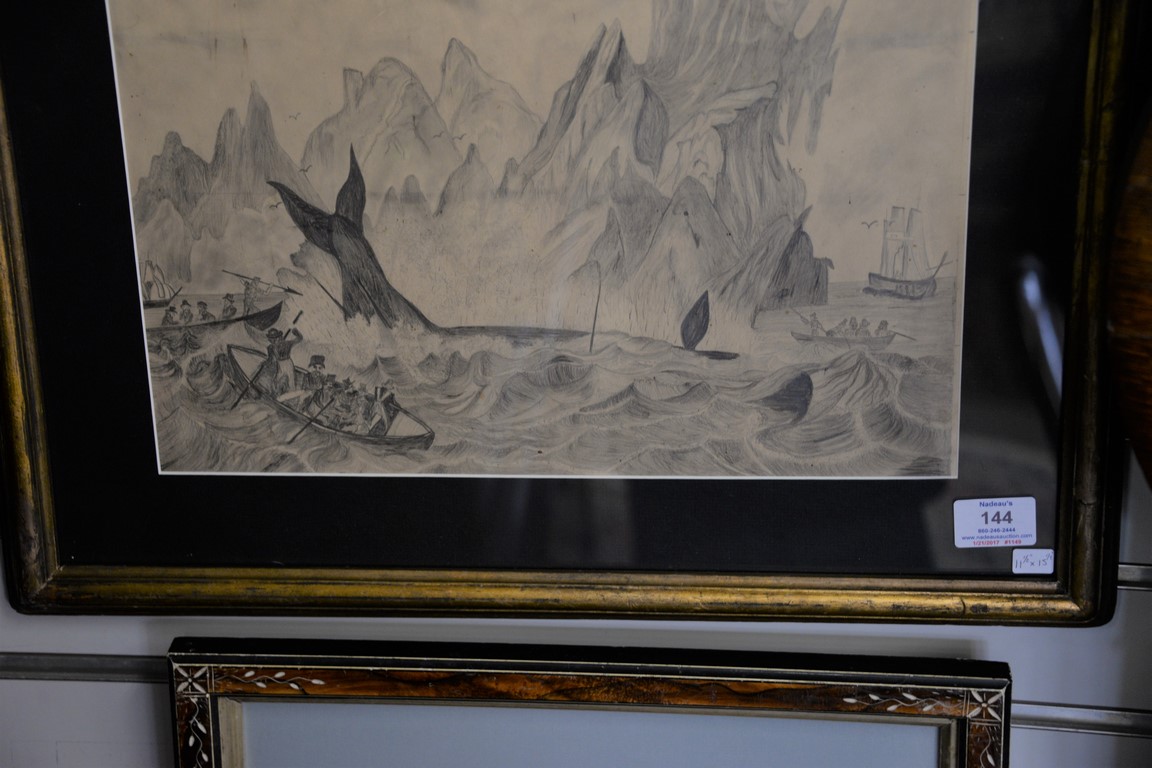 Lot 144: Two Folk Art drawings including a pencil drawing harpooning a whale and a watercolor of cavalry officer on horseback, sight size 6 1…