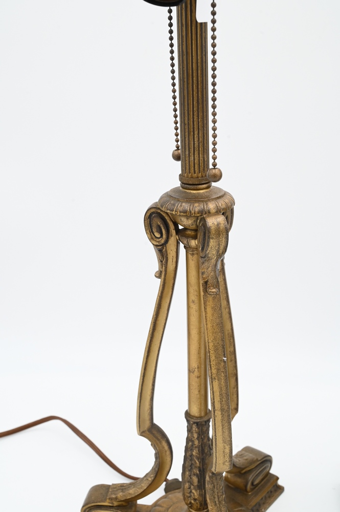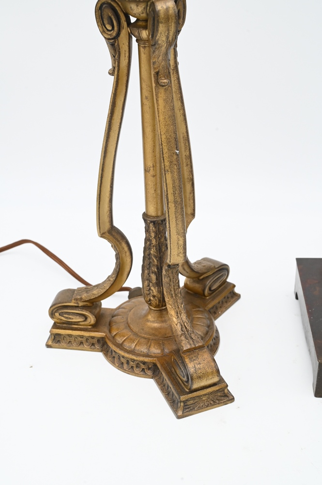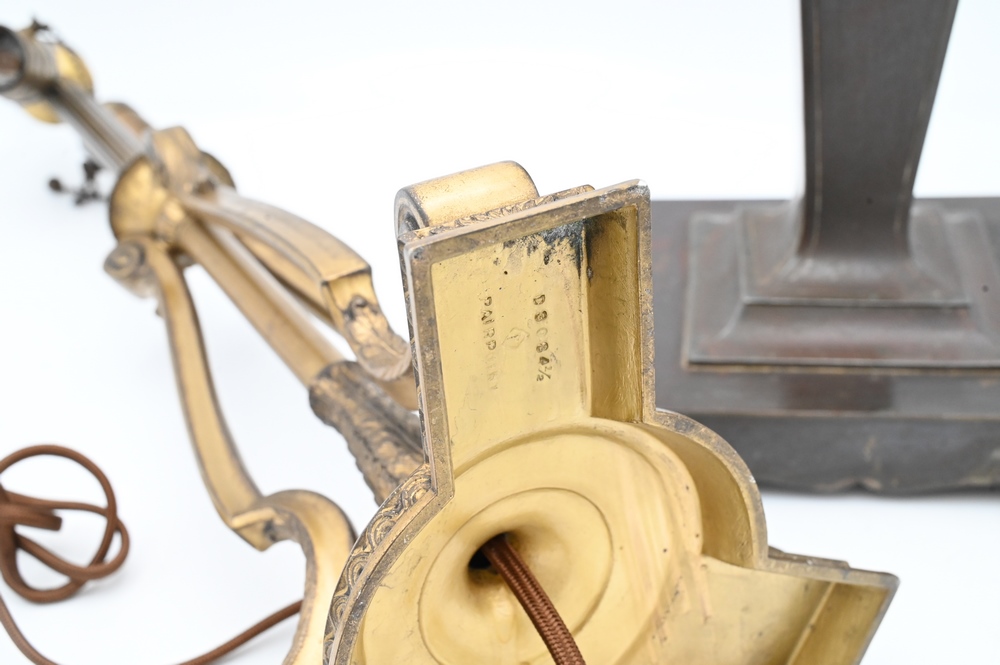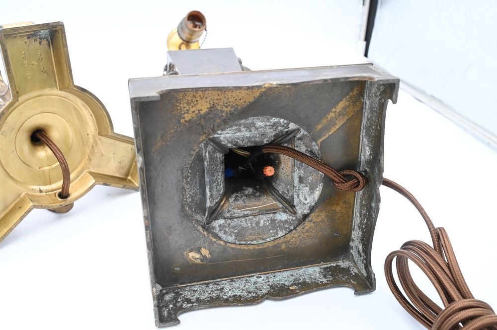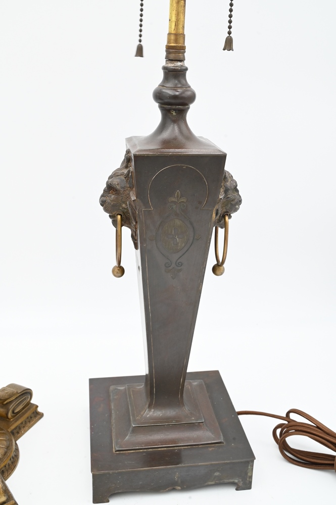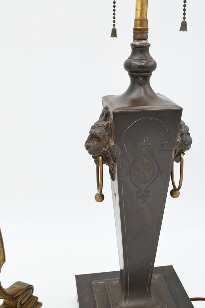 Two Pairpoint Table Lamp Bases, one having square shaft having lion heads, height 24 1/2 inches.