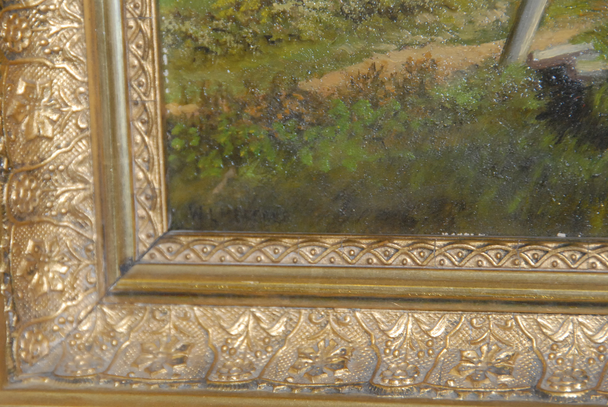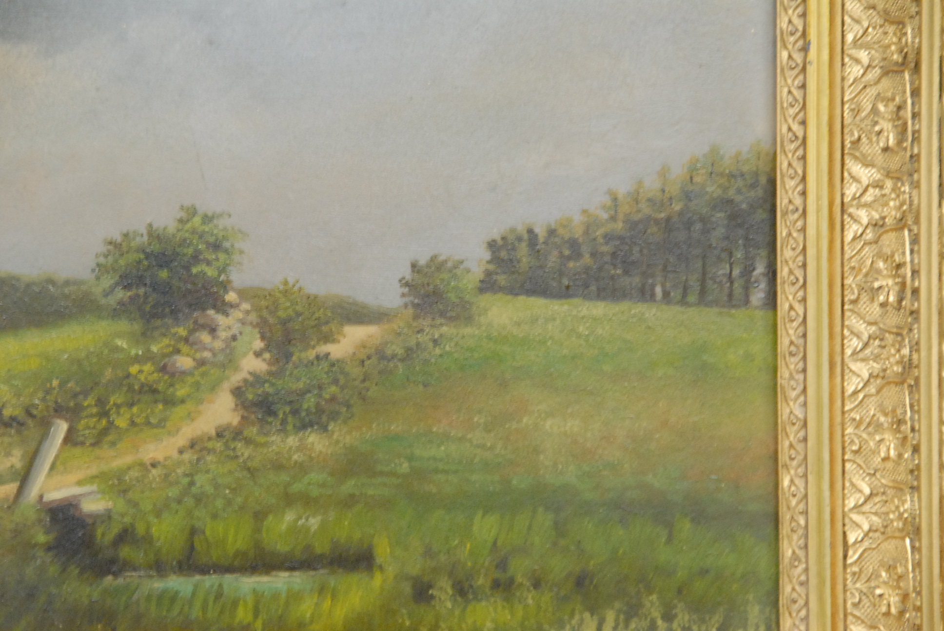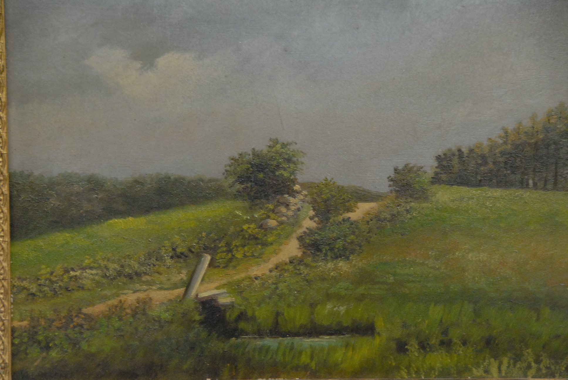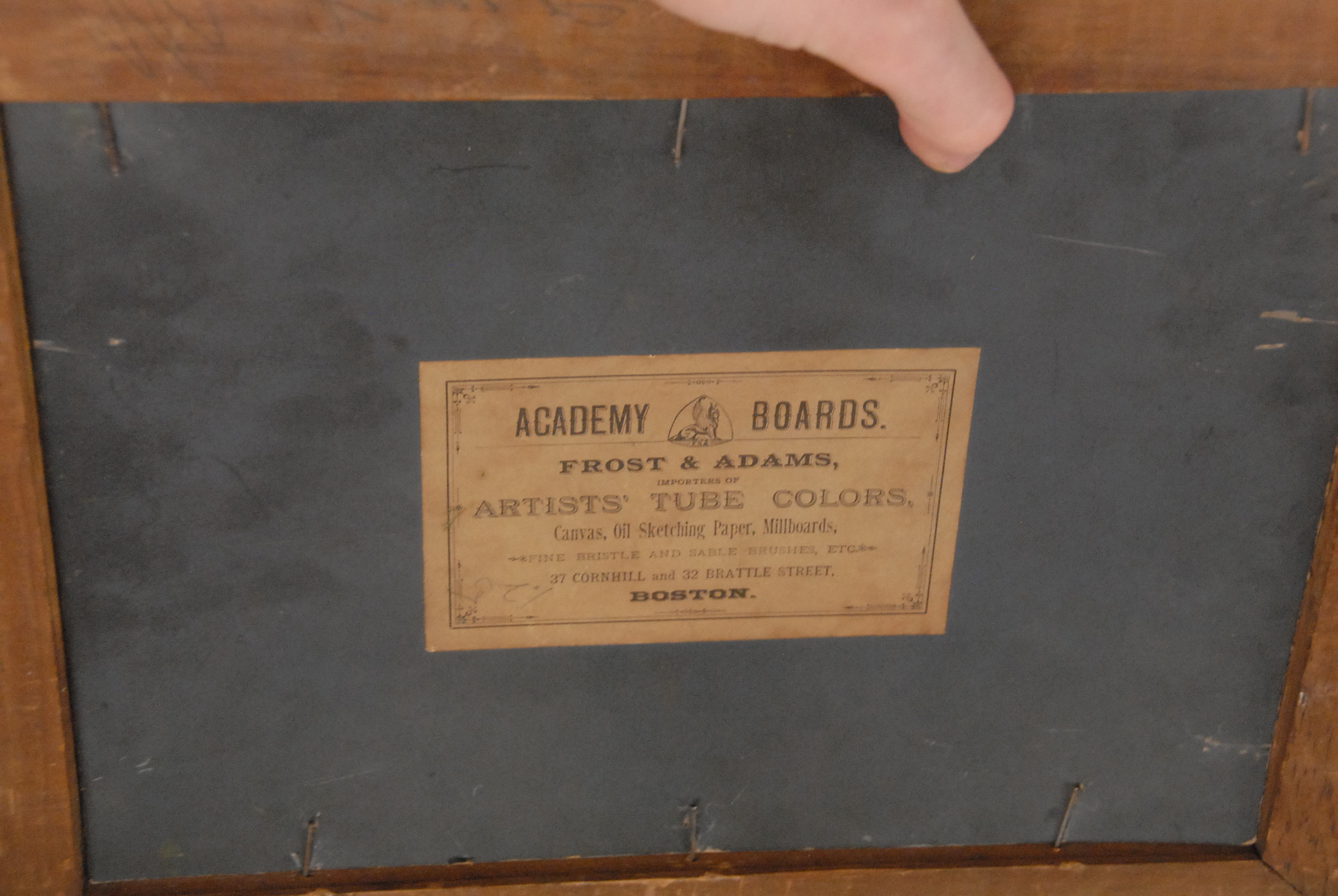 Willard Leroy Metcalf 1858-1925 dark sky landscape, oil on board, signed lower left W. L. Metcalf, has an Academy Boards paper label.