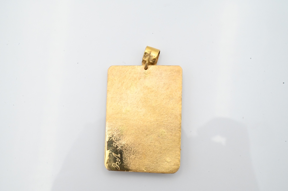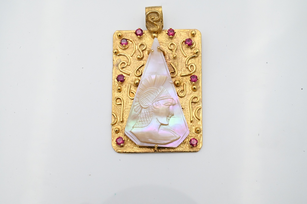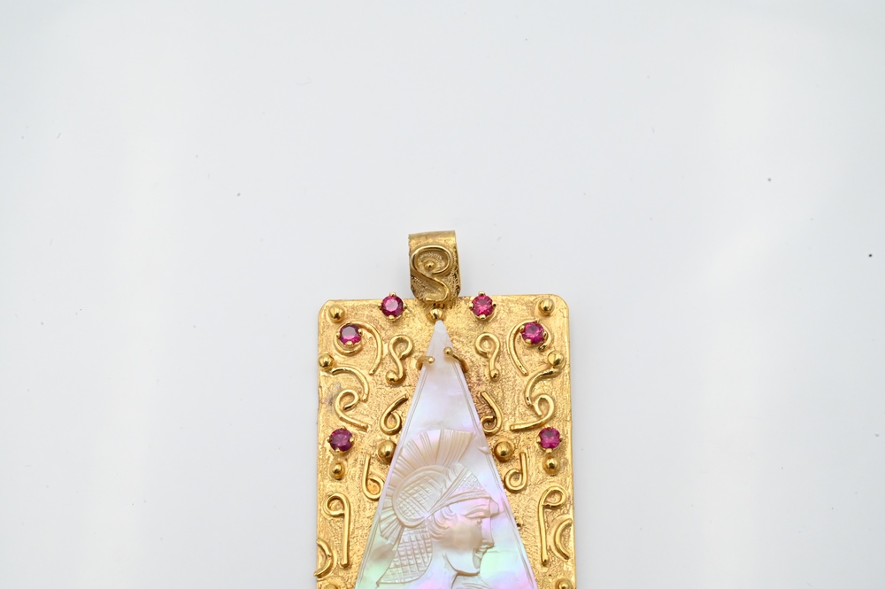 14 Karat Gold Pendant, having mother of pearl center and eight red stones, 22.3 grams, signed V.C.