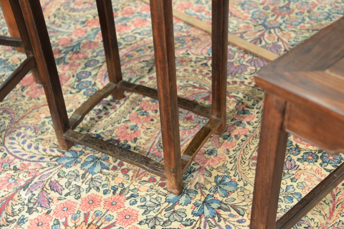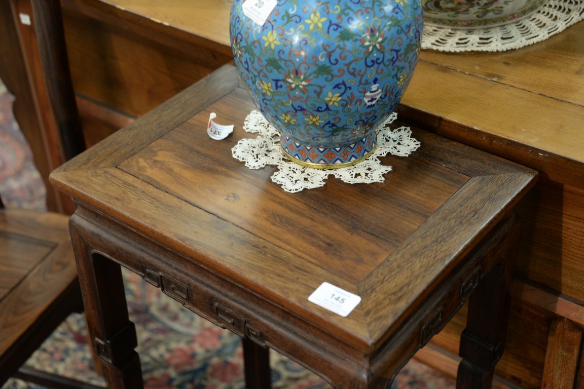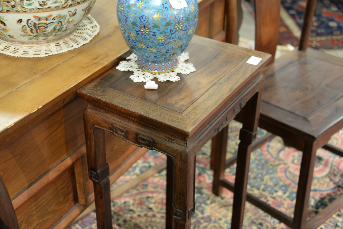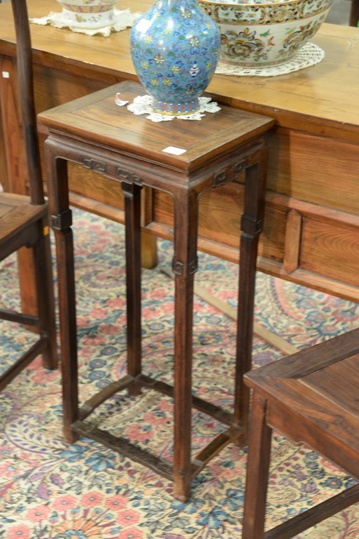 Lot 145: Chinese hardwood tall stand with carved frieze and stretcher base, hongmu,18th – 19th century or earlier.