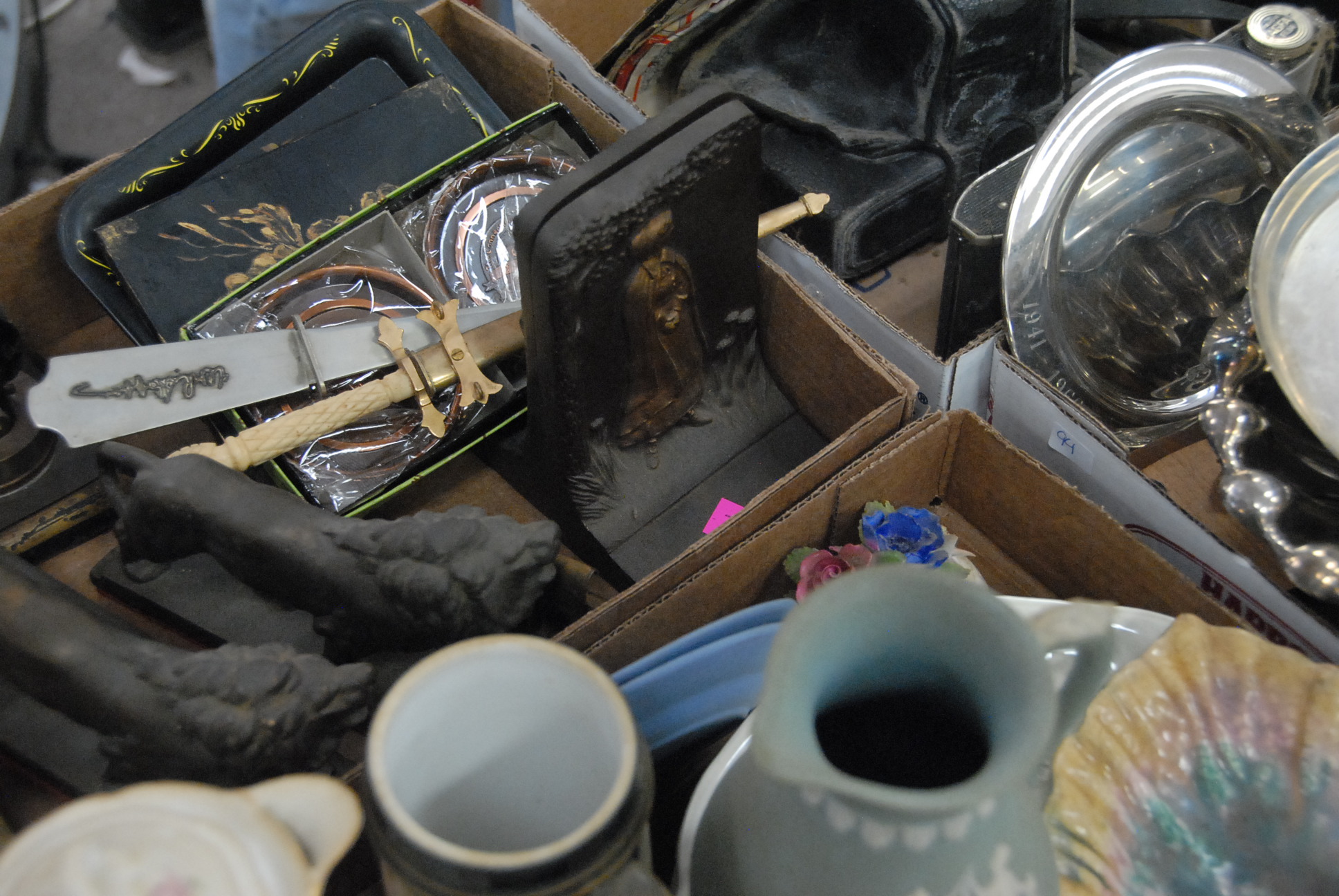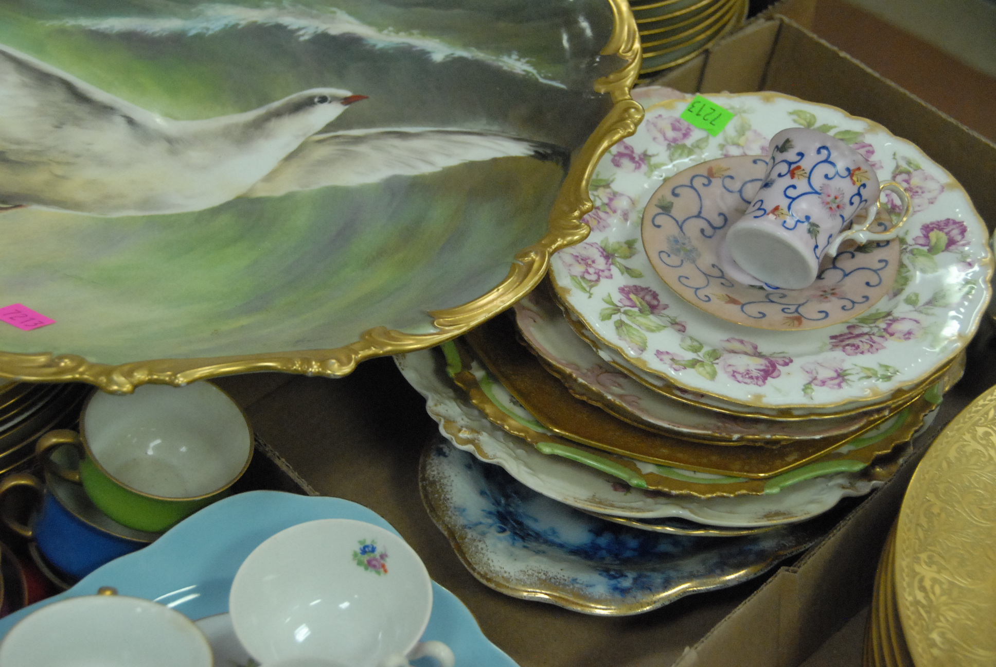 Lot 145: Eight box lots of china to include hand painted charger, silver plate, Bradley and Hubbard bookends and hand painted china.