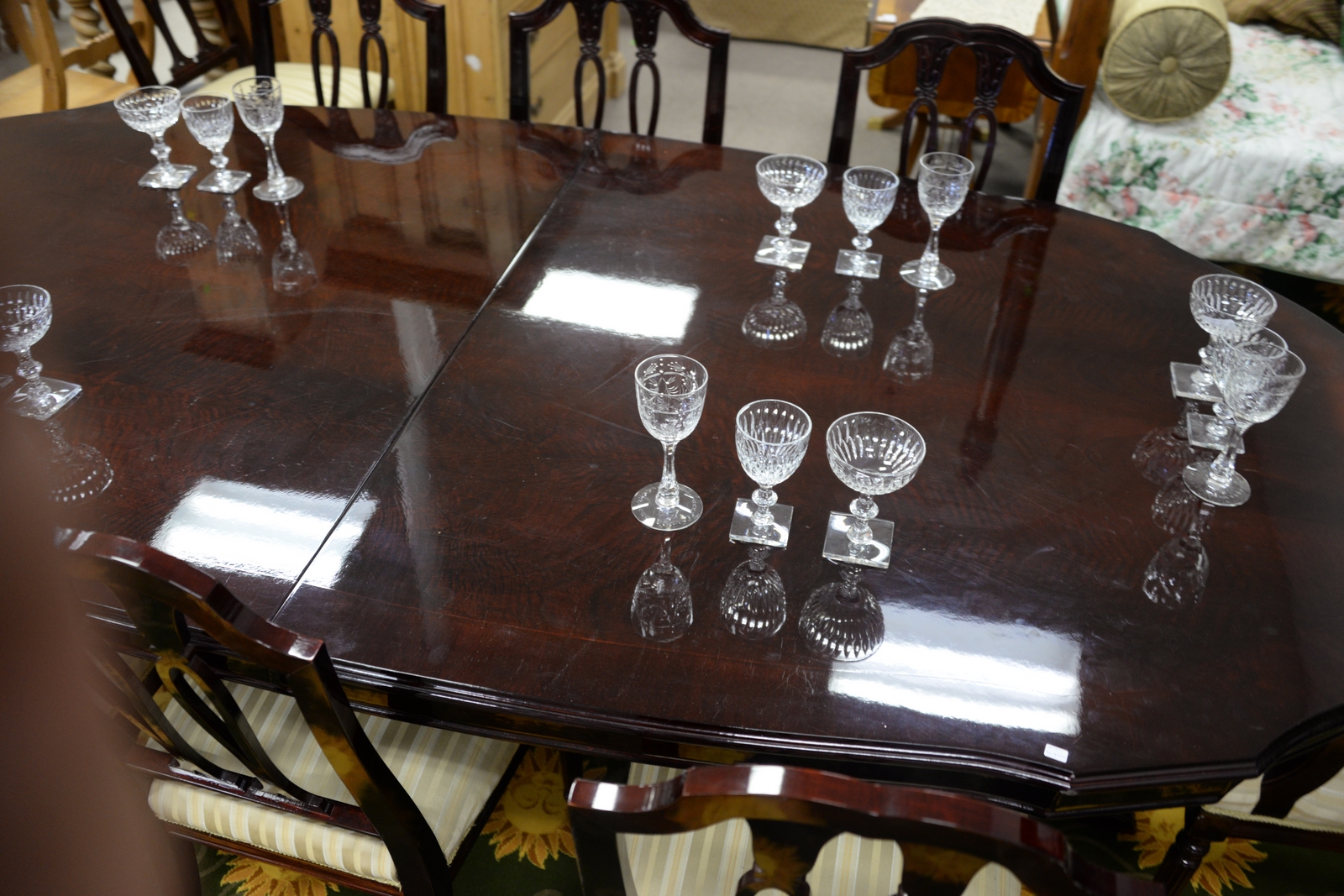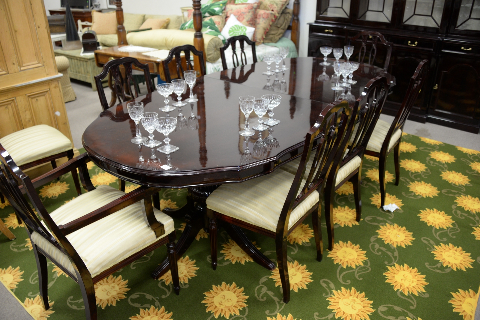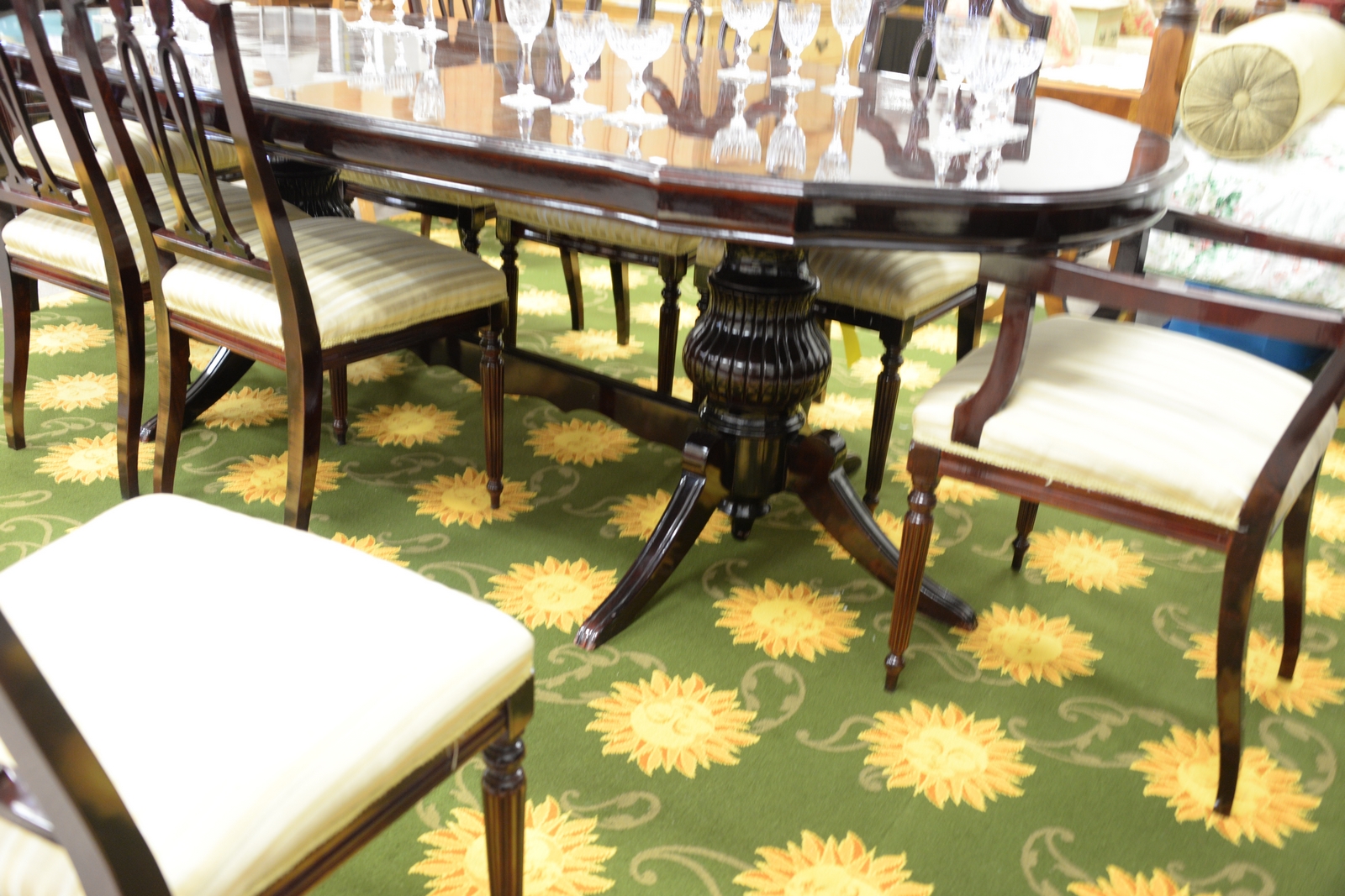 Eleven piece set including contemporary shaped table and ten chairs in high gloss finish. ht. 31in., lg. 94in., wd. 47in.