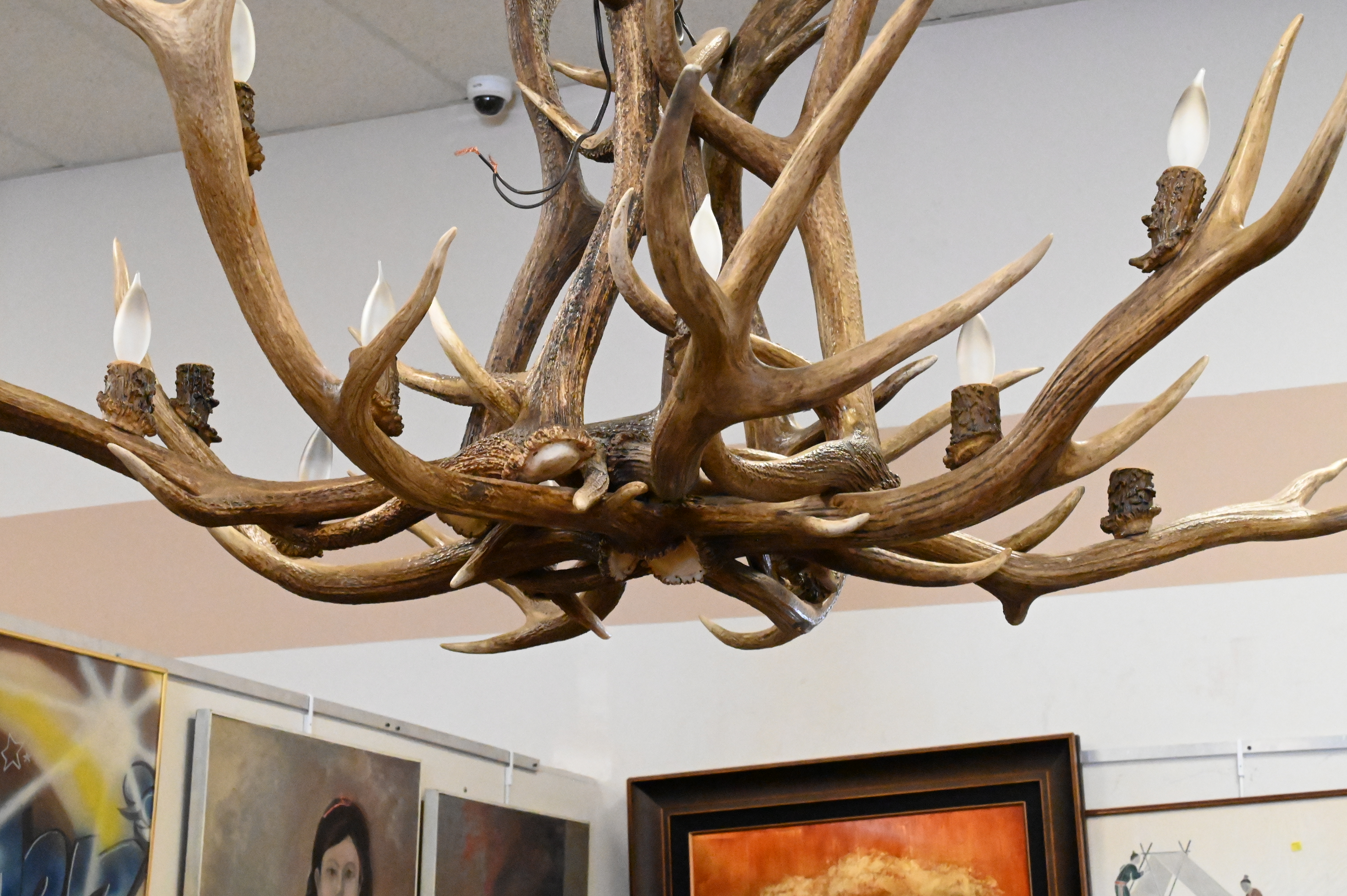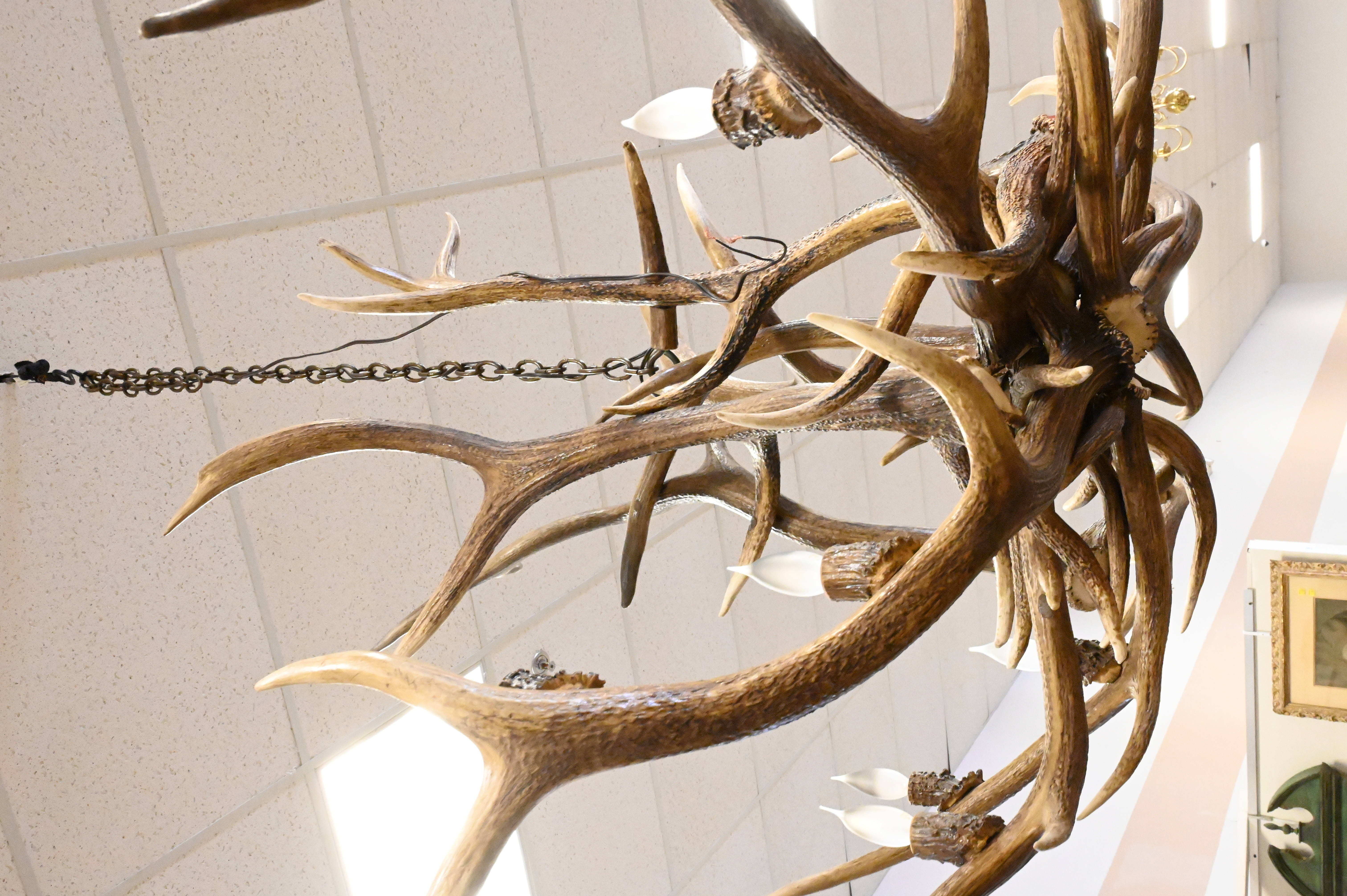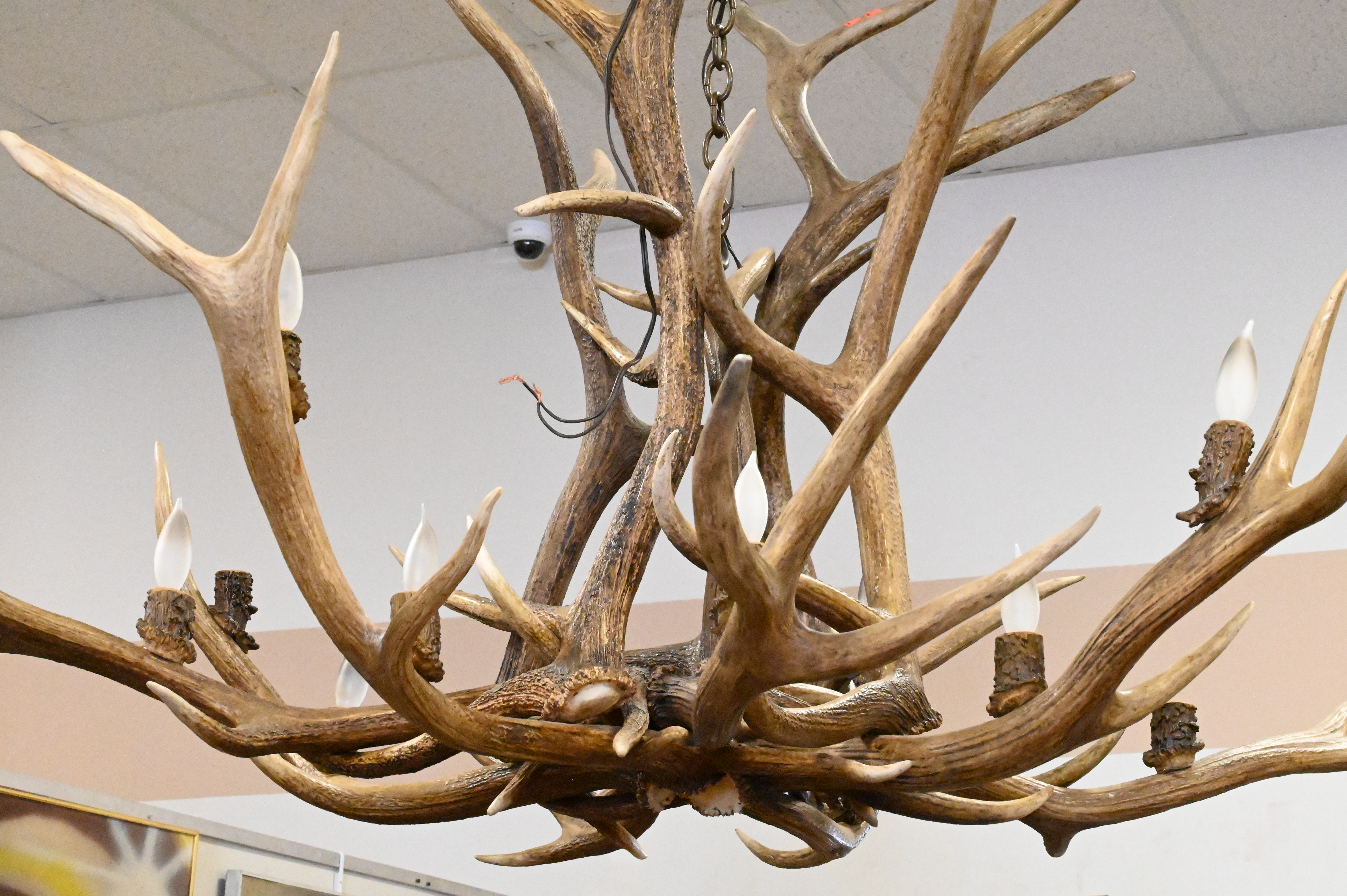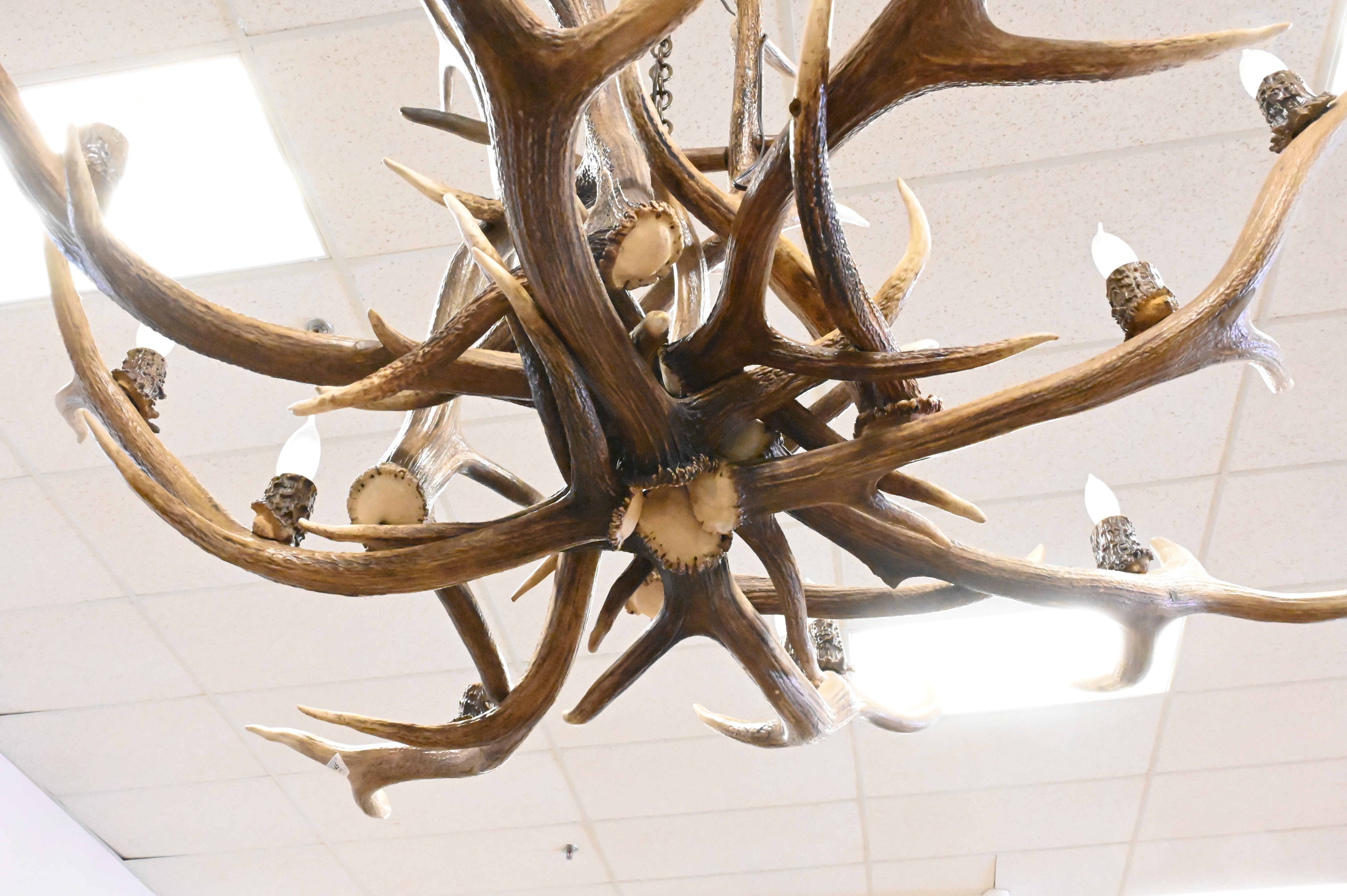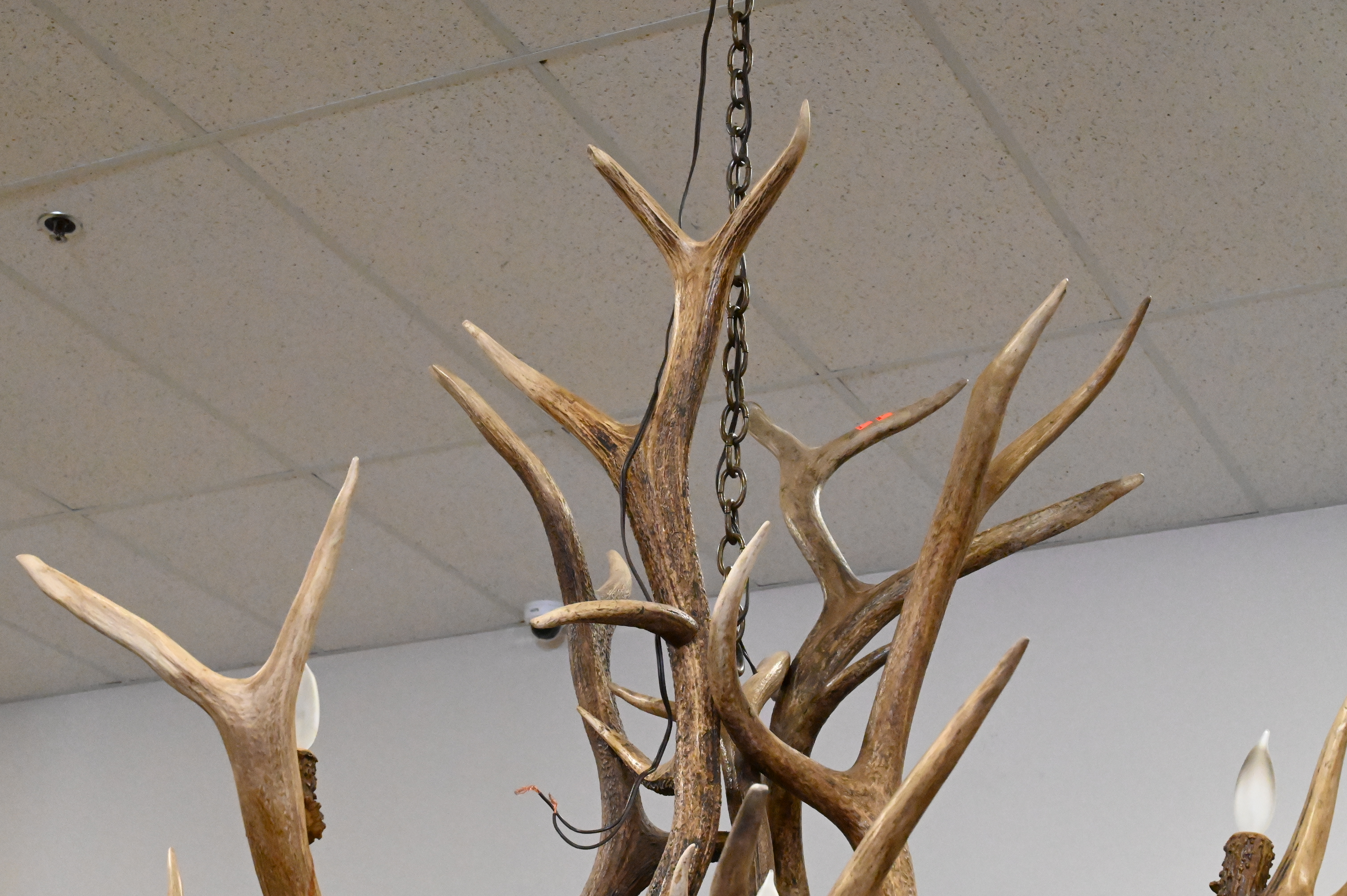 Faux Antler 12 Light Chandelier, in need of 2 light bulbs, height approx 35 inches, diameter approx 55 inches.