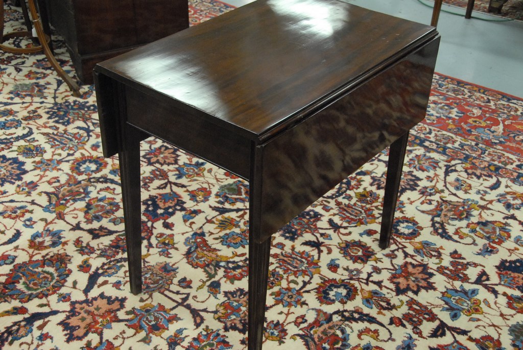 Lot 145: Federal mahogany table with rectangular drop leaves and one drawer set on molded square tapered legs. ht. 28 3/4in. wd. 19in. lg. …