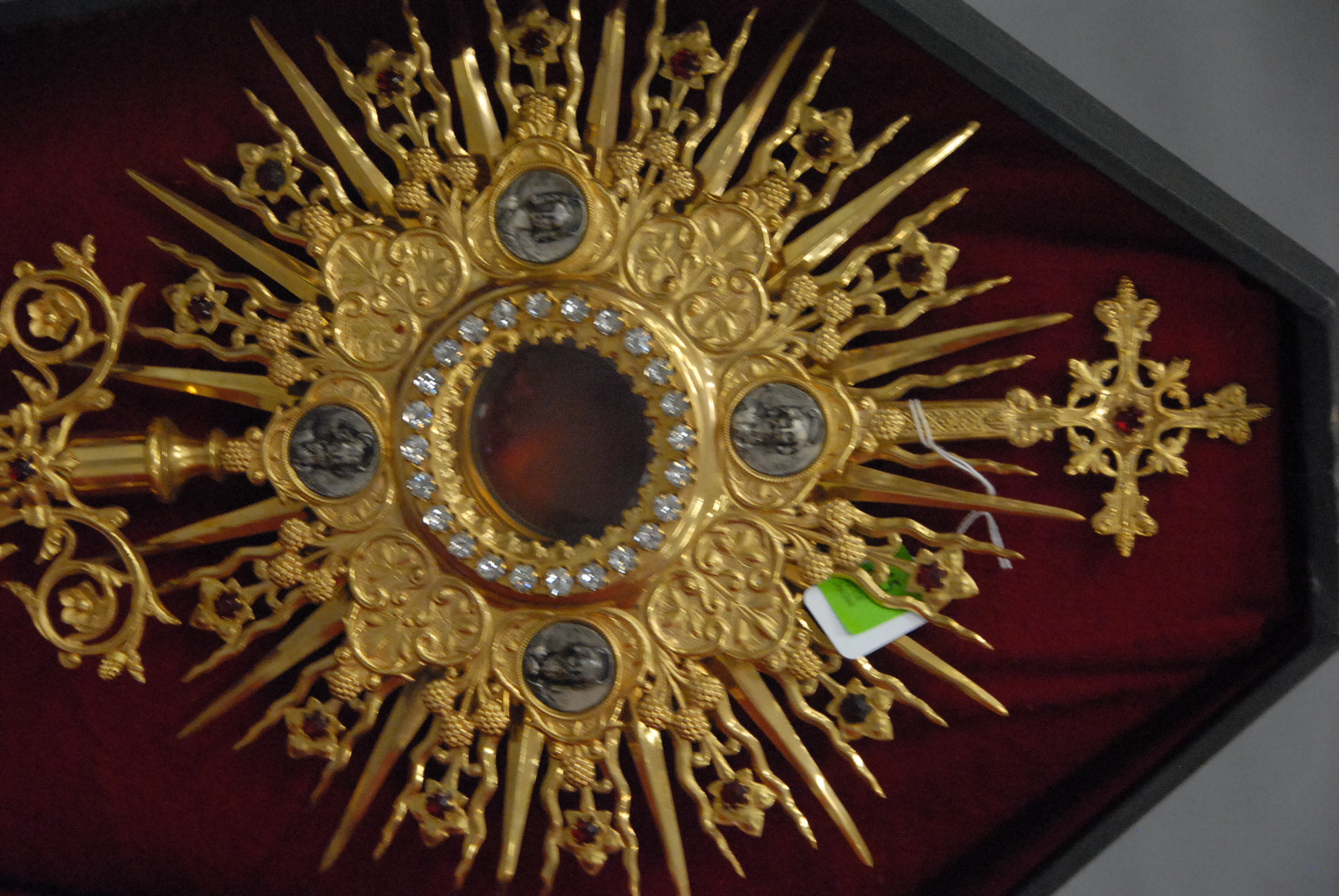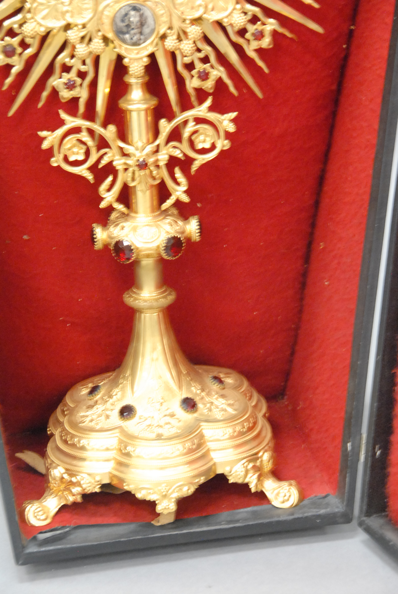 Gilt metal religious mirror mounted with stones and silver masks, in original case.