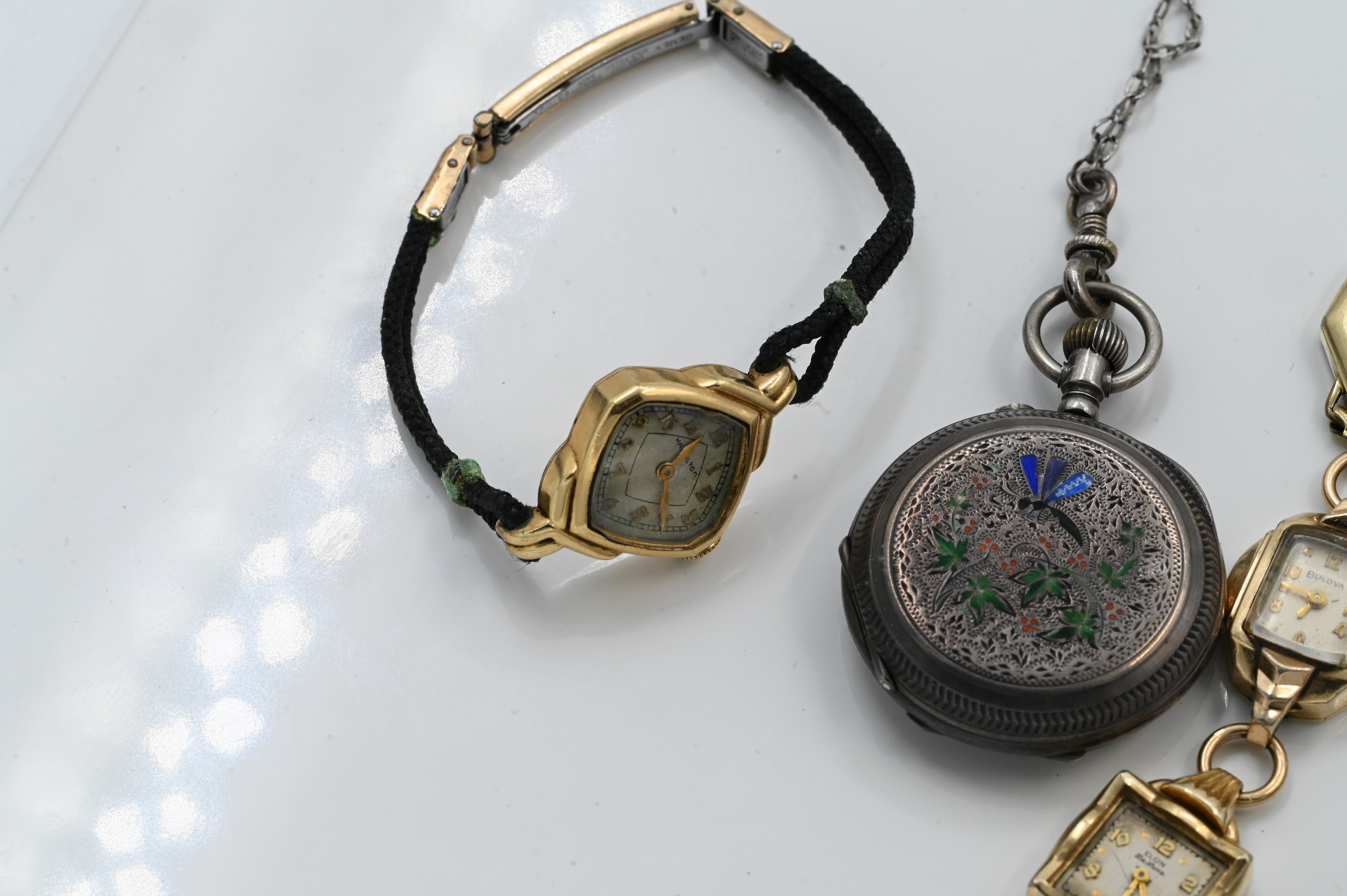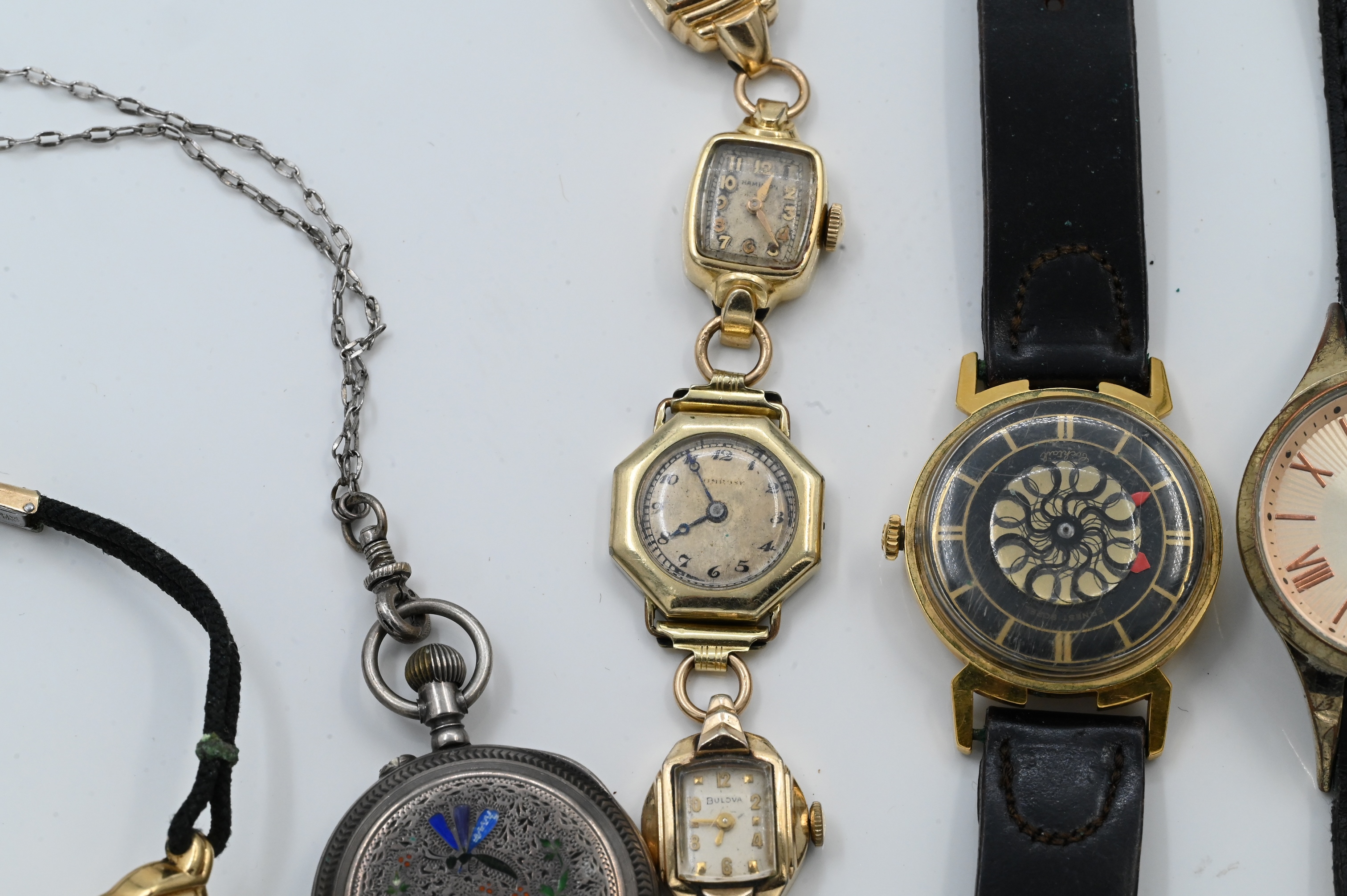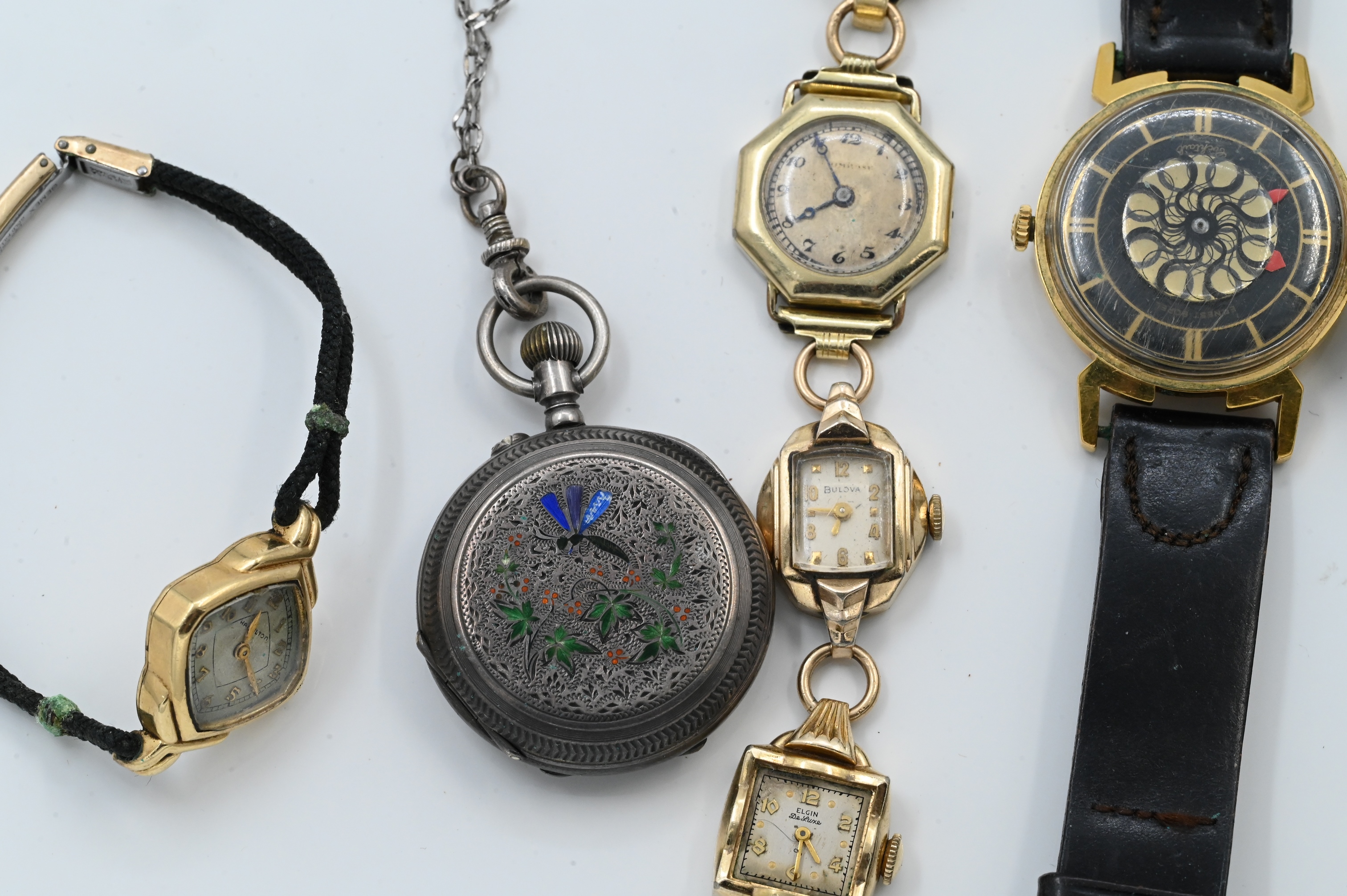 to include Ernest Barrel cocktail, silver and enamel pocket watch, several ladies watches, etc